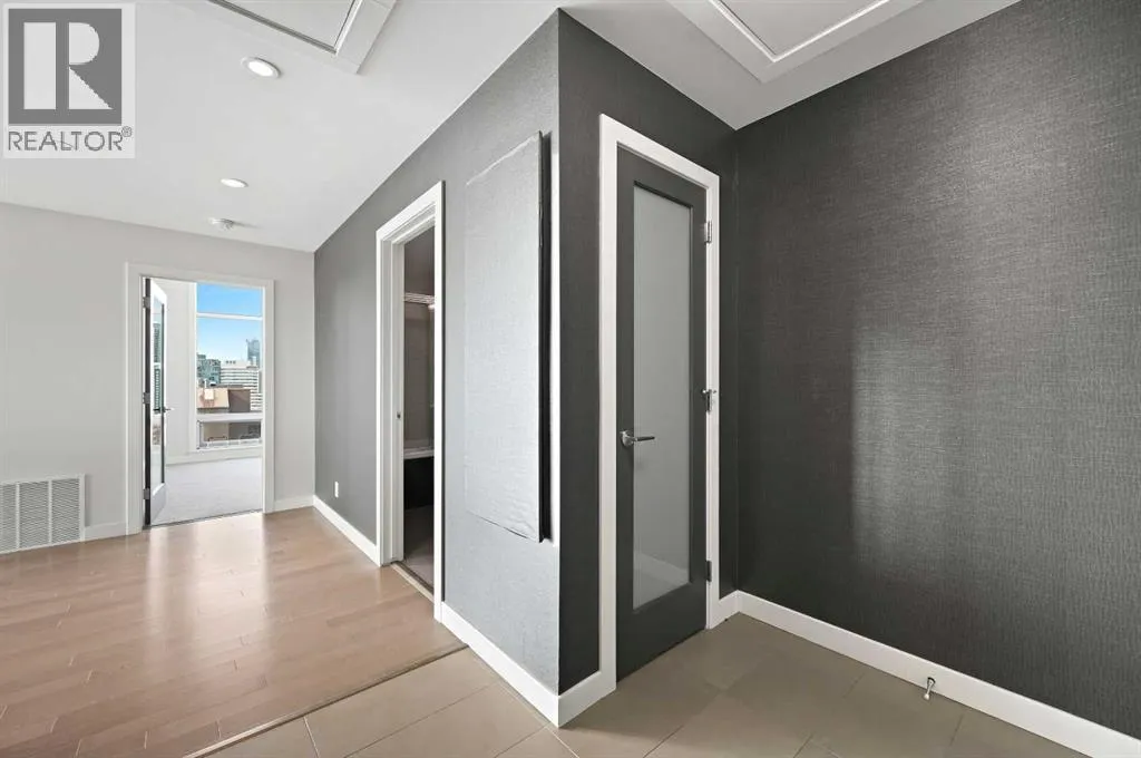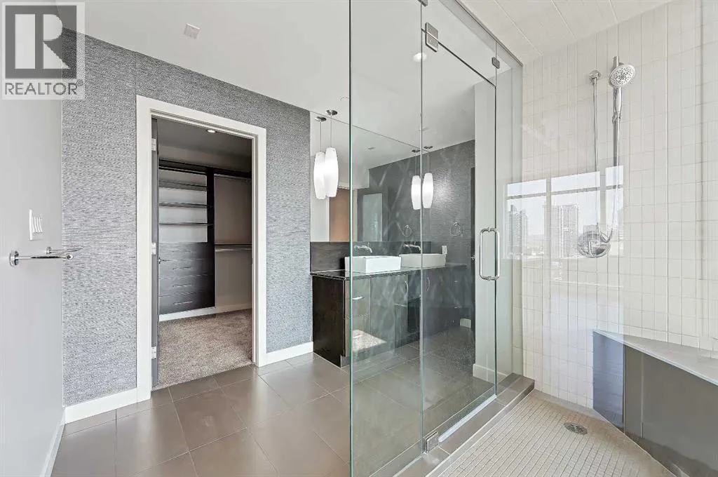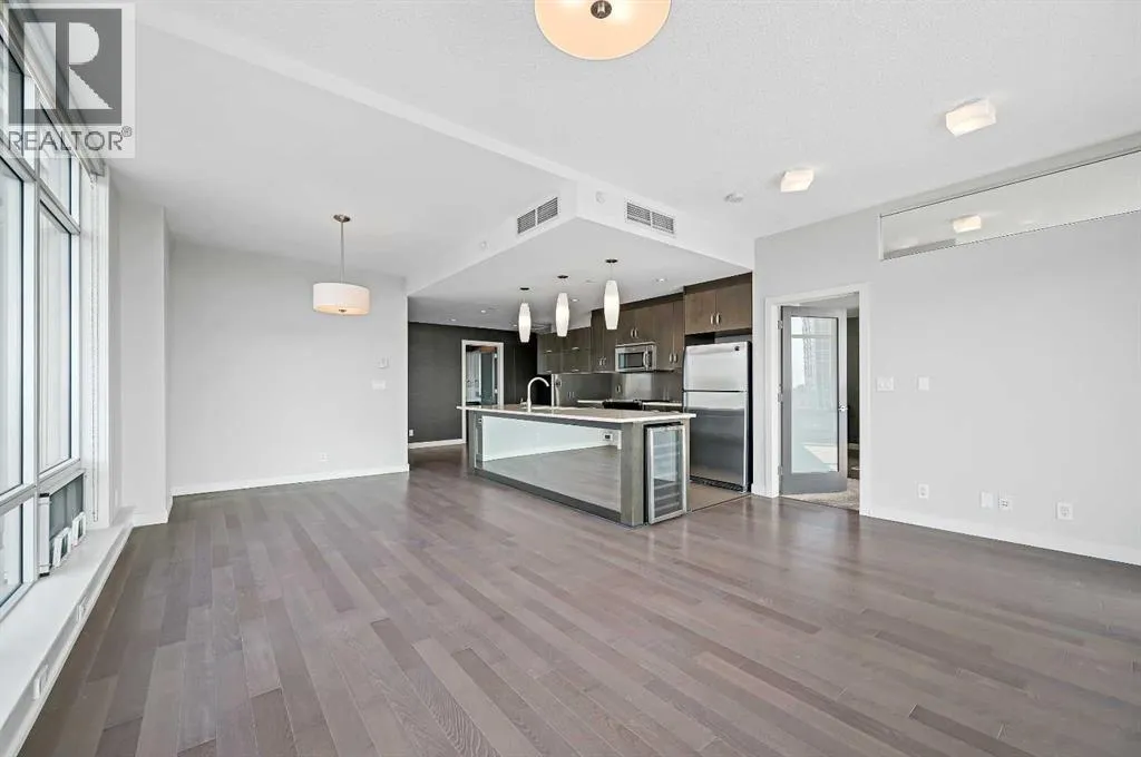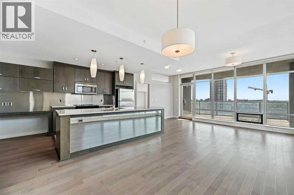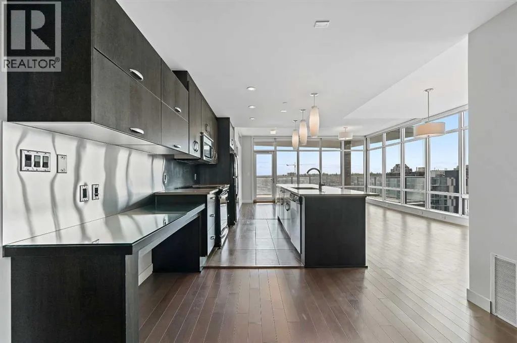 Experience elevated urban living in this extra-spacious two-bedroom, two-bathroom corner suite perched on the 14th floor of the prestigious Castello building. Wrapped in floor-to-ceiling windows, this home is flooded with natural light and showcases sweeping views of Calgaryâs vibrant Beltline and downtown skyline. The thoughtfully designed layout separates the dual bedrooms, ensuring privacy while keeping the open-concept living, dining, and kitchen areas bright and connected. The primary retreat is a true sanctuaryâfeaturing a 5-piece ensuite with an oversized glass-and-tile shower, double vanity, separate water closet, and a generous walk-in closet with custom built-ins. The spacious second bedroom features double closets and is conveniently located next to a stylish 4-piece bathroom, ideal for guests or family members. Freshly painted and beautifully finished, this suite boasts hardwood flooring, stone counters throughout, a new electric stove, a beverage fridge, custom wall coverings, and a convenient telephone desk. Enjoy the convenience of double side-by-side underground parking stalls and a separate storage locker. Step outside onto the expansive 17x24 ft balcony with a gas BBQ hookupâyour private outdoor oasis with west-facing views, ideal for entertaining or unwinding. Castello offers residents an array of amenities including a large fitness studio, social room, guest suite, visitor parking, concierge service, and a stunning lobby that sets the tone from the moment you enter. Perfectly situated in the heart of the Beltline, youâll love the easy access to 17th Avenue, Mission District, Memorial Park Library, BMO Centre, Stampede Grounds, shops, cafes, and the downtown coreâall within walking distance. Professionally managed by Equium, with availability for May move-in. This is city living at its finestâdonât miss your opportunity to call the Castello home. (id:27476)