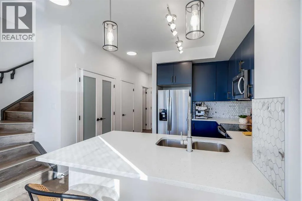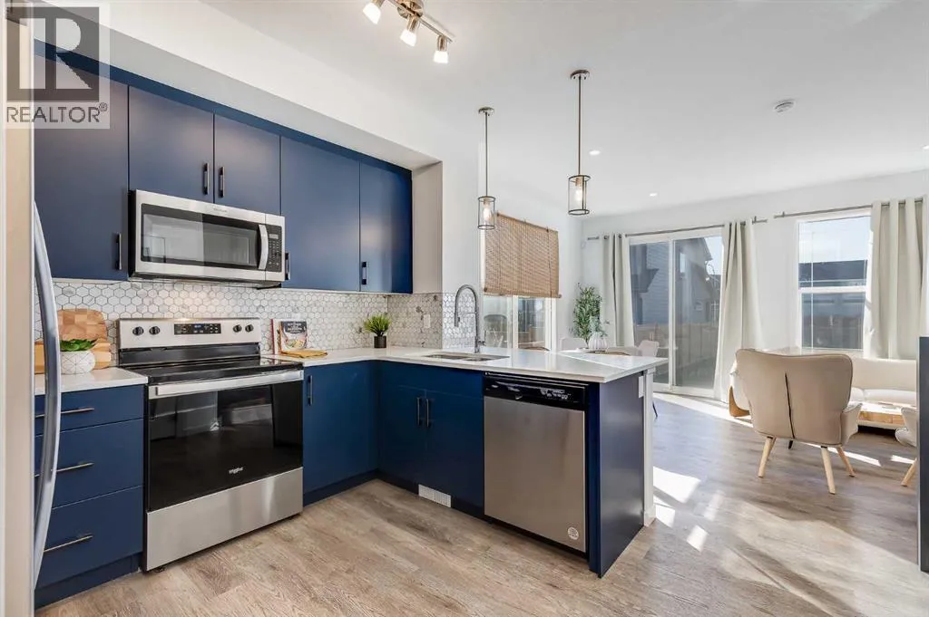Located in the desirable, family-friendly lake community of Mahogany, this semi-detached two-storey home sits on a generously sized lot (nearly double the size of similar properties) and features a single attached garage with an oversized driveway, complete with an electric car charger fitting. Offering approximately 1,500 square feet of thoughtfully designed living space, the home includes three bedrooms and 2.5 bathrooms. The main floor welcomes you with luxury vinyl plank flooring throughout and 9-foot ceilings, creating a bright and inviting atmosphere. A spacious entryway leads to an open-concept kitchen, dining, and living area, where abundant windows allow natural light to fill the space. The kitchen features modern blue cabinetry, a striking backsplash, quartz countertops, a French door fridge, an undermount sink with upgraded faucet, garburator, a double-door pantry with frosted glass, and breakfast bar seating. Stainless steel appliances and upgraded lighting complete the modern feel. Sliding glass doors from the dining area provide seamless access to the backyard, while a convenient two-piece powder room serves the main level. Upstairs, luxury vinyl plank flooring continues into a bonus room, three bedrooms, and the laundry area. The bonus room features an upgraded window, adding both style and natural light. The primary retreat includes dual closets and a four-piece ensuite, while the two additional bedrooms share a three-piece bathroom with an oversized shower and built-in seat. Upgrades such as metal spindle railings, pot lights, and enhanced lighting fixtures throughout the home contribute to a total of roughly $50,000 in modern enhancements. The basement, with 9-foot ceilings, awaits your personal touch and includes a bathroom rough-in, offering flexibility for future development. Outside, the expansive backyard spans 324 feet deep, perfect for creating distinct zones for gardening, a kidsâ play area, lush lawn, and a BBQ space to entertain friends a nd family. This home is a short 15-minute walk to the Mahogany Beach Club and its amenities. The lake offers sandy beaches, a non-motorized marina, swimming, paddleboarding, kayaking, fishing, and year-round recreational opportunities, including ice skating and hockey in winter. West Beach and Central Beach feature sports courts, playgrounds, picnic sites, and fire pits. A future school is planned right behind the backyard, and the communityâs 74 acres of wetlands are just a 15-minute walk away. Nearby amenities include Mahogany Village Market, Westman Village, restaurants such as Chairmanâs Steakhouse and Alvinâs Jazz Club, and convenient access to Seton YMCA, the Calgary Public Library, and schools including Mahogany School, Lakeshore School, and Joanne-Cardinal Schubert High School. Easy connections to 52nd Avenue and Stoney Trail make commuting a breeze! Check out the floor plans and 3D tour for a closer look! (id:27476)