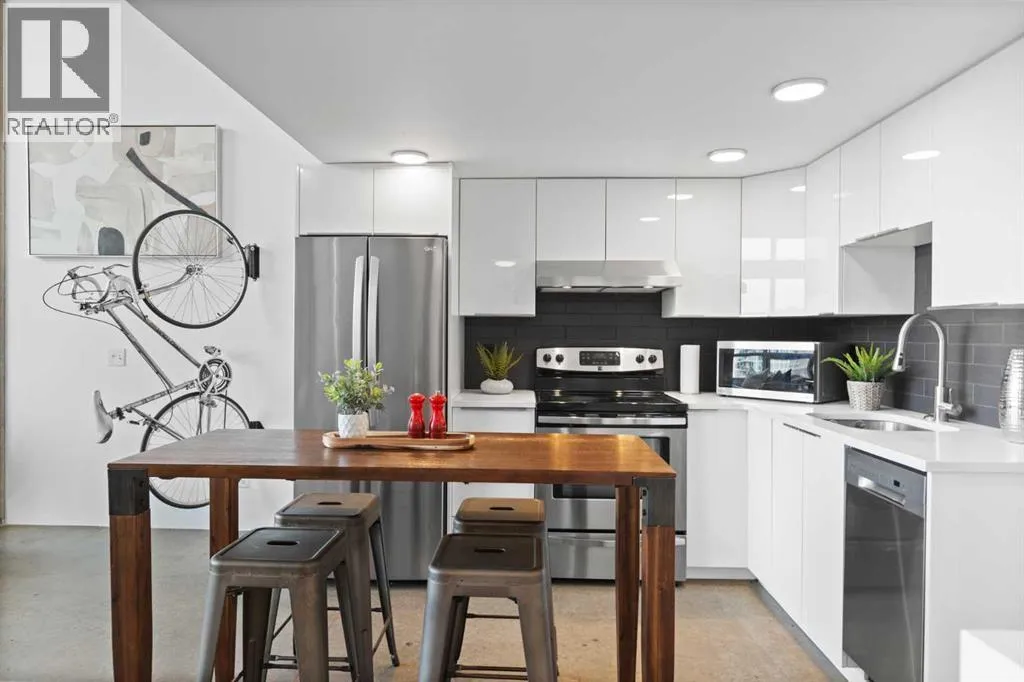 Welcome to urban living at its finest in the iconic Orange Lofts! This bright and spacious pet friendly loft offers soaring ceilings and a spectacular 16x16â glass wall with unbeatable views. The open-concept design creates the perfect flow for both everyday living and entertaining.The stylish kitchen is complete with high-gloss acrylic cabinetry, sleek quartz countertops, and stainless steel appliances, making it a chefâs delight. The bathroom has been thoughtfully updated with a stand-up shower and sliding glass doors, offering a spa-like retreat.Upstairs, youâll find a large bedroom with abundant closet space, while thoughtful upgrades throughout the unitâincluding automatic black out blinds, laminate flooring and fresh paintâadd modern comfort.This home also includes a titled underground parking stall, ensuring convenience year-round. Step outside to the rooftop patio with two gas BBQs, perfect for hosting friends while enjoying breathtaking city views.Located in the heart of Downtown East Village, youâll be steps from trendy restaurants, cafés, shopping, river pathways, public transit, and just minutes to vibrant Inglewood.Donât miss your chance to own in one of Calgaryâs most sought-after loft buildings! (id:27476)
