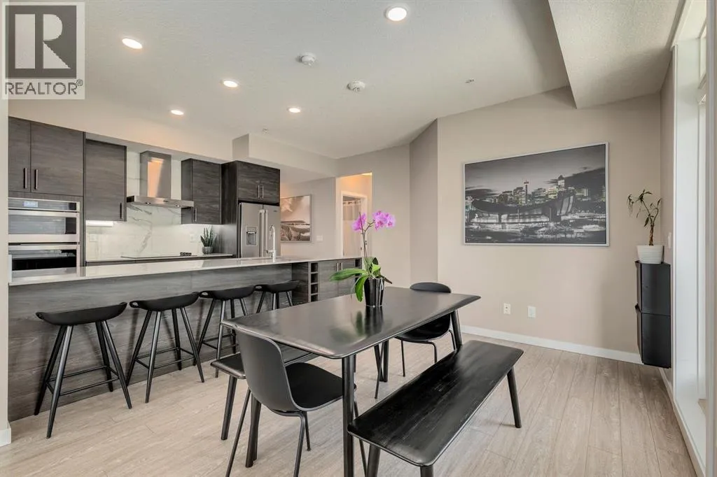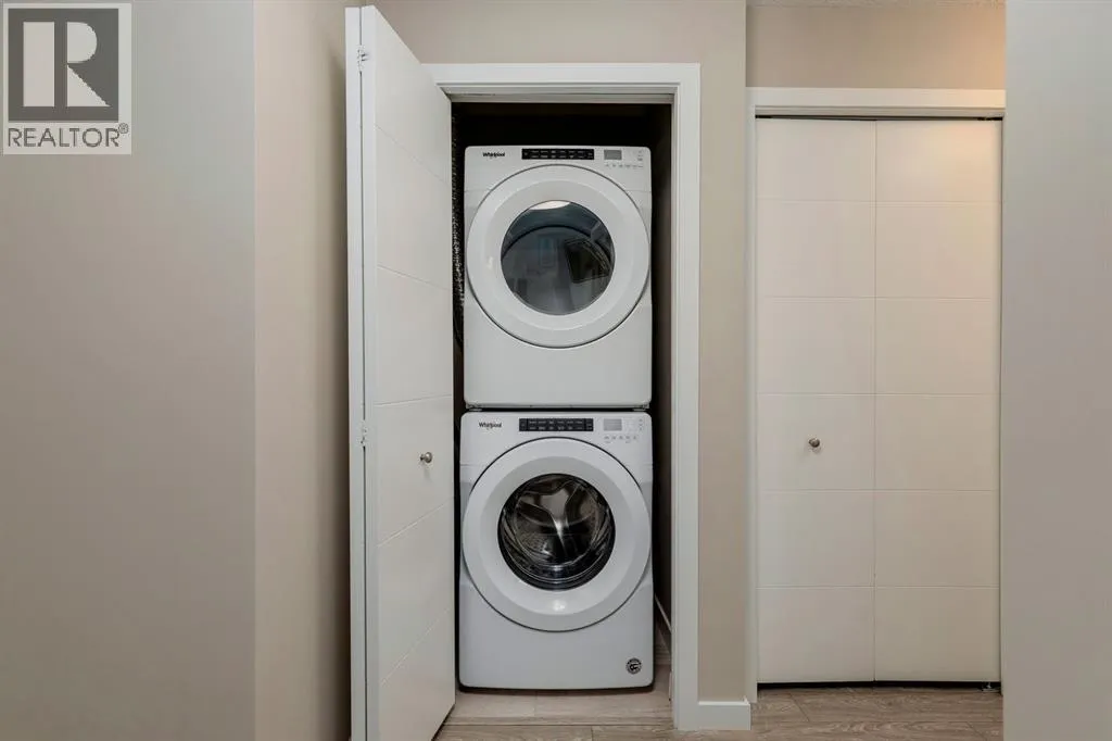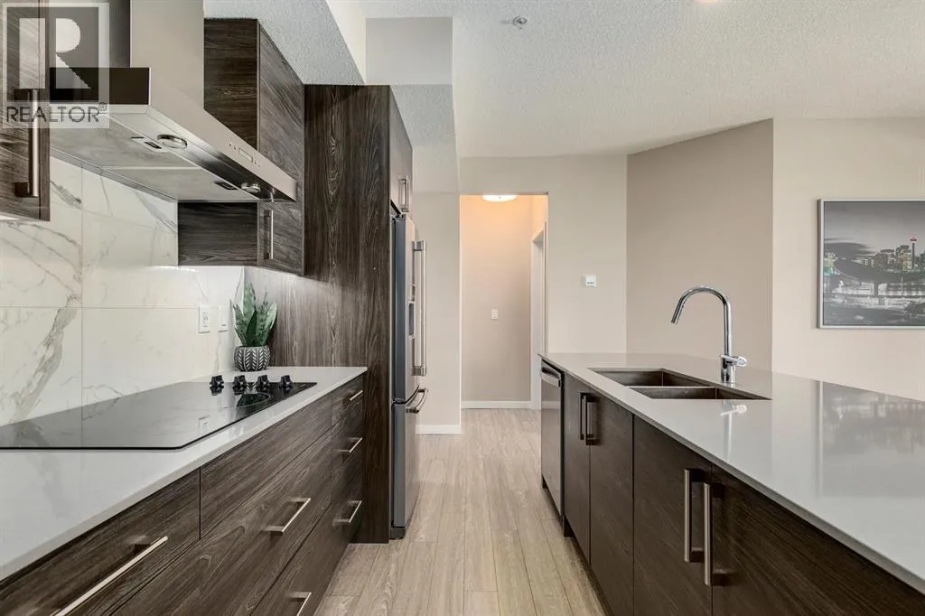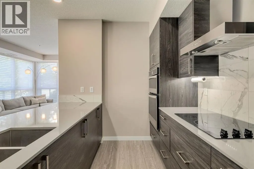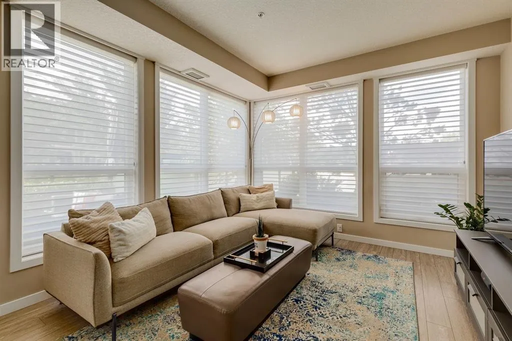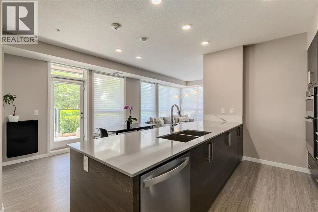 Lake Living in Mahogany is the dream but we kick it up a notch when living at Westman Village ~ Experience elevated, resort-style living in the heart of Westman Village with this beautifully appointed 2-bedroom, 2-bathroom main floor corner air conditioned unit. Perfectly positioned just steps from the adjacent West Beach and the Mahogany boardwalk, this rare offering blends luxury, comfort, and an unbeatable location within one of Calgaryâs most amenity-rich lake communities. ~ Spanning 1040 sq ft, this air-conditioned home features 9-foot ceilings, wide-plank luxury vinyl flooring, and an abundance of natural light thanks to its corner-unit layout and additional windows throughout. The modern kitchen showcases sleek cabinetry, quartz countertops, and a stylish neutral colour palette that flows seamlessly into the bright and open living area.From both the living room and the expansive patio, enjoy subtle views of Mahogany Lake and beautifully landscaped courtyard gardens. The oversized, private patio is large and semi private â an ideal extension of your living space, complete with privacy glass and lush greenery, perfect for morning coffee, dining al fresco, or relaxing in the sun.The oversized primary suite is a true retreat, featuring ample space for a sitting area or workspace, custom closets with built-in organizers, and a private 3-piece ensuite with modern fixtures and finishes. The spacious second bedroom includes a walk-in closet and a large window, with easy access to the second full 4-piece bathroomâideal for guests or flexible use. Additional conveniences include in-suite laundry and a large in-suite storage room. AND you have a separate Storage Locker (rare) purchased from developer. This home also includes a titled underground parking stall and access to Westman Villageâs world-class amenities. The 40,000+ sq ft Village Centre offers a lifestyle unlike any other, including a fitness facility, indoor pool, walking track, golf simulator, gymnasium , wine room, library, art studio, and more. Residents also enjoy a dog wash, car wash bay, guest suites, and 24-hour on-site security.But what truly sets this location apart is its immediate proximity to West Beachâwith sandy shores, lake access, and endless recreational opportunities just out your front door. Within the village, youâre steps from boutique retail, a full-service pharmacy, and some of Calgaryâs best dining: enjoy brunch at Diner Deluxe, fine dining at Chairmanâs Steakhouse, cocktails and live music at Alvinâs Jazz Club, or a casual night out at Mash. Start your mornings with Analog Coffee, located just around the corner.This is your opportunity to enjoy the best of lake living with all the benefits of a low-maintenance, lock-and-leave lifestyle. Book your private showing today and discover how life at Westman Village truly feels like a resortâevery single day. (id:27476)