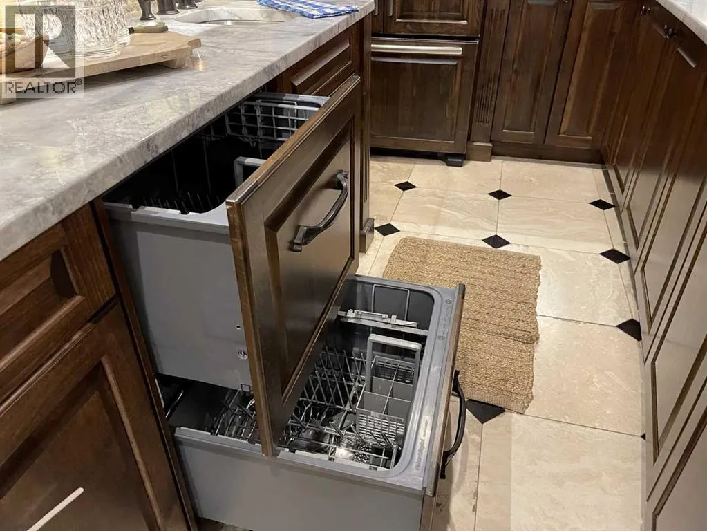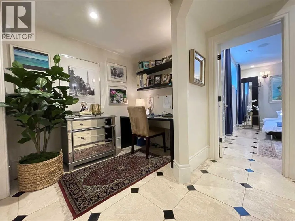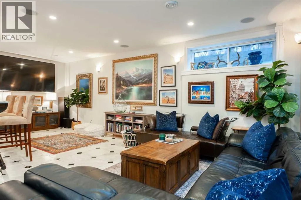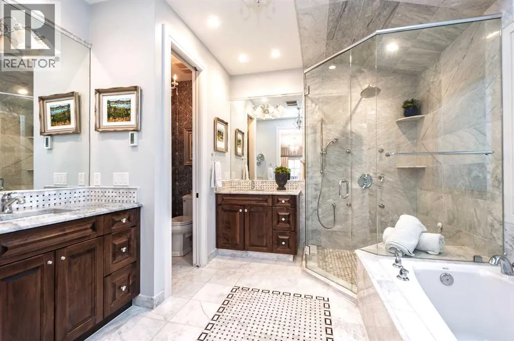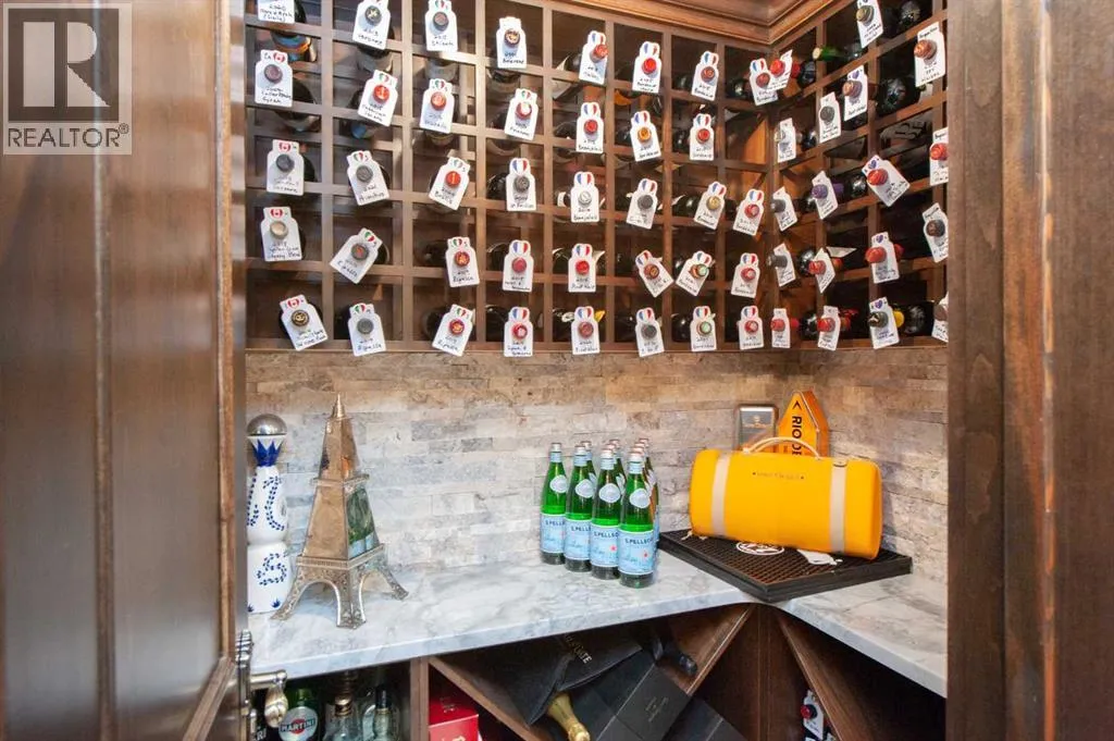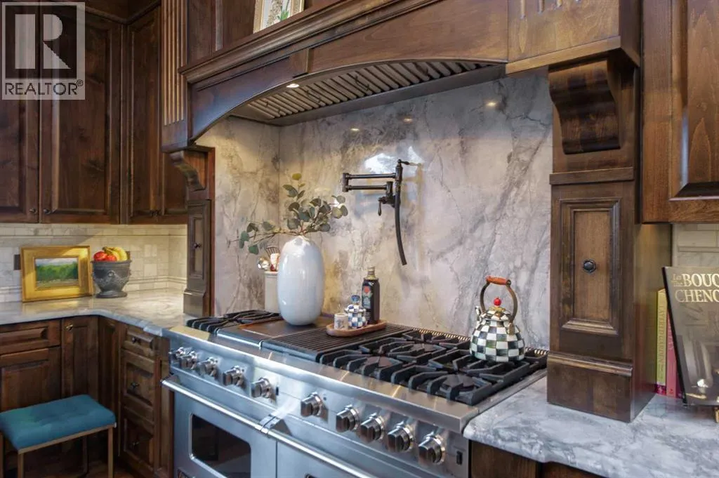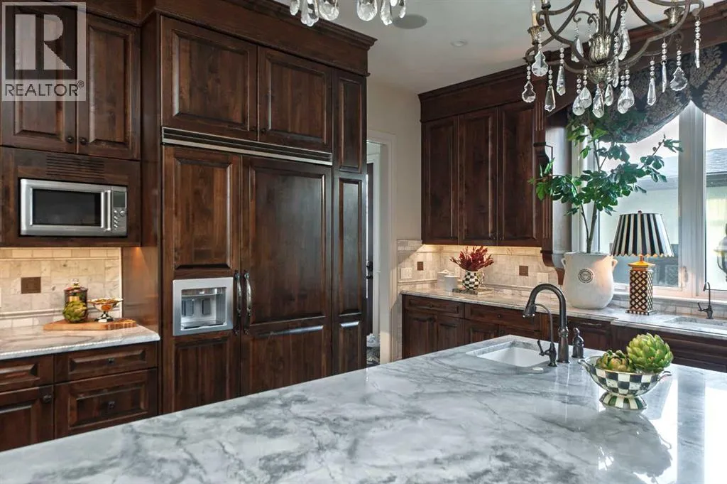 Experience unparalleled luxury in this breathtaking estate with sweeping downtown Calgary views. The grand foyer with travertine floors, rich wood moldings, and a crystal chandelier sets the tone for elegance. A chefâs dream kitchen boasts Viking appliances, 6-burner range, double ovens, twin dishwashers, custom cabinetry, oversized island, and butlerâs pantry with wine fridge. Entertain in the formal dining room with marble-hearth fireplace or relax in the spacious living room and private office. Upstairs, the primary suite features a private balcony and spa-inspired marble ensuite, with three additional bedrooms and a dual laundry. The lower level offers a wet bar, wine room, gym, guest suite, and entertainment space. Enjoy a heated 3-car garage, five dishwashers, three laundry sets, integrated Sonos, app-controlled lighting, automated drapery, and advanced security. Outdoors, retreat to a private backyard oasis with clubhouse, stamped concrete patio, and perennial gardens. This home is the ultimate blend of elegance, comfort, and modern convenience. (id:27476)