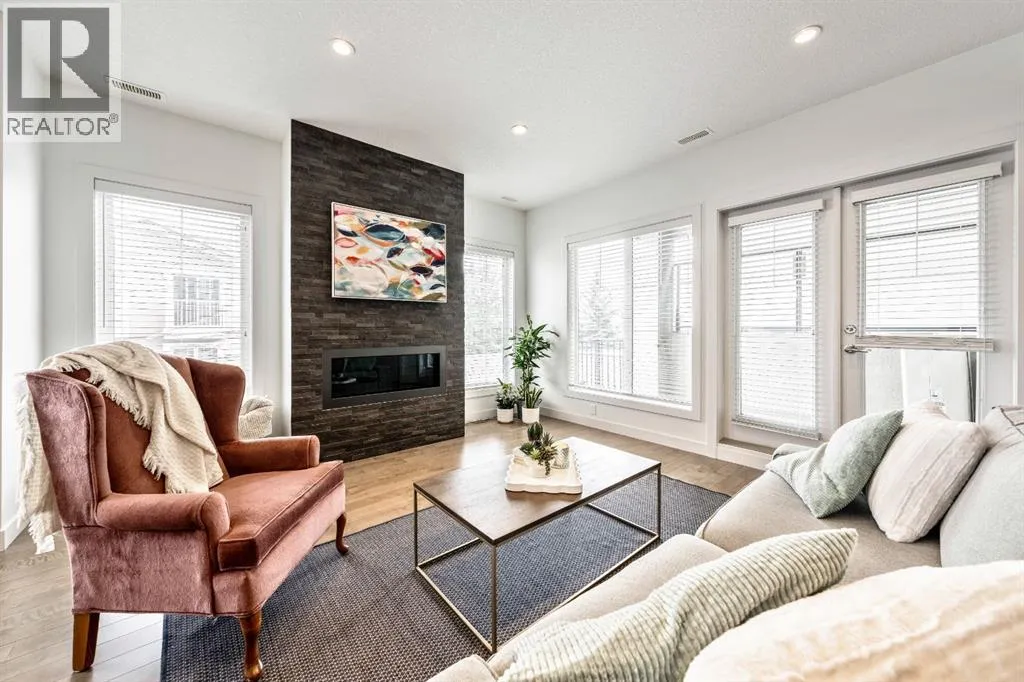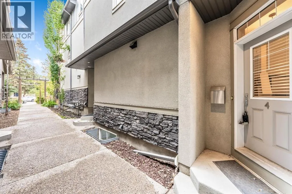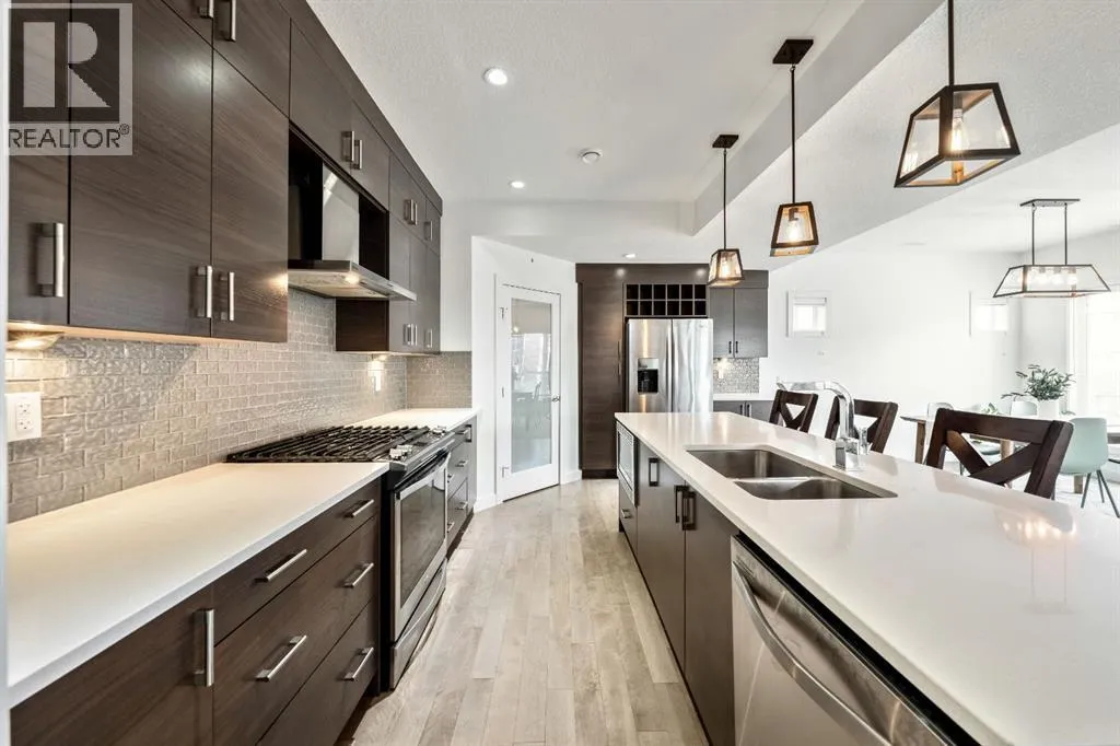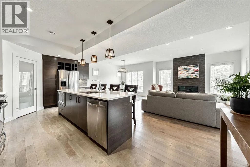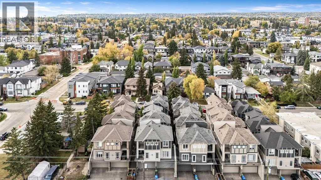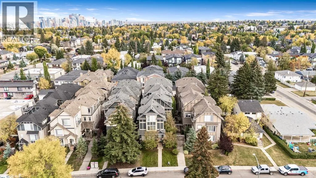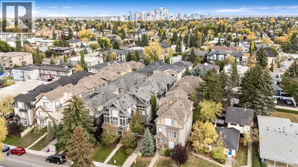 A rare opportunity to live in a luxurious end unit townhome on a quiet street offering over 2000 sq ft in the One of Calgaryâs most desirable inner-city neighborhoods Killarney. This immaculate home has plenty of upgrades; 9â knockdown ceilings, gleaming hardwood floors, upgraded plumbing fixtures, Hunter Douglas blinds, stone counters, custom closets, fresh paint, the comforts of air conditioning and a concrete wall separating you and the one neighbor. Head down the courtyard to unit 4 where you are greeted by a large front foyer and convenient direct access to the heated garage. This space was intentionally designed to be on its own separate level as a drop zone and to keep the mud and mess down and away. Upstairs is flooded with natural light. The massive chef inspired kitchen is a focal point with slow close cabinets that reach to the ceiling, built in wine rack, undercabinet lights, premium SS appliances (including a gas range) and chimney hood fan, an expansive 10-foot island with gorgeous quartz counters, timeless tile backsplash and a large corner pantry for additional storage. Perfect for entertaining the kitchen looks onto the spacious dining room and inviting living room showcasing a gas fireplace with stone detail. Off the living room is a large, covered patio and office perfect for those who work from home, or as a playroom. The powder room is tucked away on its on separate level for privacy and includes side by side laundry with cabinets to keep you organized. On the upper level are two well sized bedrooms one with downtown VIEWS, a 4pc main bath and the primary retreat. This generous sized primary is a true sanctuary with its own private patio a massive walk-in closet and a spa inspired ensuite Including dual sinks, a large soaker tub, and fully tiled shower with 10 mm glass. Beyond Home you will love the lifestyle. Only minutes away from downtown, close to parks, shops, restaurants, schools, the rec center, bow river path system, shaganappi golf co urse and ctrain! Providing endless opportunities for work and play. If you have been searching for a home that balances luxury with livability in an unbeatable location schedule your private tour today! (id:27476)