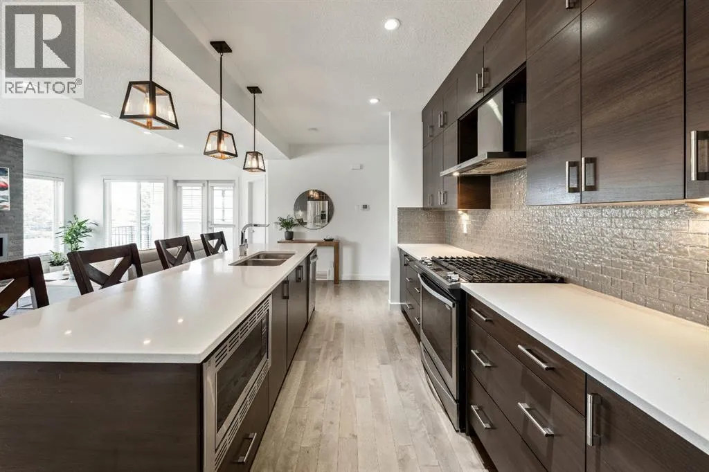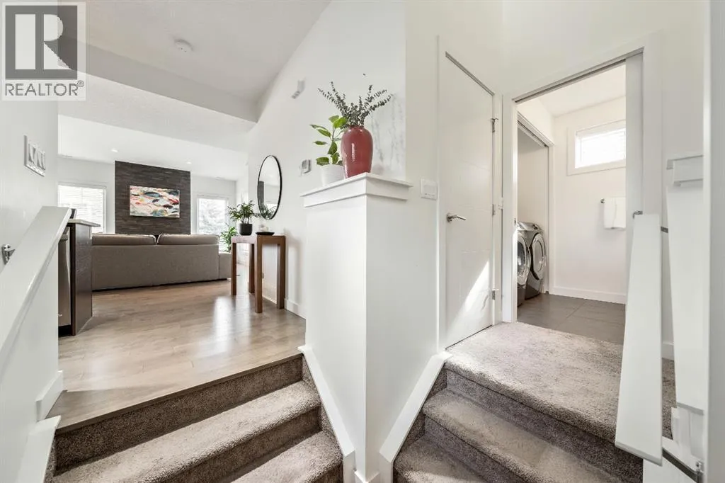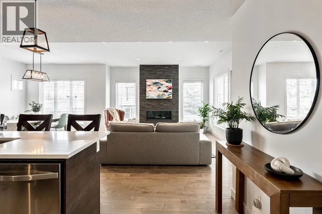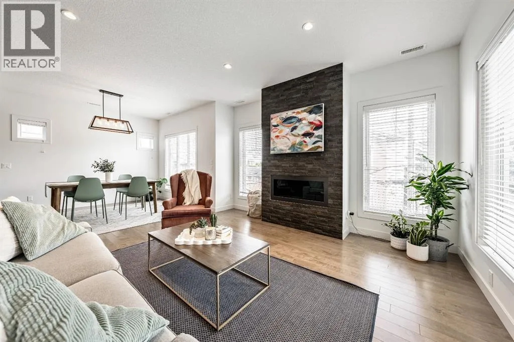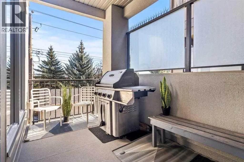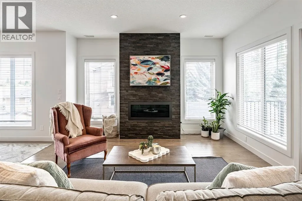 A rare opportunity to live in a luxurious end unit townhome on a quiet street offering over 2000 sq ft in the One of Calgaryâs most desirable inner-city neighborhoods Killarney. This immaculate home has plenty of upgrades; 9â knockdown ceilings, gleaming hardwood floors, upgraded plumbing fixtures, Hunter Douglas blinds, stone counters, custom closets, fresh paint, the comforts of air conditioning and a concrete wall separating you and the one neighbor. Head down the courtyard to unit 4 where you are greeted by a large front foyer and convenient direct access to the heated garage. This space was intentionally designed to be on its own separate level as a drop zone and to keep the mud and mess down and away. Upstairs is flooded with natural light. The massive chef inspired kitchen is a focal point with slow close cabinets that reach to the ceiling, built in wine rack, undercabinet lights, premium SS appliances (including a gas range) and chimney hood fan, an expansive 10-foot island with gorgeous quartz counters, timeless tile backsplash and a large corner pantry for additional storage. Perfect for entertaining the kitchen looks onto the spacious dining room and inviting living room showcasing a gas fireplace with stone detail. Off the living room is a large, covered patio and office perfect for those who work from home, or as a playroom. The powder room is tucked away on its on separate level for privacy and includes side by side laundry with cabinets to keep you organized. On the upper level are two well sized bedrooms one with downtown VIEWS, a 4pc main bath and the primary retreat. This generous sized primary is a true sanctuary with its own private patio a massive walk-in closet and a spa inspired ensuite Including dual sinks, a large soaker tub, and fully tiled shower with 10 mm glass. Beyond Home you will love the lifestyle. Only minutes away from downtown, close to parks, shops, restaurants, schools, the rec center, bow river path system, shaganappi golf co urse and ctrain! Providing endless opportunities for work and play. If you have been searching for a home that balances luxury with livability in an unbeatable location schedule your private tour today! (id:27476)
