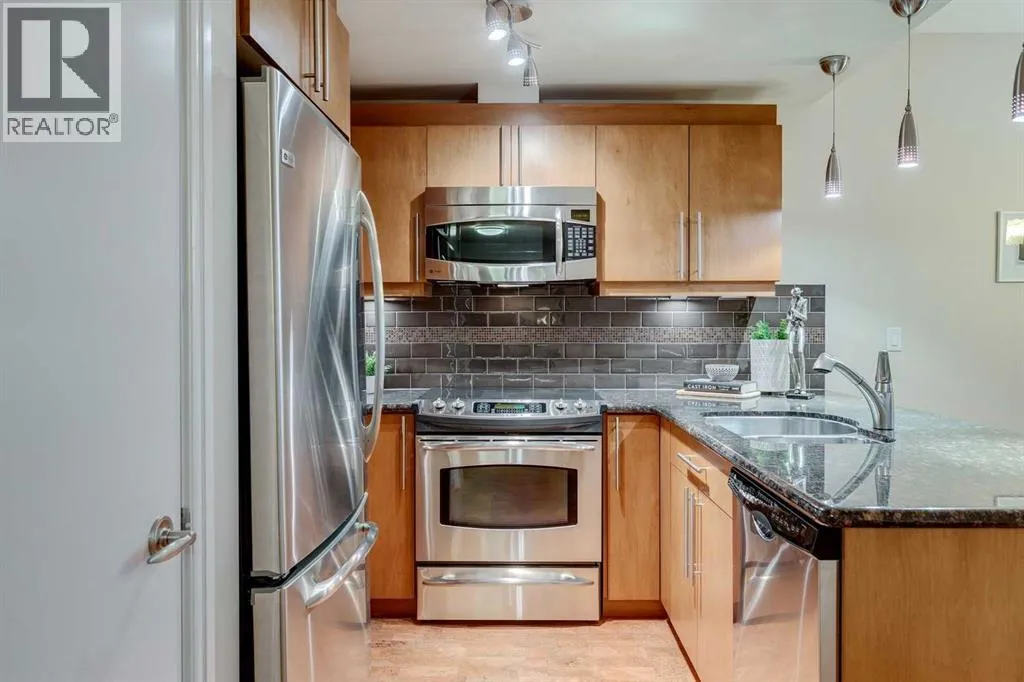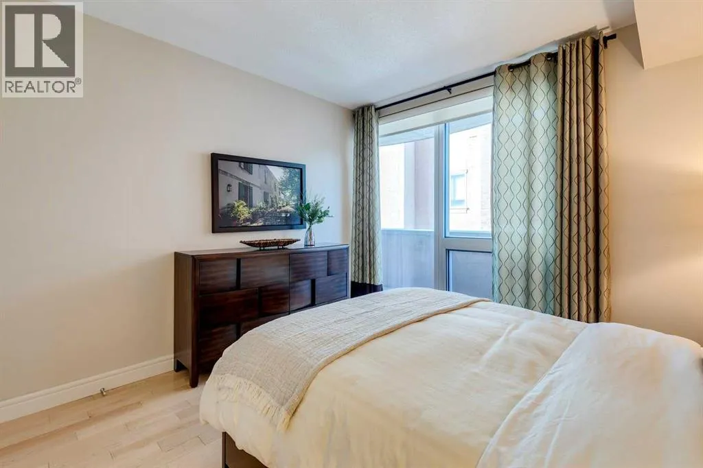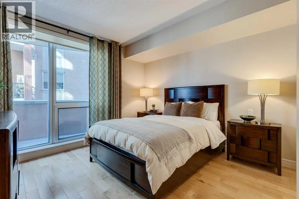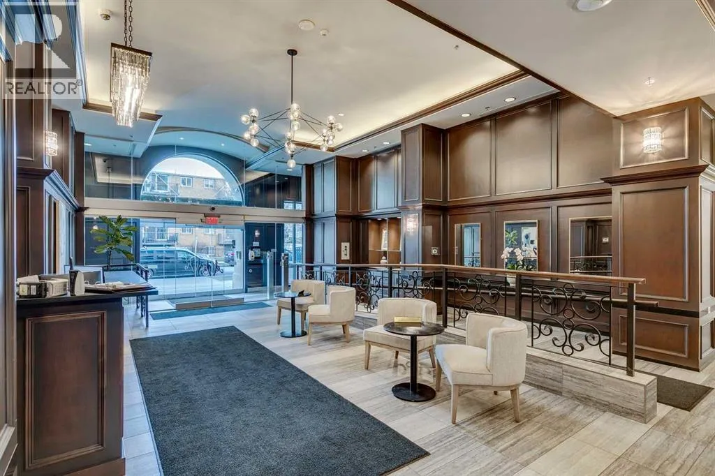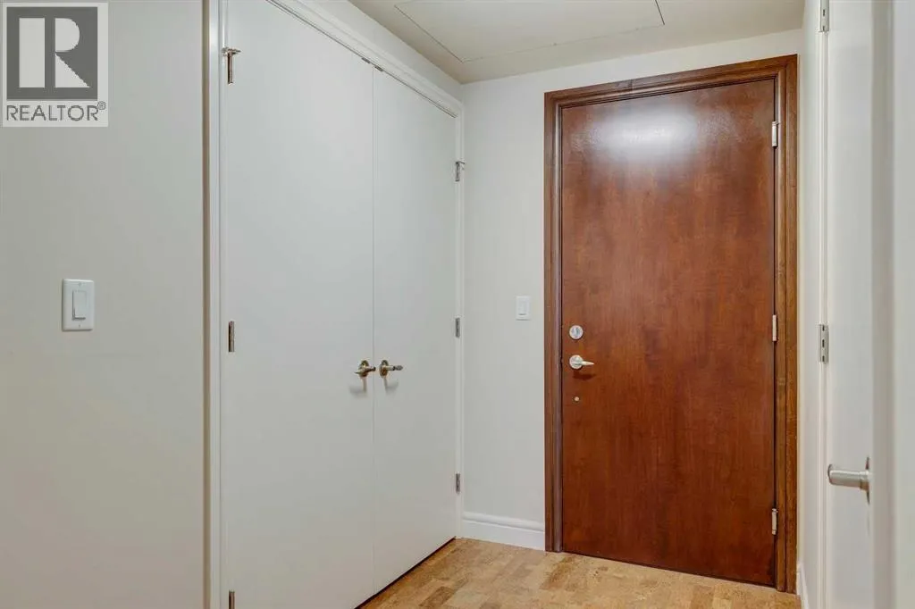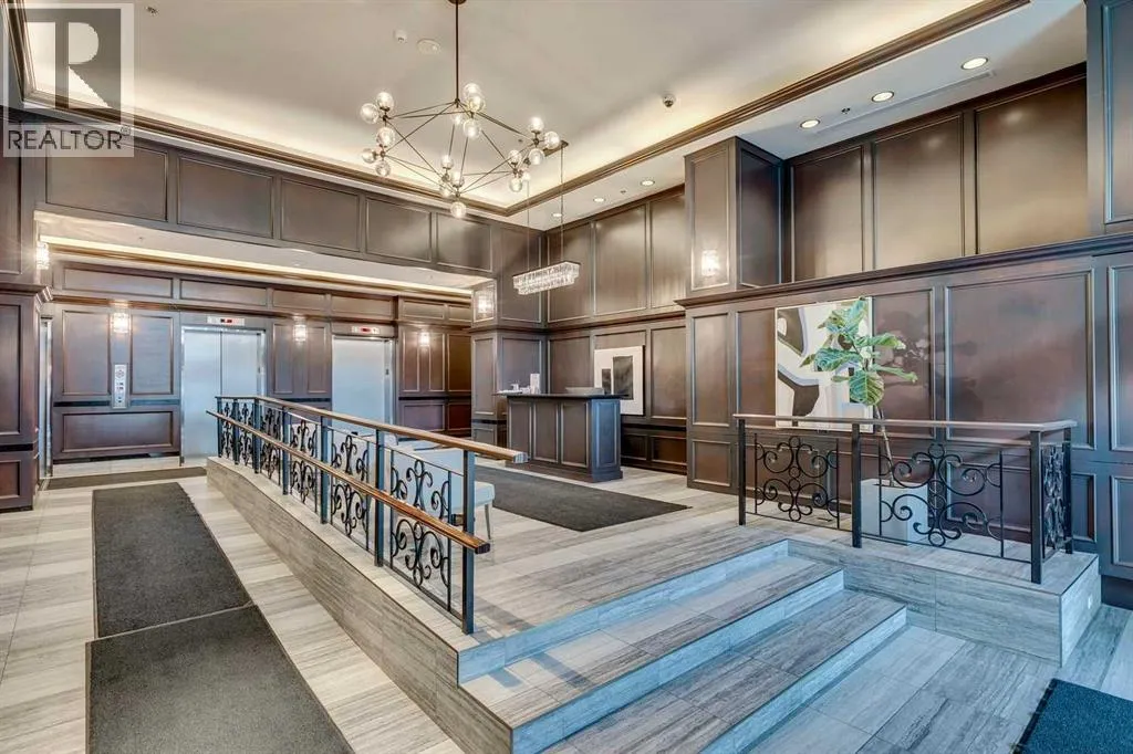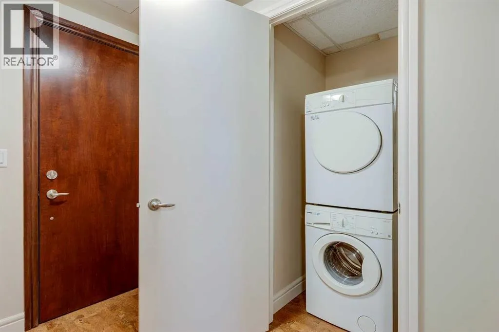 Best location in the Beltline. This larger 1 bedroom unit will keep you safe & sound downtown in a prestigious building with concierge services and amenities. This unit offers a spacious entry featuring a double closet for outerwear, cushioning cork flooring with superior thermal & acoustic insulation, and a private DEN to write your next book or relax before heading out into the vibrant city. The full kitchen has a timeless design including a sophisticated glass panel cabinet to highlight special glassware, storage pantry, undermount lighting as well as recessed electrical outlets. ALL appliances are still like new having been rarely used â as well as washer/dryer. [Owners did not live here fulltime but used the space for stop-overs in Calgary. They appreciated the security in this ideal location just steps away from shopping and within walking distance to sports & Stampede] Inviting living room is open concept & full balcony spans across the living room and bedroom with glimpses of the sky north & south. The bedroom is almost 12âx12â with deep double closets & full of natural light. A traditional 4-pce bathroom has plenty of space and this unit also offers multiple storage closets as well as EXTRA separate storage in the parking garage. You will appreciate Central A/C & 3 elevators within the building as well as thoughtfully designed stairwells. Titled parking is included & pets are welcome with approval. (id:27476)