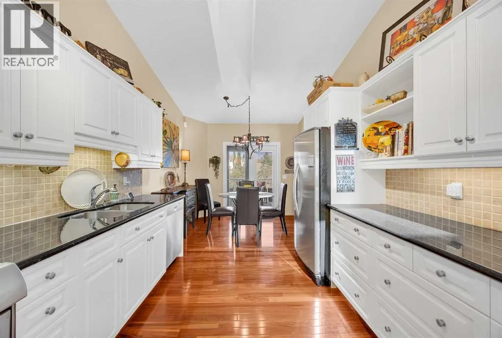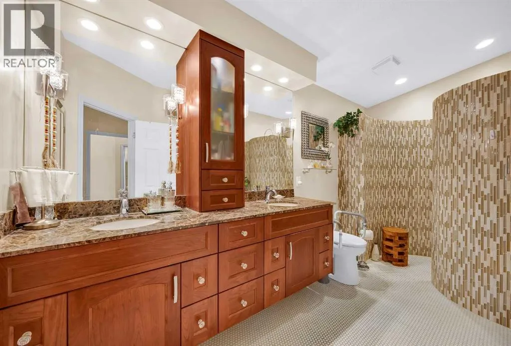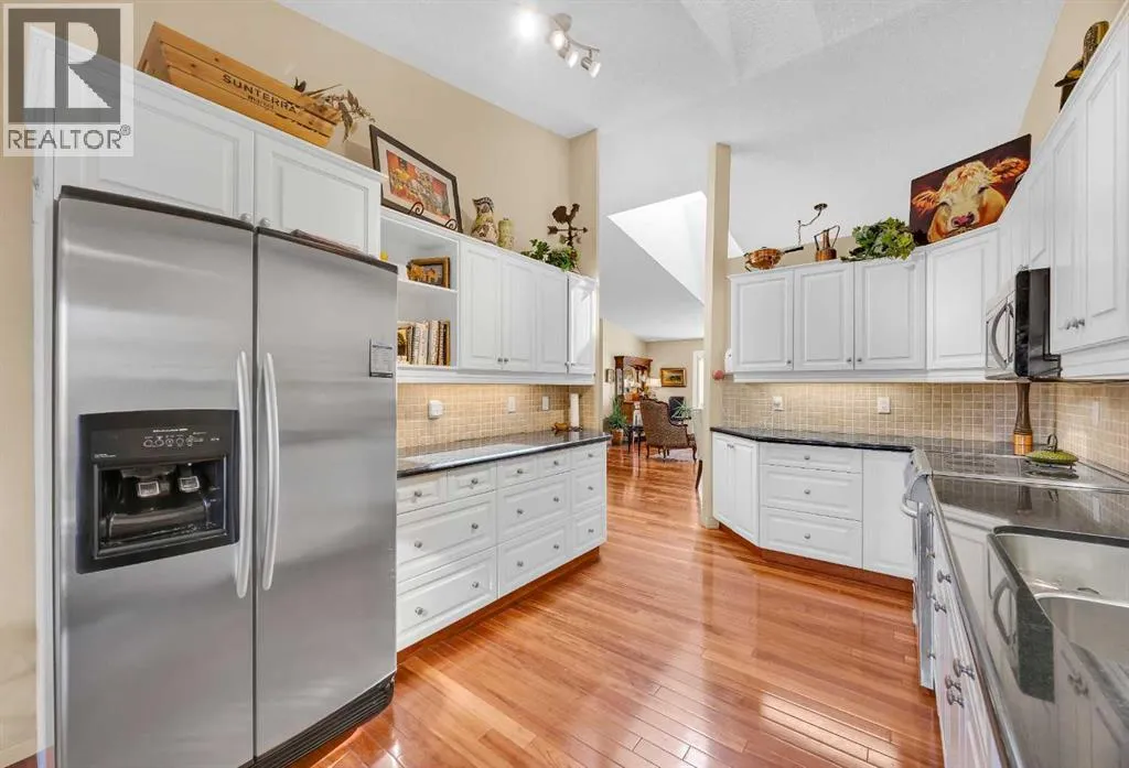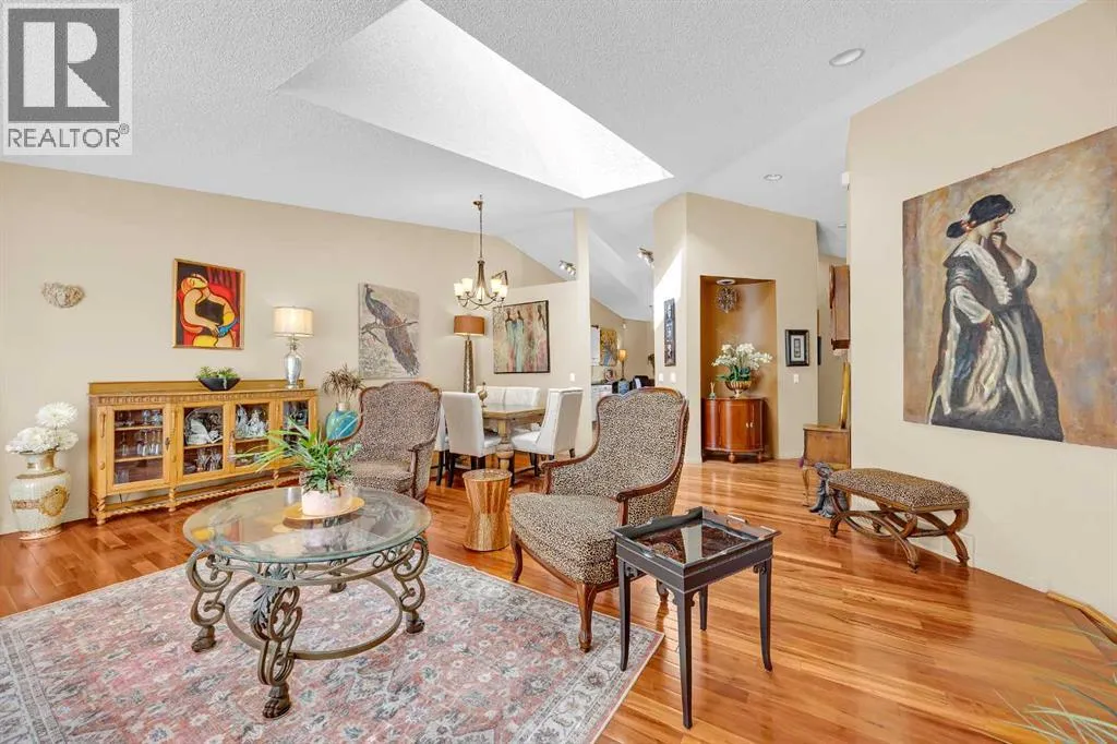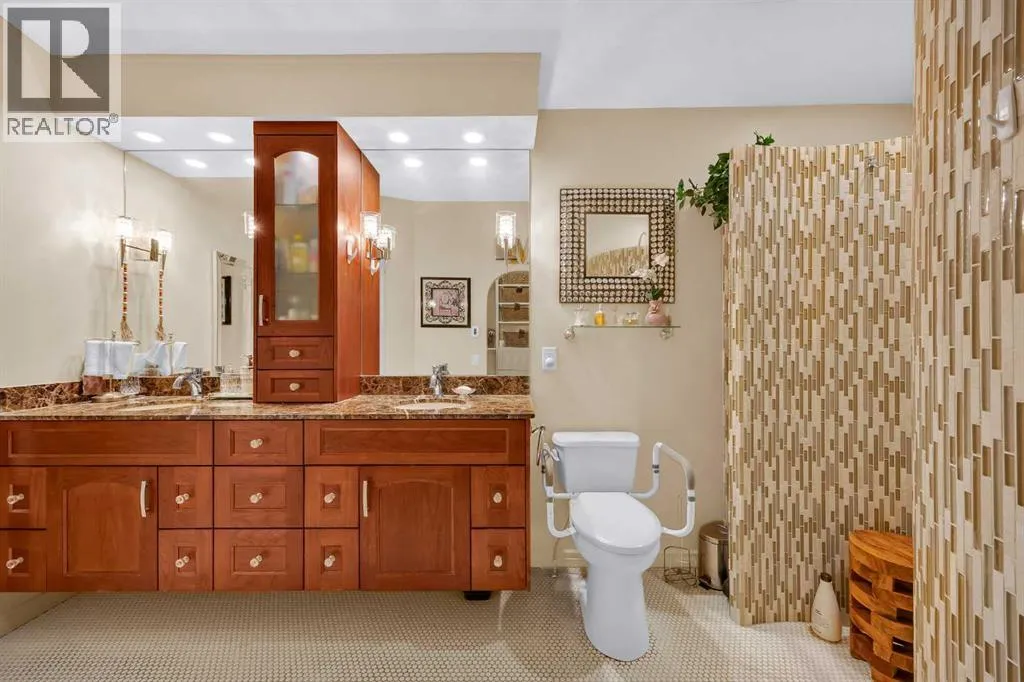 Elegant 2-Bedroom Bungalow Villa in Christie Gardens â Over 2,400 sq. ft. of Living Space.Nestled in one of the most desirable and serene spots within Christie Gardens, this 2-bedroom bungalow villa offers over 2,400 sq. ft. of thoughtfully designed living space. Enjoy a private and tranquil setting surrounded by mature trees, a secluded backyard backing onto a huge ravine with no future development, and an upper-level deckâperfect for relaxing or entertaining outdoors.The main floor impresses with Brazilian Tigerwood hardwood flooring, soaring vaulted ceilings with skylights, and an open-concept living area. The modern kitchen features quartz countertops, stainless steel appliances, and ample cabinetry. The luxurious primary suite boasts a spa-inspired 4-piece ensuite with marble counters, in-floor heating, custom cabinetry, a walk-in closet, and a striking mosaic-tiled, no-threshold entry shower. A 2-piece powder room and a well-appointed laundry room with extra storage complete the main level.The walk-out basement expands your living space with a spacious rec room, an additional bedroom, and a full bathroom with a Jacuzzi soaker tubâideal for family or guests.This pet-friendly, no-age-restriction complex is perfectly situated near Sunterra West Market Square, Westhills Towne Centre, Sirocco C-Train Station, Westside Recreation Centre, Strathcona Park pathways, Christie Park tennis and pickleball courts, and highly rated schools including Ernest Manning and Ambrose University. With quick access to downtown and the mountains, this home effortlessly combines privacy, comfort, and convenience in one of Calgaryâs most sought-after communities. (id:27476)