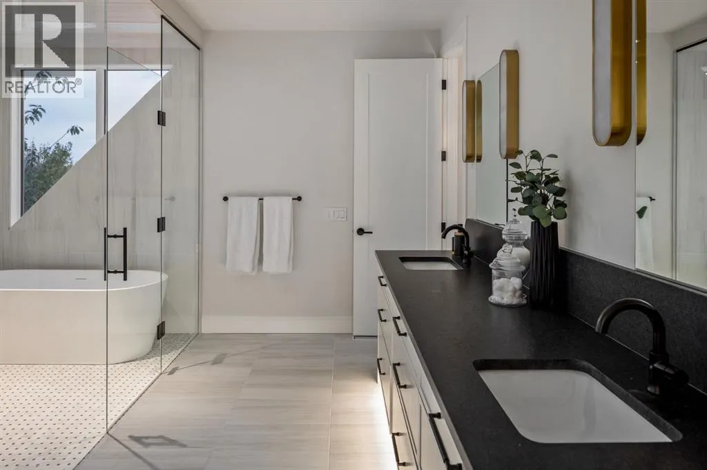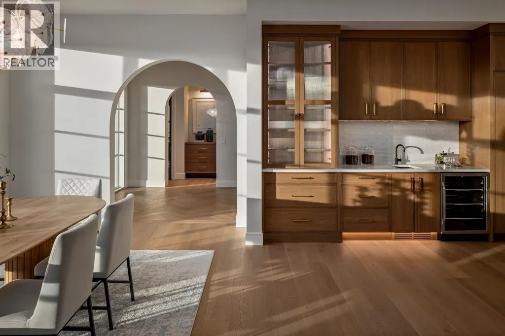OPEN HOUSES Sat Nov 15th & Sun Nov 16th 1-4PM! Homes on this exclusive ridge rarely come to market, and this breathtaking two-storey estate is a shining example of elevated inner-city living. With 5,545.89 sq.ft. of exquisitely developed space, this 6 bedroom, 5.5 bath residence blends refined craftsmanship with functional luxury; set against a backdrop of sweeping valley and park views. Step inside to soaring ceilings, pristine engineered hardwood floors, and custom archway details that frame each thoughtfully designed space. The heart of the home begins in the sunlit dining area, perfect for hosting epic dinner parties, and highlighted by west-facing triple-glazed LUX windows. The adjacent chefâs kitchen impresses with stainless steel integrated appliances, including a Wolf gas cooktop, double wall ovens, classic white shaker cabinetry, and a hidden butlerâs pantry for discreet prep and storage. The expansive great room invites relaxation with vaulted ceilings and a cozy microcement faced gas fireplace, opening directly to a sunny south-facing deck overlooking endless green space. A main floor guest suite (or executive office) with a private ensuite, a designer powder room, and a spacious mudroom with built-ins complete this level. The fully insulated triple car garage is EV-ready and lift-kit friendly, marrying form and function. Upstairs, a serene primary retreat features elegant vaulted ceilings, a custom walk-in closet, and a spa-inspired 5-piece ensuite with a soaker tub, dual vanities, and a glass shower with bench and niche. Three additional bedrooms (one with an ensuite), an upper laundry room with sink and storage, and a charming library nook provide comfort and convenience for the entire family. The fully developed basement is an entertainerâs dream: featuring a large media lounge, games area, wet bar with brick backsplash and undermount lighting, and a high calibre wine room that secretly accesses the highly systemized maintenance room. A versatile home gym, sixth bedroom with walk-in closet, and additional full bathroom on this level ensure guests feel at home. Noteworthy highlights include: Hydronic in-floor heat in the basement; 2 High-Efficiency furnaces & A/C units; built-in speakers throughout; and quartz countertops in all bathrooms. Located minutes from the University of Calgary, Foothills Hospital, and local shops and restaurants, this timeless home sits in a top-tier school catchment and offers quick access to major routes while maintaining a tranquil, park-like setting. A truly unique opportunity to own a well-appointed, move-in ready home in one of the cityâs most prestigious enclaves. (id:27476)