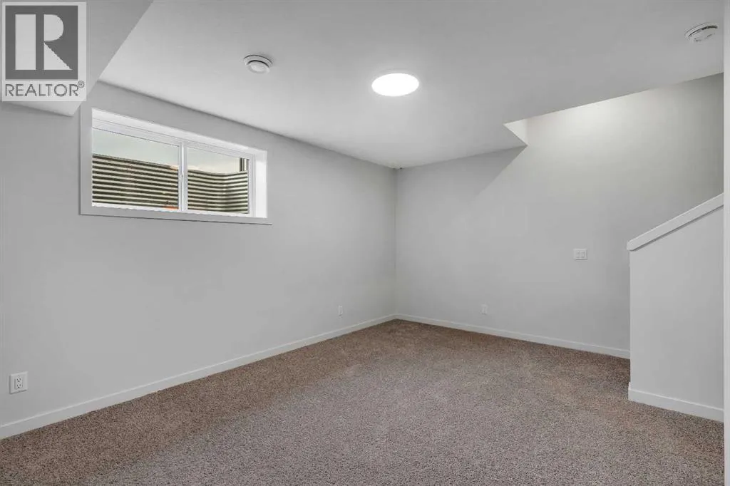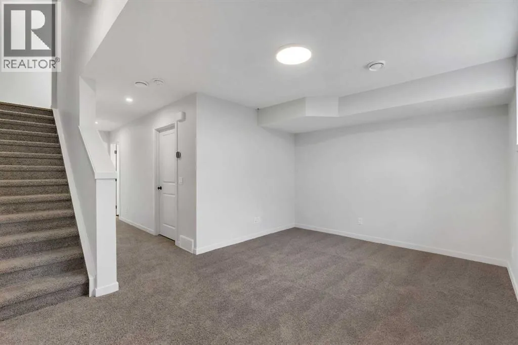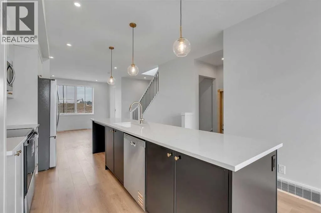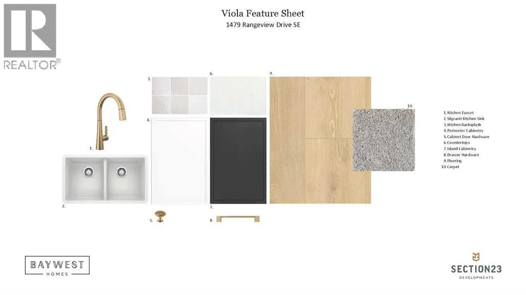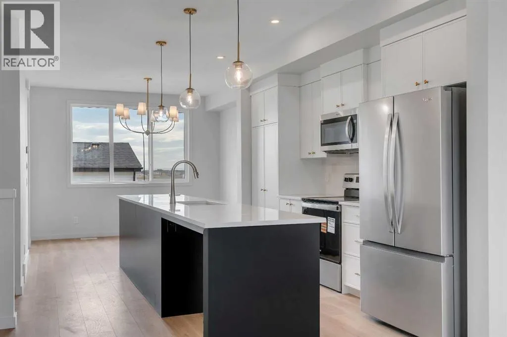 Welcome to 1497 Rangeview Drive SE â Viola 18 Model by Baywest Homes. This stunning home perfectly blends modern design with practical upgrades, offering style, comfort, and functionality for todayâs lifestyle. At the heart of the home, the center kitchen boasts a long quartz island, upgraded gold plumbing fixtures, a Siligranite sink, stylish backsplash, and designer-curated finishes throughout. An oversized stairwell window and large dining room window flood the space with natural light, while the open railing upgrade creates a spacious, airy feel on the main floor. The generously-sized primary bedroom includes its own 3-piece ensuite with a large shower. The remaining two bedrooms are located at the back of the home and share a full bathroom. The thoughtfully developed basement adds incredible living space, featuring a 4th bedroom, full bathroom, spacious living room, and storage. With two large windows, the lower level is bright and invitingâideal for guests, teens, or extended family. Stay cool all summer with air conditioning and enjoy the convenience of a rear deck complete with BBQ gaslineâthe perfect spot for summer gatherings. The home is also sprinkler system rough-in ready and includes front landscaping for a polished curb appeal. This home also includes a rear detached garage (18' x 21'), a side door entrance with upgraded laminate landing, and a south-facing backyard that ensures plenty of natural sunlight year-round. Perfectly situated in the growing community of Rangeview, this home is just steps from the future Commercial Village, Harvest Hall, and Community Greenhouseâconnecting you to convenience, culture, and community living. (id:27476)