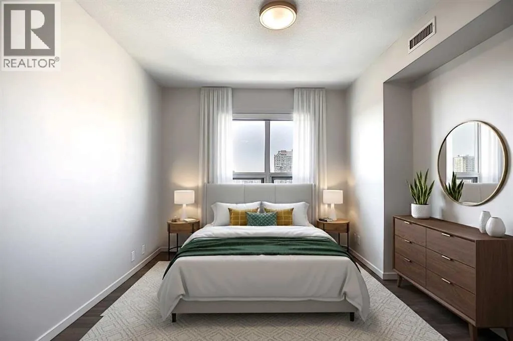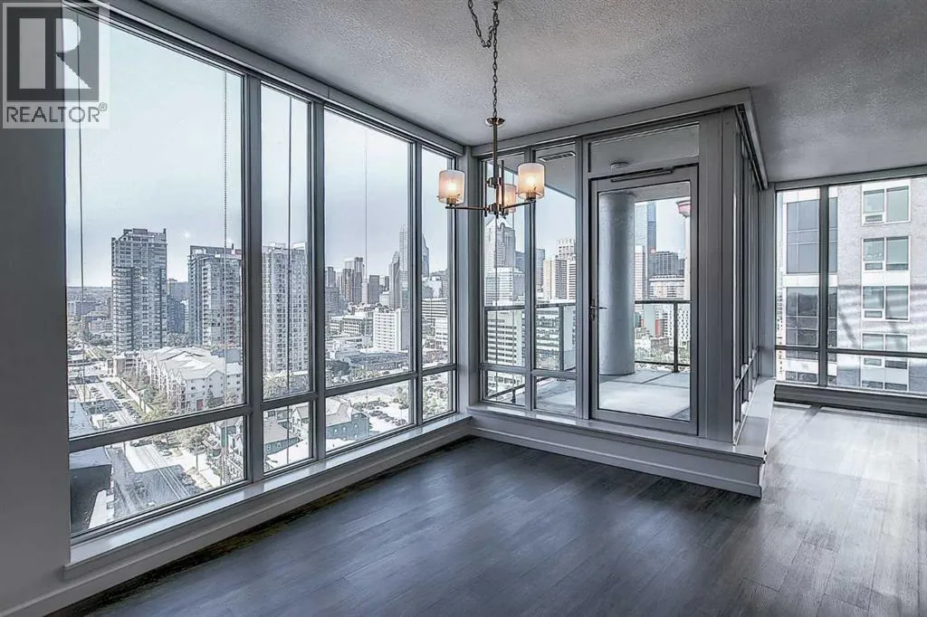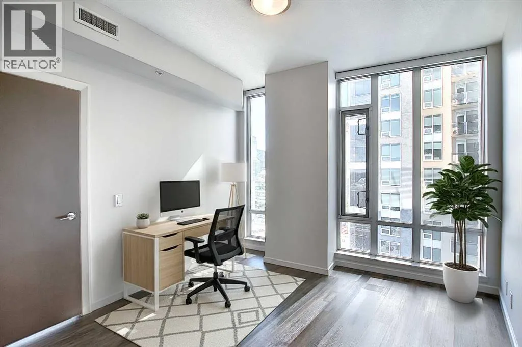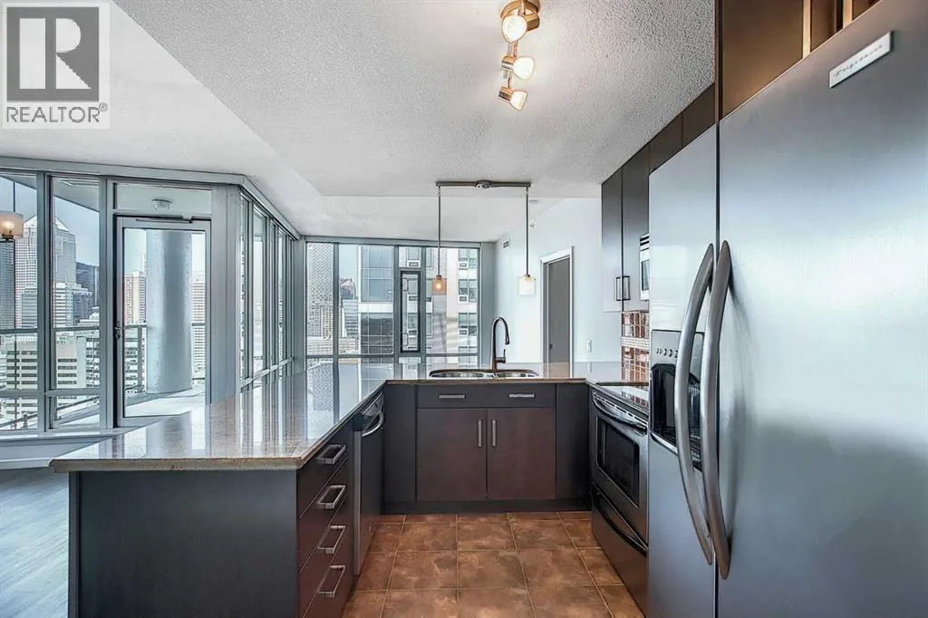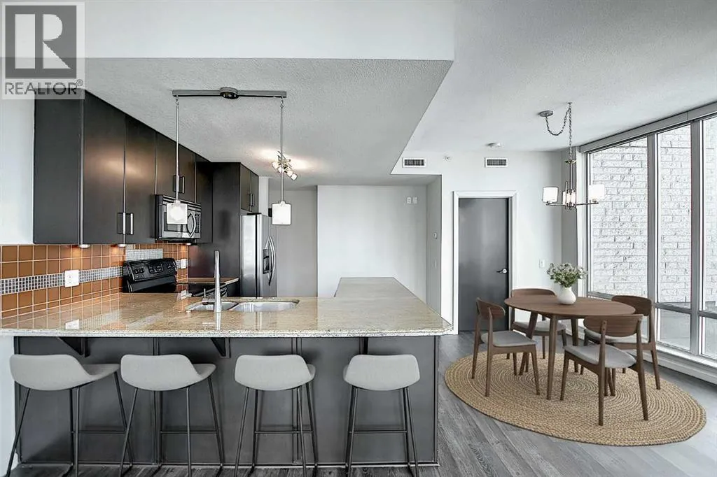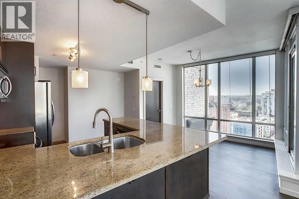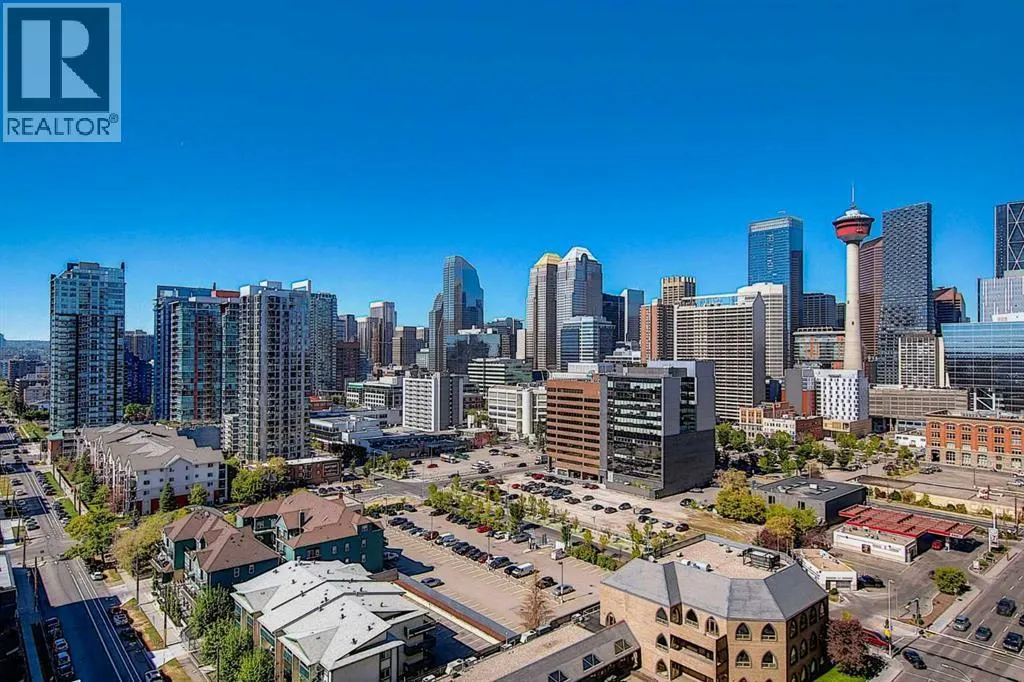 Exceptional 16th-Floor Unit with Breathtaking Panoramic Views! This beautifully appointed unit on the 16th floor offers stunning, uninterrupted views of both the mountains and downtown skyline. Ideally situated within close proximity to the LRT and the MNP Community & Sport Centre, this residence combines convenience with luxury. The upgraded interior features high-quality finishes, including maple cabinetry, granite countertops, stainless steel appliances, luxury vinyl flooring, tile, and floor-to-ceiling windows that maximize natural light and panoramic vistas. The entryway includes a walk-in coat closet with custom built-in storage for added organization. A dedicated home office area is integrated into the layout, complete with a granite work surface. The in-suite laundry room offers additional storage space for everyday practicality. The generously sized second bedroom enjoys remarkable views and includes a walk-in closet with a convenient cheater door leading to a well-appointed bathroom featuring a large walk-in shower. The kitchen, with its modern design, opens seamlessly to the dining and living areas, creating an ideal space for entertaining. The private balcony extends the living space outdoors, offering an excellent setting for barbecuing or simply taking in the spectacular scenery. The comfortable living room provides an inviting atmosphere for relaxation and social gatherings. The primary bedroom is a peaceful retreat, showcasing expansive views and a walk-through closet that leads to a luxurious four-piece ensuite bathroom. Residents also enjoy access to a well-equipped amenity center, which includes an exercise room, hot tub, sauna-equipped dressing rooms, a gathering space with pool table, theater room and patio access, one being the rooftop! Additional features include assigned storage and one titled parking stall. Located just a couple of blocks from the Stampede Grounds and the C-train station, this prime location offers easy access to downtown am enities, dining, entertainment, and much more. Book your showing and come on Buy! (Current tenant willing to stay if looking for an investment property. The photos are from previous now tenant occupied) (id:27476)