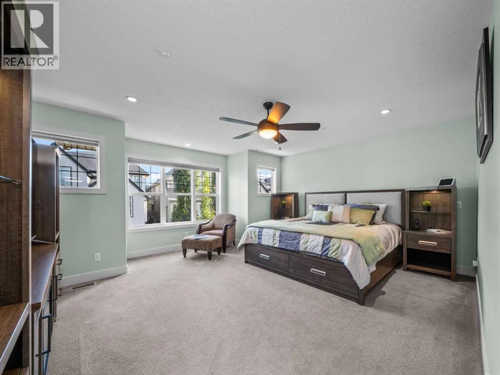 **OPEN HOUSE SATURDAY NOV 8TH 11AM - 2PM** Perfectly positioned directly across from Mahoganyâs coveted West Beach gate and steps from a family park, this Baywest estate home blends size, luxury, and lifestyle in Calgaryâs most award-winning lake community. Offering almost 3,150 sq ft and 4 bedrooms above grade, this property is designed for those who want space without compromise: oversized bedrooms, a bright bonus room wired with in-ceiling surround speakers and CAT5, and a stunning primary suite featuring a walk-in closet, spa-like ensuite with heated floors, and private retreat-like feel. Convenience is built in with an upper-level laundry room complete with sink, built-in cabinetry, and extra storage, making busy family life effortless. The main level combines functionality with sophistication: a chefâs kitchen with wall oven, gas cooktop, updated stainless steel appliances, and a butlerâs pantry that doubles as a prep hub or barista-worthy coffee station, all flowing into the dining and living area complete with a warm fireplace as the centrepiece. A fantastic covered back patio with built-in BBQ line extends your living space outdoors for cozy summer nights. A dedicated main-floor office creates a true work-from-home solution. Premium upgrades elevate every corner: Duette top-down/bottom-up blinds, smart lighting throughout, two furnaces with zoned A/C, a Vacuflow system, and a premium Kinetico water treatment system with water softener, all supported by recently serviced mechanicals for peace of mind. The lower level, with high ceilings and a roughed-in fifth bedroom, is ready for your future vision; add a sixth bedroom and still have room to create a recreation haven. Outside, the oversized double garage with bump-out offers ample room for tools, bikes, or toys. Beyond the walls, Mahogany sets the stage for Calgaryâs best lifestyle: a 63-acre freshwater lake, private beaches, skating, swimming, paddleboarding, a 22,000 sq ft Beach Club, 22 km of pathways, w etlands, parks, schools, and vibrant shopping and dining. This isnât just a homeâitâs a statement of living well in Calgaryâs most complete community. Donât forget to check out the virtual tour and book your private viewing today! MUST SEE IN-PERSON to truly get a feel for the size!! (id:27476)