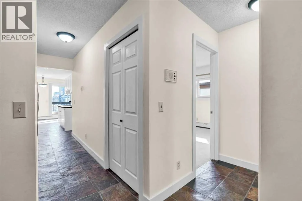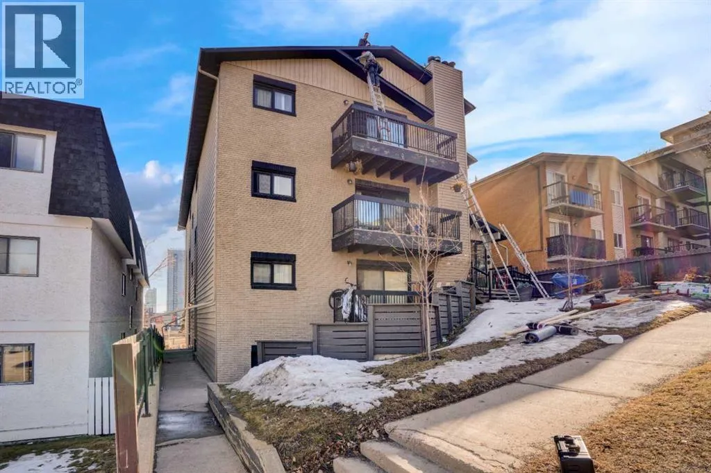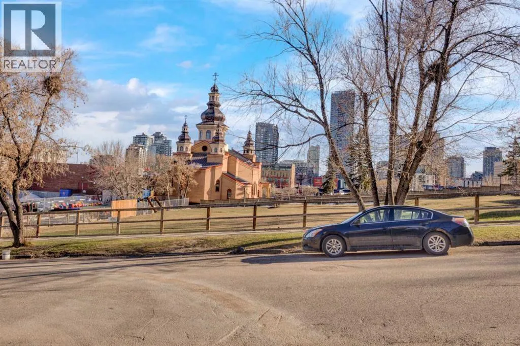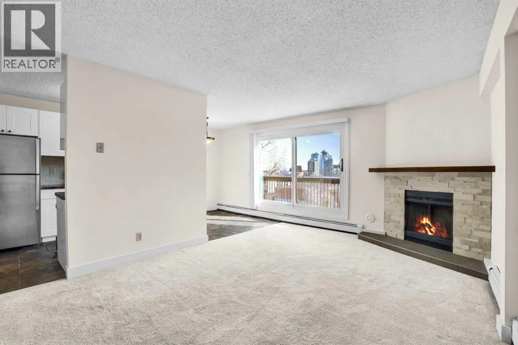 Gorgeous downtown views await from this top-floor condo in very good condition! Bathed in natural light from its south-facing exposure, this home features a sleek white kitchen with stainless steel appliances, slate floors, and large patio doors leading to a sunny 12' balcony. The spacious living room is a showstopper, offering panoramic city views and a charming corner wood-burning fireplaceâperfect for cozy evenings.With two generous bedrooms, in-suite laundry, and thoughtful updates throughout, this condo blends comfort and convenience. The location is unbeatable: just a quick stroll to downtown, the trendy Bridgeland cafés and restaurants, and the Bow River pathway system.This well-managed building offers peace of mind with recent upgrades including newer windows, balconies, patio doors, and a new roof (April 2024).Donât miss this opportunity to enjoy vibrant city living with style, views, and value! (id:27476)