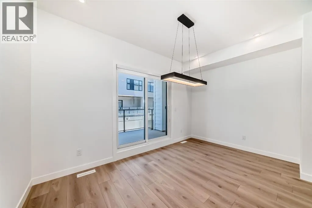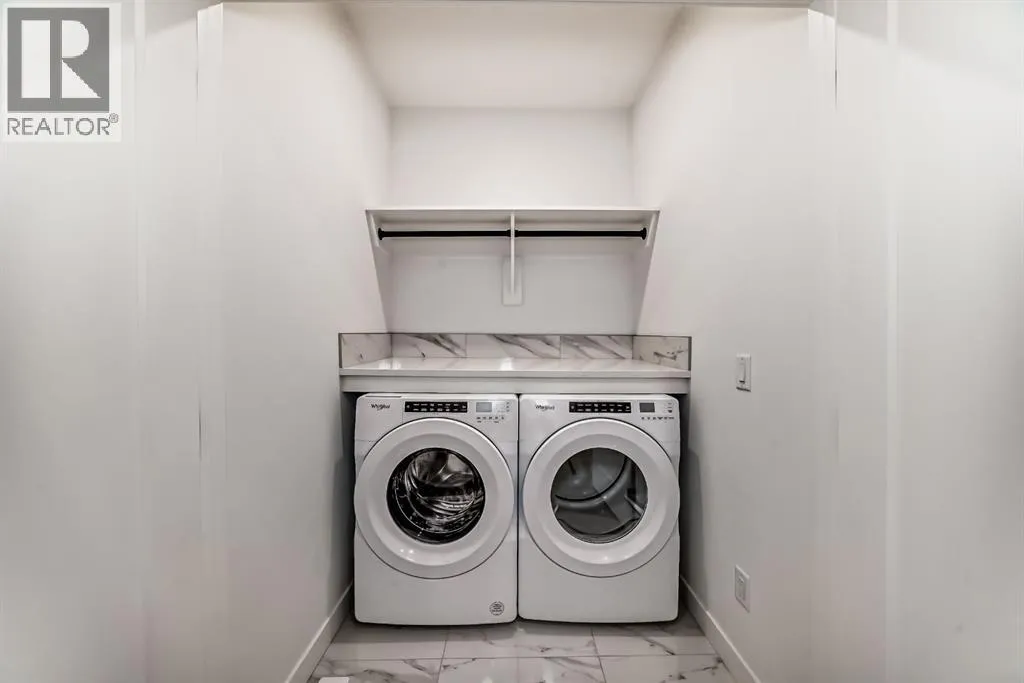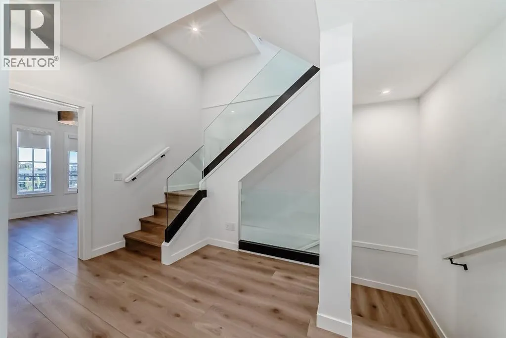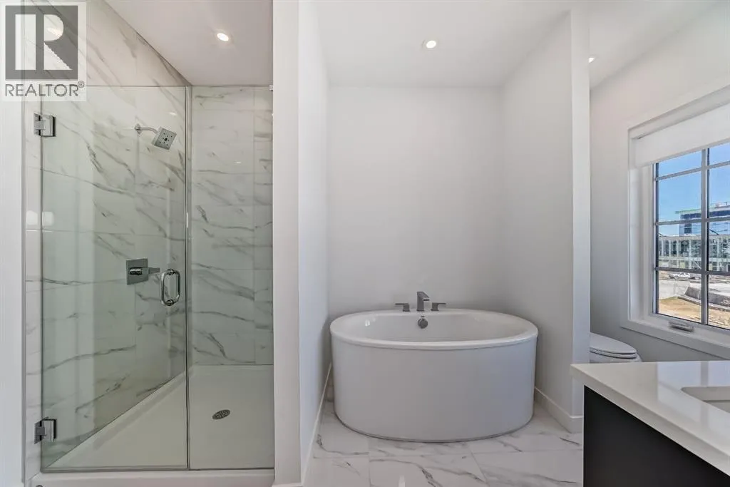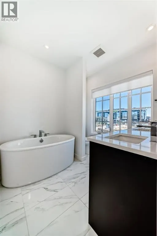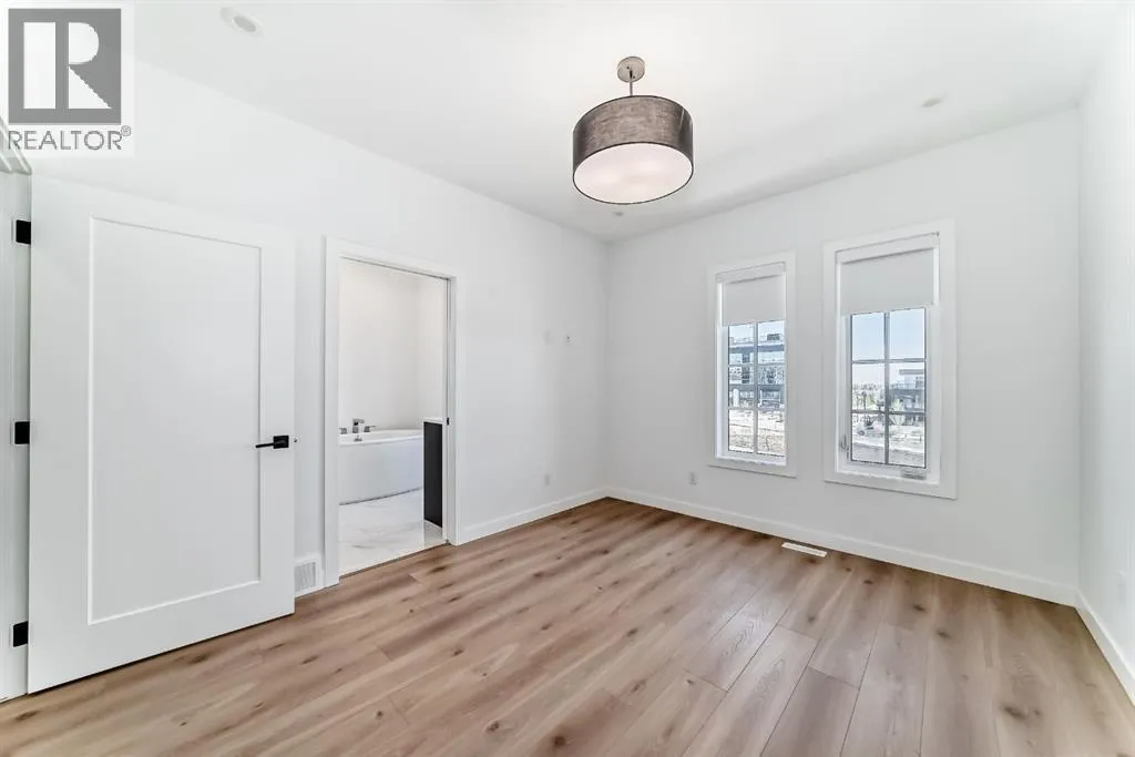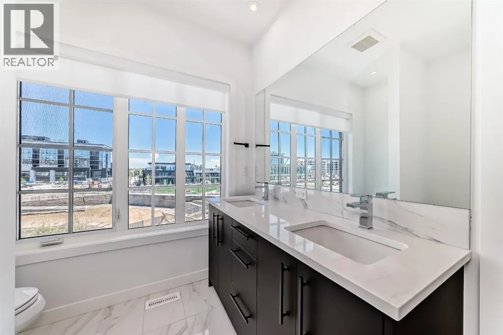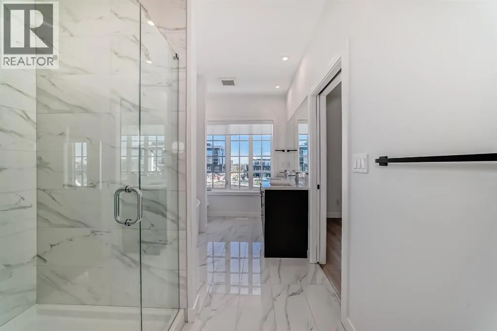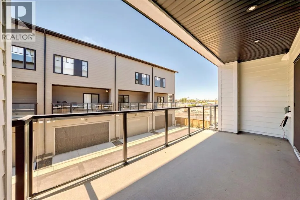 Experience the perfect blend of sophistication, style, and convenience at District Towns in Calgaryâs vibrant West District. This beautifully designed 2-bedroom, 2.5-bathroom townhome combines modern architecture with timeless interiors, all enhanced by an expansive rooftop terrace overlooking Radio Parkâa rare feature that truly sets this home apart.Thoughtfully crafted across three levels, this residence is ideal for those seeking a refined urban lifestyle. The main floor features a versatile flex room, perfect for a home office, fitness space, or creative studio, along with direct access to the attached double heated garage for ultimate convenience.The main living level is bright and inviting, with soaring ceilings, wide-plank flooring, and an open-concept layout designed for modern living. The chef-inspired kitchen is a showpiece, featuring full-height cabinetry with soft-close doors, a gas range, integrated refrigerator, built-in microwave, and a spacious pantry. A large eat-up quartz island anchors the spaceâperfect for casual dining, hosting friends, or enjoying a quiet morning coffee.Upstairs, youâll find two generously sized bedrooms, each with its own private ensuite for maximum comfort and privacy. The primary suite is a true retreat, featuring a walk-in closet and a stunning 5-piece spa ensuite complete with a freestanding soaker tub, tiled shower, dual vanities, and elegant designer finishes. The second bedroom offers its own stylish ensuite, making it ideal for guests or family. A conveniently located upper-floor laundry adds to the homeâs thoughtful design.Crowning this residence is the spectacular rooftop terrace, offering sweeping views of Radio Park and the West District skyline. This private outdoor space is perfect for summer barbecues, evening cocktails, or simply unwinding under the stars.Situated steps away from parks, pathways, boutique shops, and premium dining, District Towns deliver a connected, walkable lifestyle in one of Calgaryâs most exciting new communities. With TRUMANâs renowned craftsmanship and attention to detail, this home is more than a place to liveâitâs where you can truly Live Better (id:27476)