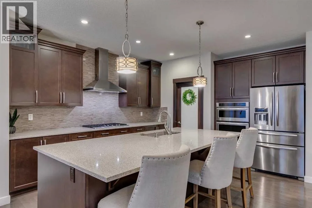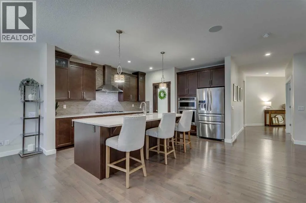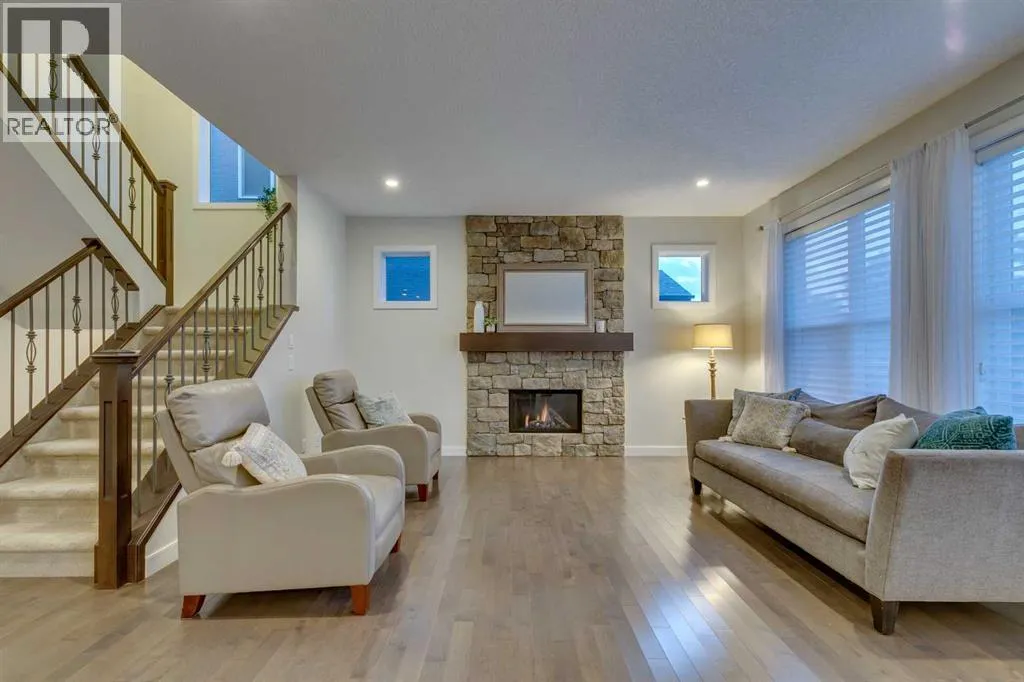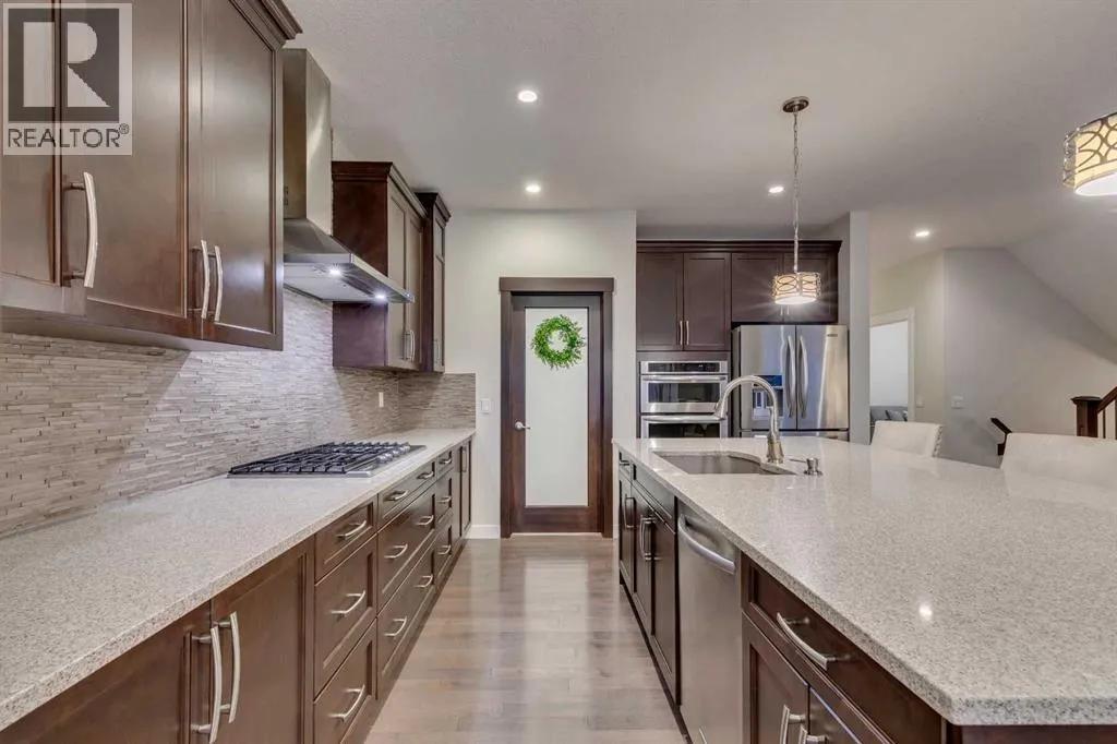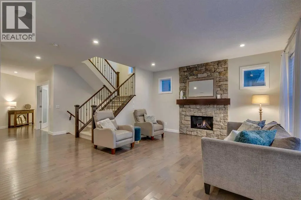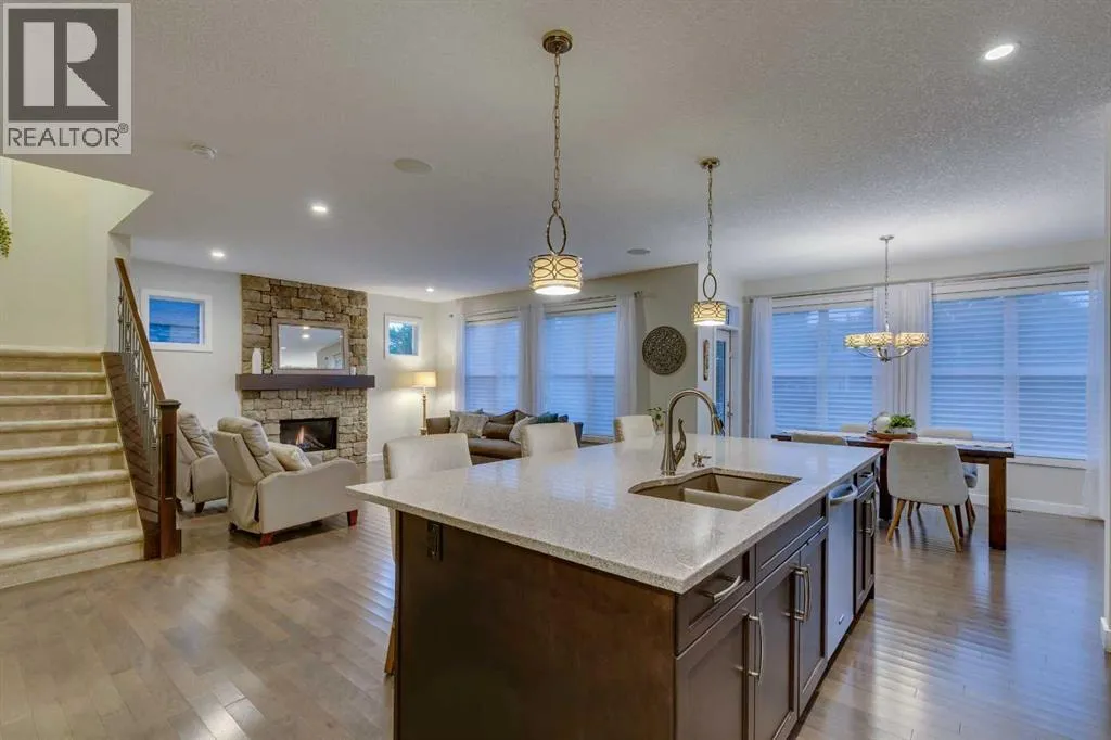 OPEN HOUSE - Sunday, November 16 3:00-5:00 - Step into this thoughtfully designed home in Mahogany and feel the space work for you from the moment you enter. A welcoming front entry leads into a dedicated officeâideal for remote work or studyâbefore opening into a spacious, light-filled main floor with 9â ceilings and rich hardwood floors. The open-concept layout is anchored by a full-height stone fireplace in the living room, complemented by in-ceiling speakers and large windows that bring in sunrise and sunset views. The kitchen is both stylish and highly functional, featuring an oversized island with quartz countertops, upgraded KitchenAid appliances, a marble backsplash, and extended cabinets with crown molding. A generous dining area leads directly to the fully fenced backyard, where a composite deck and stone patio offer low-maintenance outdoor living. The main floor wraps smartly around to a large pantry, mudroom with garage access, and a half bath for convenience.Upstairs, the primary suite offers a quiet retreat with a large ensuite that includes a 10mm glass shower enclosure, a soaker tub, and in-ceiling speakers. Two more bedrooms, an upper-floor laundry room, a full bathroom, and a bonus room (pre-wired for rear speakers) provide plenty of space for any lifestyle. The unfinished basement with 9' ceilings gives you the flexibility to create whatever you need nextâwhether thatâs a gym, home theatre, or extra bedrooms.Enjoy the added benefits of private dock access at 151 Mahogany Landing and semi-private beach access. Plus, you will be within walking distance to both Catholic and public elementary schools, and have quick access to two parks within a block of the home.Mahogany is Calgaryâs premier lake community, offering four-season activities, a private beach, stunning pathways, and a vibrant community feel. With shops, dining, and recreational amenities all nearby, youâll love the balance of city living and lakeside comfort this neighbourhood prov ides. You're not just purchasing a home, you're unlocking an entire lifestyle! (id:27476)
