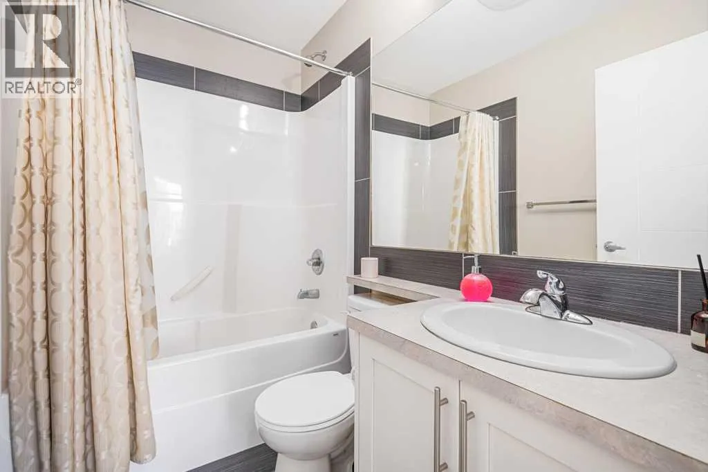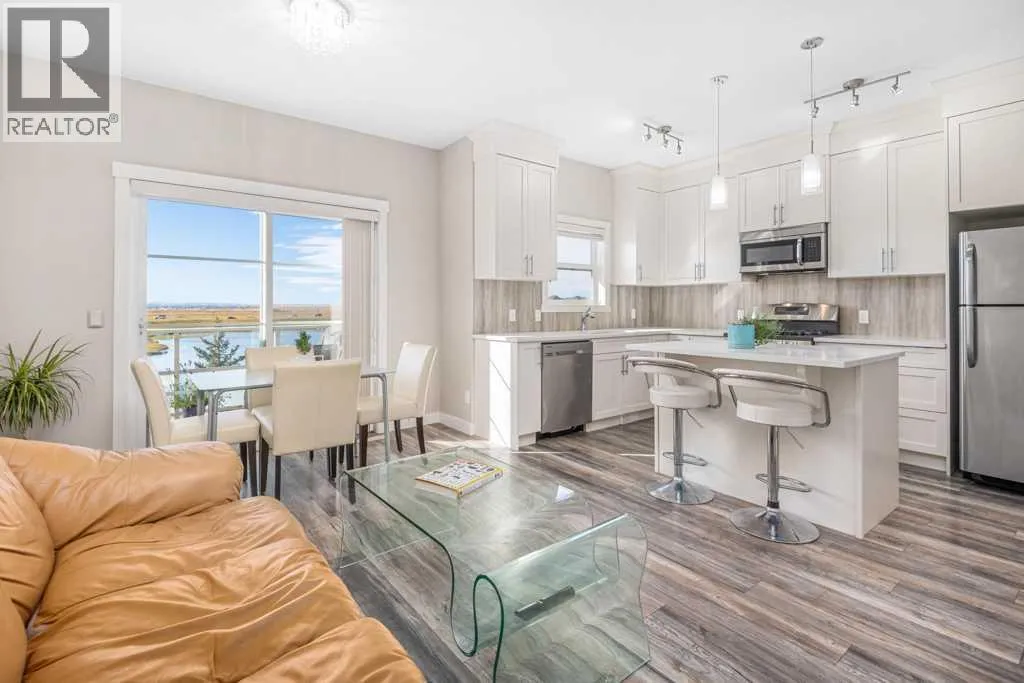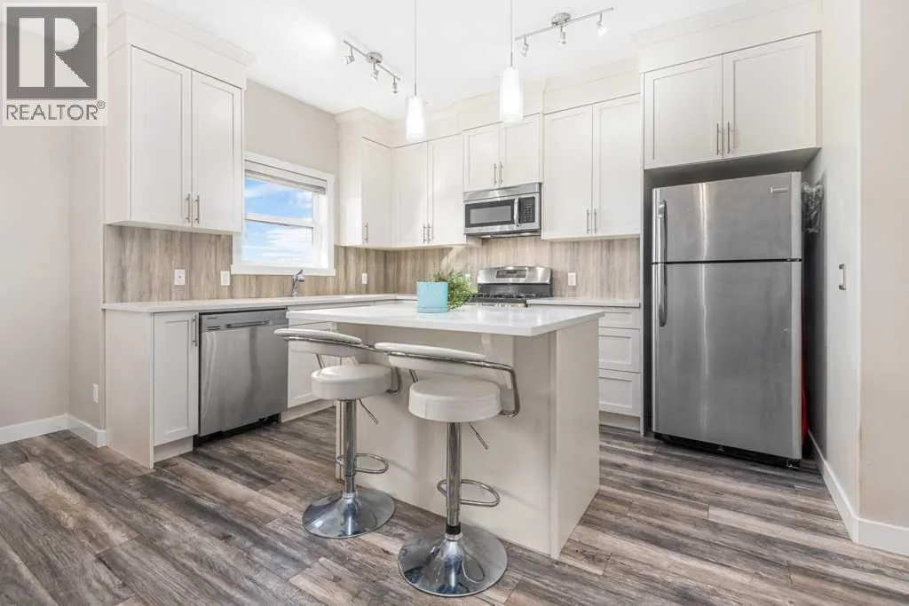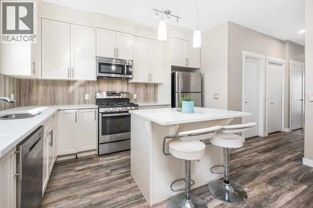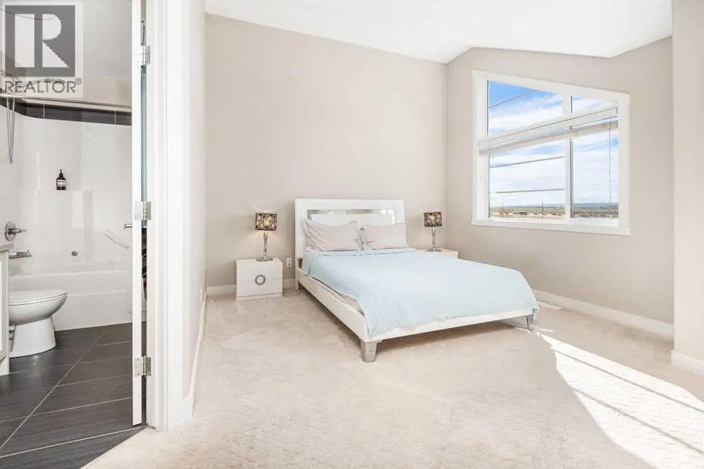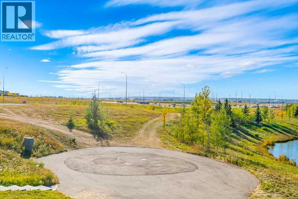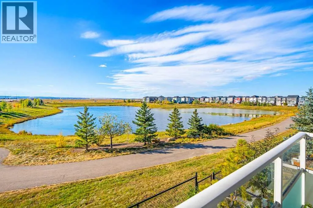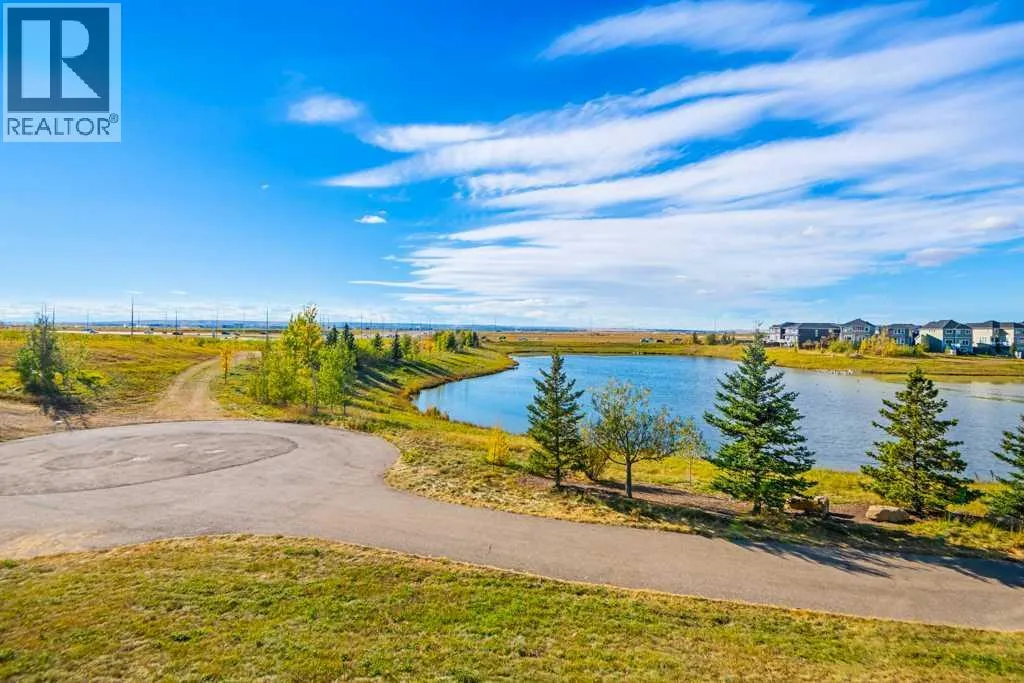 Welcome to this beautifully designed walkout townhome backing directly onto a tranquil pond and pathway system in the vibrant, amenity-rich community of Redstone. Offering low condo fees, Built Green® certification, and unobstructed mountain views, this home combines modern living with thoughtful sustainability.Step inside to discover soaring 9-foot ceilings and a bright open-concept main floor perfect for entertaining. The chef-inspired kitchen features upgraded 42â cabinetry, quartz countertops, a gas range, stainless steel appliances, and a generous islandâideal for casual dining and hosting. Step out onto your west-facing balcony, complete with gas lineâperfect for BBQs and enjoying sunset views over the pond and Rockies.Upstairs, youâll find two oversized primary suites, each with vaulted ceilings, private ensuites, and large windows framing peaceful water and mountain vistas. Upper floor laundry adds convenience to everyday living.The partially finished walkout level leads to a fenced and landscaped private patio backing onto the pondâyour own backyard oasis with immediate access to trails and greenspace. An attached single garage and additional storage complete the lower level.Perfectly located with quick access to Stoney Trail, Deerfoot Trail, the Calgary International Airport, and CrossIron Mills, this home is also just minutes from parks, playgrounds, Redstone View Lake, a future C-Train station, and a new school currently planned within walking distanceâmaking it ideal for families and future resale value.Whether youâre looking for your first home, a downsized lifestyle, or a low-maintenance investment in a growing community, this home offers mountain views, nature on your doorstep, and effortless connectivity. Your Redstone lifestyle begins here. (id:27476)