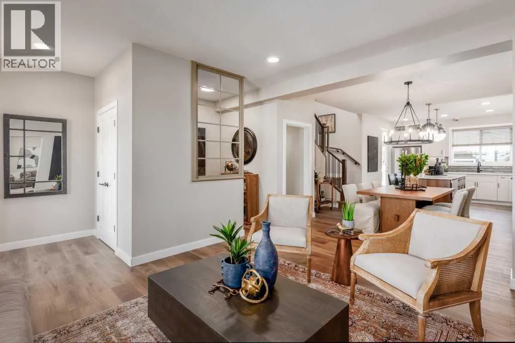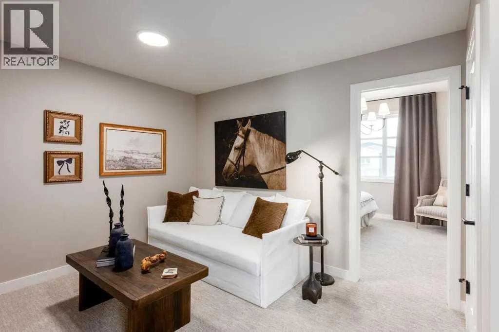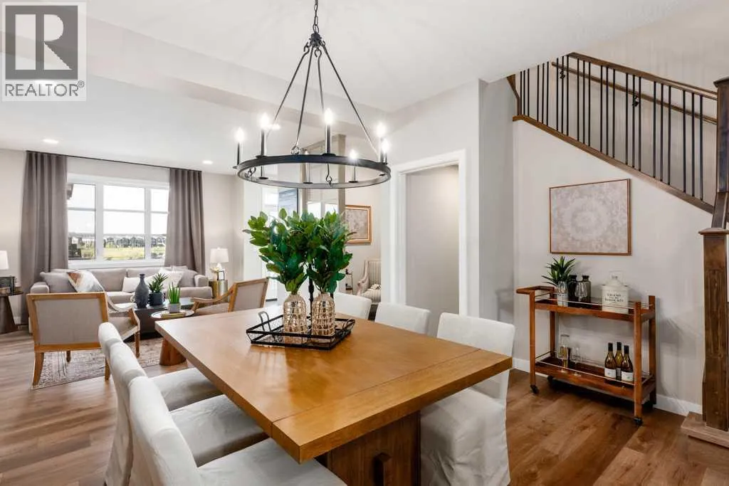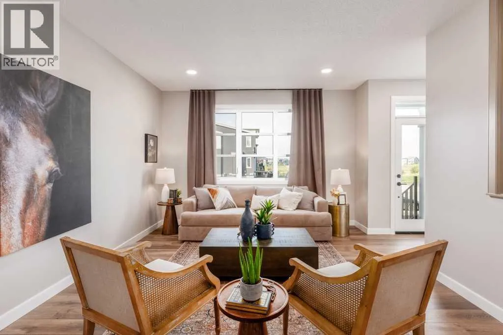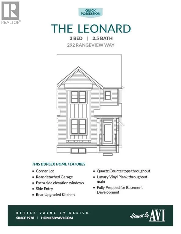 CORNER LOTS CHANGE HOW A DUPLEX LIVES: more presence on the street, MORE WINDOWS, andâbest of allâA REAL SIDE YARD that makes the whole property feel wider and calmer. At 292 Rangeview Way SE, that corner advantage shows up every day: sunlight wraps the main floor, sightlines feel open instead of boxed-in, and the outdoor space stretches along the side of the home, giving you room for gardens, play, or just more breathing room than a typical lot. The DETACHED 20'Ã20' DOUBLE GARAGE off the lane is the clincher; in this category itâs not a given, and it keeps everyday life tidyâvehicles inside, gear organized, sidewalks clear.Inside, the plan is built for daily ease across roughly 1,642 sq. ft. above grade. A rear kitchen anchors the main floor so cooking stays connected to the dining area and living room. QUARTZ COUNTERS hold up to family traffic, 42" UPPER CABINETS keep counters photo-ready, and a CHIMNEY HOOD + BUILT-IN MICROWAVE free the workspace. The electric range is installed for move-in simplicity, with a gas line roughed-in if you prefer to switch later. LUXURY VINYL PLANK through the main keeps the flow durable and easy to clean; upstairs, carpet softens bedrooms and the loft. The palette runs warm and modernâgrey cabinetry, a soft-stone quartz tone, cloud-matte tile, and a calm, fresh wall colourâso your furniture slides right in.Future-ready matters here. 200-AMP SERVICE means capacity for lifeâs add-ons; EV CHARGER ROUGH-IN and SOLAR PREP keep options open. 9' FOUNDATION WALLS stretch the lower levelâs usefulness. A SIDE ENTRY plus ROUGH-INS FOR LAUNDRY, SINK, AND A BATHROOM make future basement development straightforward (think private, flexible living space without reworking the structure). Extra lighting on the main, a 5'Ã2' stairwell window, and front yard landscaping round out the everyday wins. Out back, the 10'Ã10' DECK and gas line to the BBQ turn evenings outside into a habit rather than a plan.The upstairs gets the rhythms right: a brigh t primary with a walk-in closet, secondary bedrooms sized for real furniture, upper-level laundry where it belongs, and a BONUS ROOM that pivots effortlessly between work, play, or reading chair. Construction choices are built to last, including HARDIE SIDING ON THE FRONT ELEVATION and the efficiencies you expect in a new build.Set in Rangeview Springsâthe newest phase of Rangeview by Genstarâthe streets feel connected and human-scaled, with canopy-style pathways linking pockets of green so weekend walks start at your front step, not the car door. Possession is set for late October 2025. Walk the lot lines, step inside, and youâll feel why this corner lives larger than most. ⢠PLEASE NOTE: Photos are of a finished Showhome of the same model â fit and finish may differ on 292 Rangeview Way SE. Interior selections and floorplans shown in photos. (id:27476)