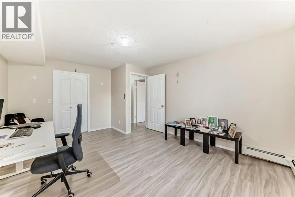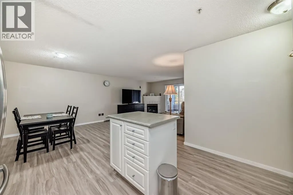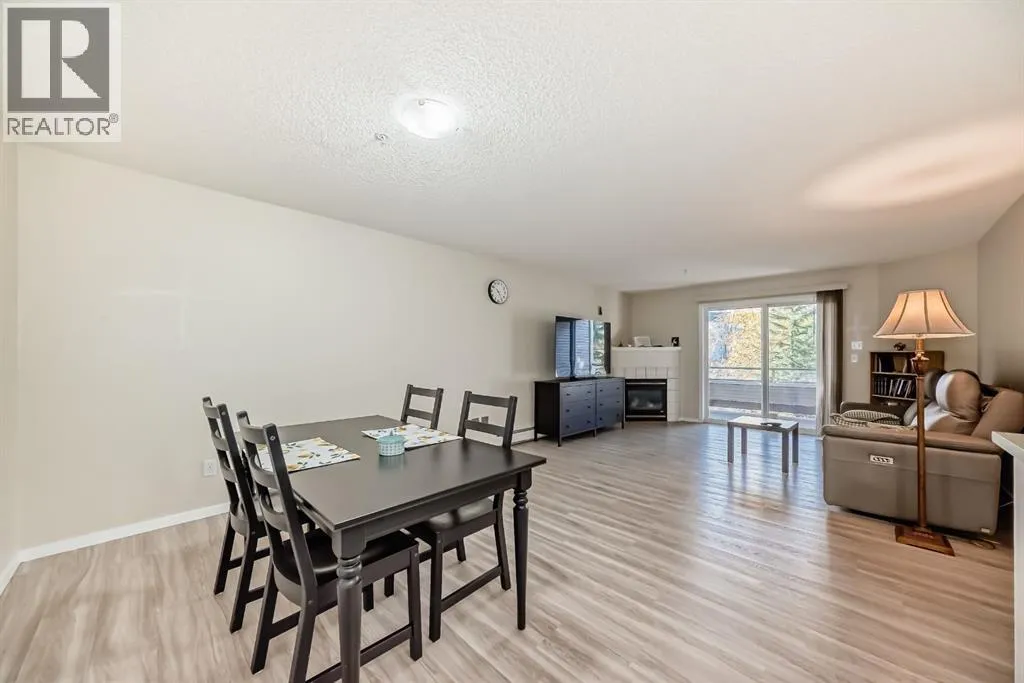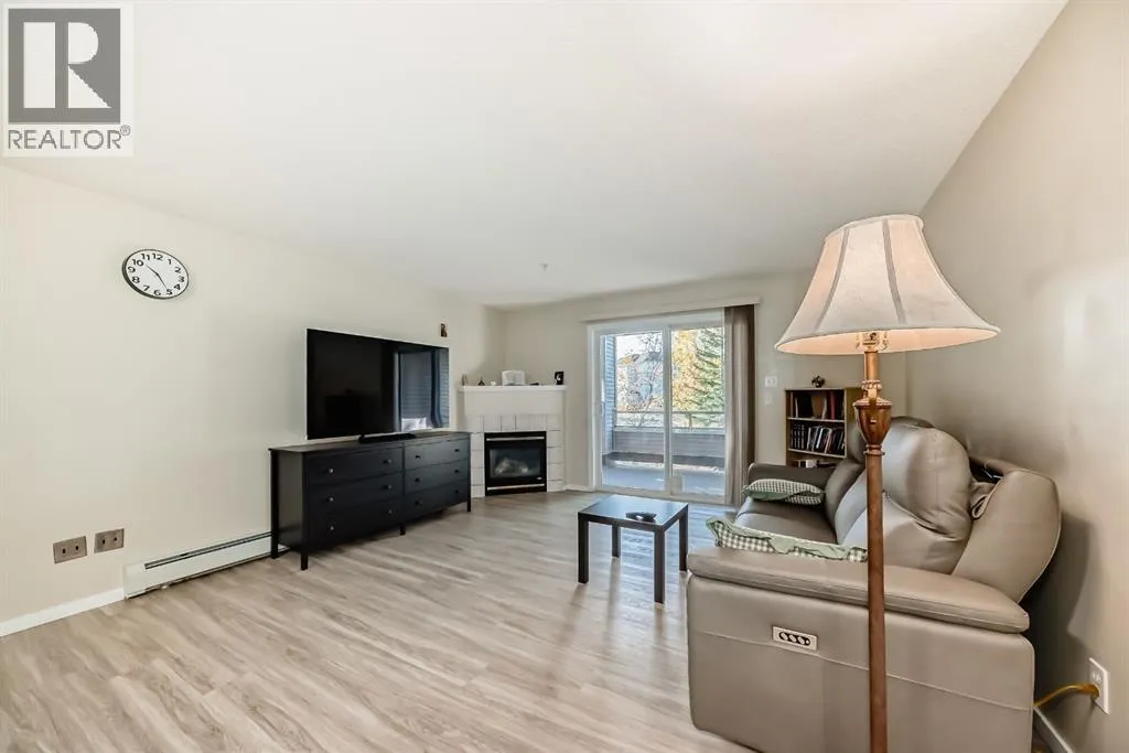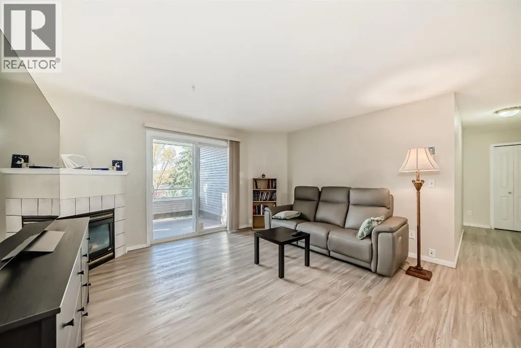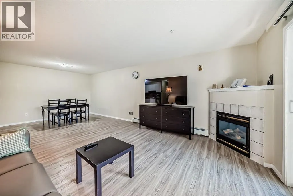 Welcome to the sought-after Malibu floor plan, the largest two-bedroom, two-bathroom condo in the building â freshly painted in warm, neutral tones and move-in ready!Step inside to an expansive living room with a cozy corner fireplace and built-in surround sound wiring, opening onto a large private deck overlooking the tranquil fountain and courtyard. The bright, open kitchen flows seamlessly into a generous dining area that easily seats 6â8 people, perfect for entertaining.The primary suite offers a spacious bedroom, walk-through closet, and private 4-piece ensuite. A second oversized bedroom sits next to another full bathroom â ideal for family, guests, or a home office.Youâll love the in-unit storage and laundry room with washer & dryer included. Condo fees conveniently cover heat and electricity, adding value and peace of mind.Parking is easy with an assigned stall plus an additional pass for street parking.Unbeatable location â just steps to the C-Train, YMCA, library, shopping, restaurants, and movie theatre. (id:27476)