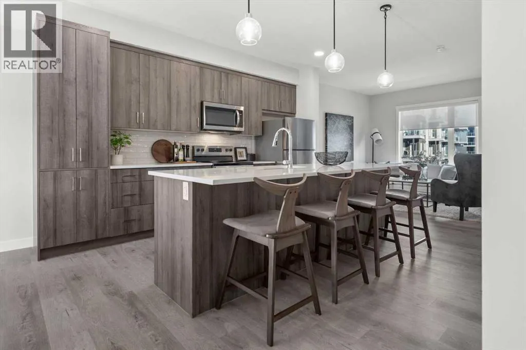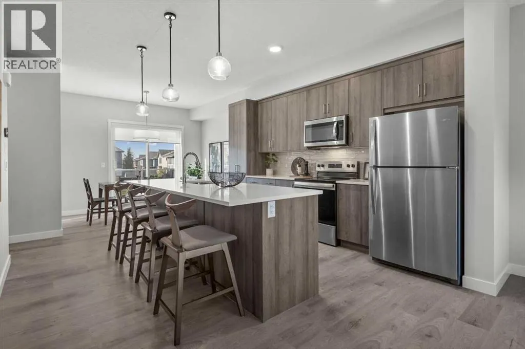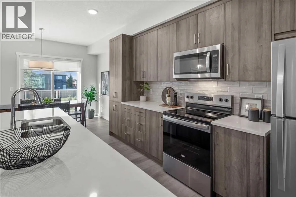 Discover contemporary living in this brand-new 2025-built townhome, ideally situated in the sought-after community of Shawnee Slopes in Southwest Calgary. With over 1,440 sq ft of thoughtfully designed space, this 3-bedroom, 2.5-bath home seamlessly combines modern style with everyday functionality. The open-concept main floor showcases a sleek, modern kitchen featuring rich cabinetry, premium stainless steel appliances, a built-in pantry, crisp white quartz countertops, and an oversized island thatâs ideal for casual dining or entertaining. Dedicated west facing dining space and a bright spacious east facing living room allow sunshine to be enjoyed at all times of the day! Durable luxury vinyl plank flooring throughout all three levels creates a clean, cohesive aesthetic, while a neutral colour palette adds to the homeâs timeless appeal. Step outside to a private west-facing balcony with no neighbours behind, complete with a gas lineâperfect for effortless outdoor cooking and relaxation. Upstairs, youâll find a well-appointed primary bedroom with ensuite, two additional well-sized bedrooms, full bath and the convenience of upper-level laundry. Additional highlights include air conditioning rough-in, a custom blind package, upgraded wall tile detailing in upper bathrooms, and an attached double tandem garage with extra storage and backyard access. Perfectly positioned near public transit, the CTrain, top-rated schools, shopping, dining, and the natural beauty of Fish Creek Park, this location also provides easy access to Stoney and Macleod Trail, the nearby YMCA, Costco and weekend getaways to the mountains.Whether you're a first-time buyer, investor, or looking for your next home, this pet-friendly property is a rare opportunity to own a brand-new townhome in one of Calgaryâs most established and connected neighbourhoods. (id:27476)