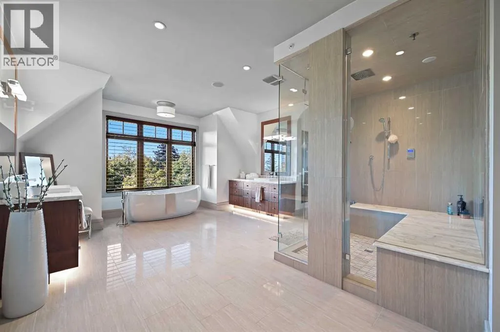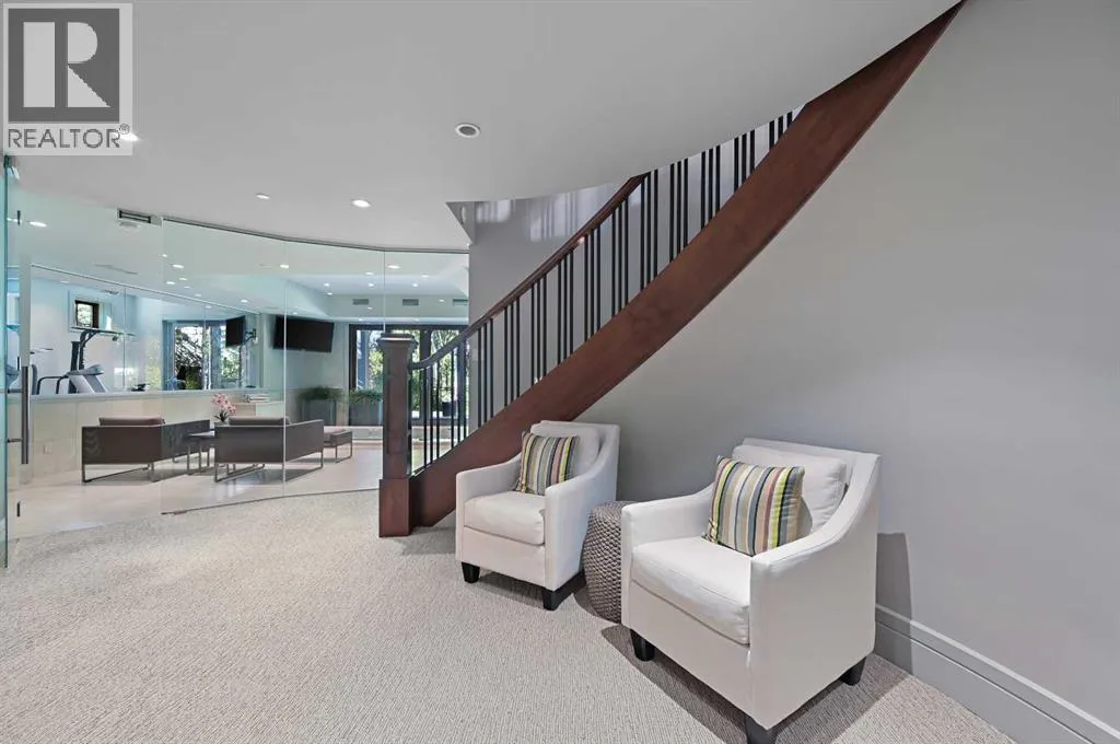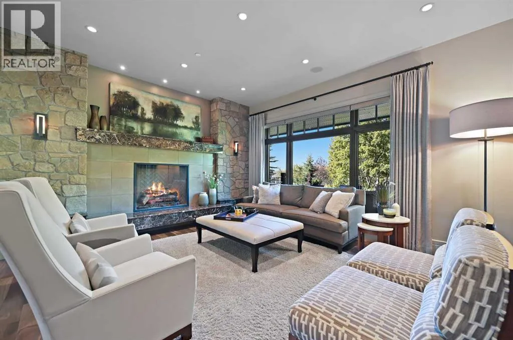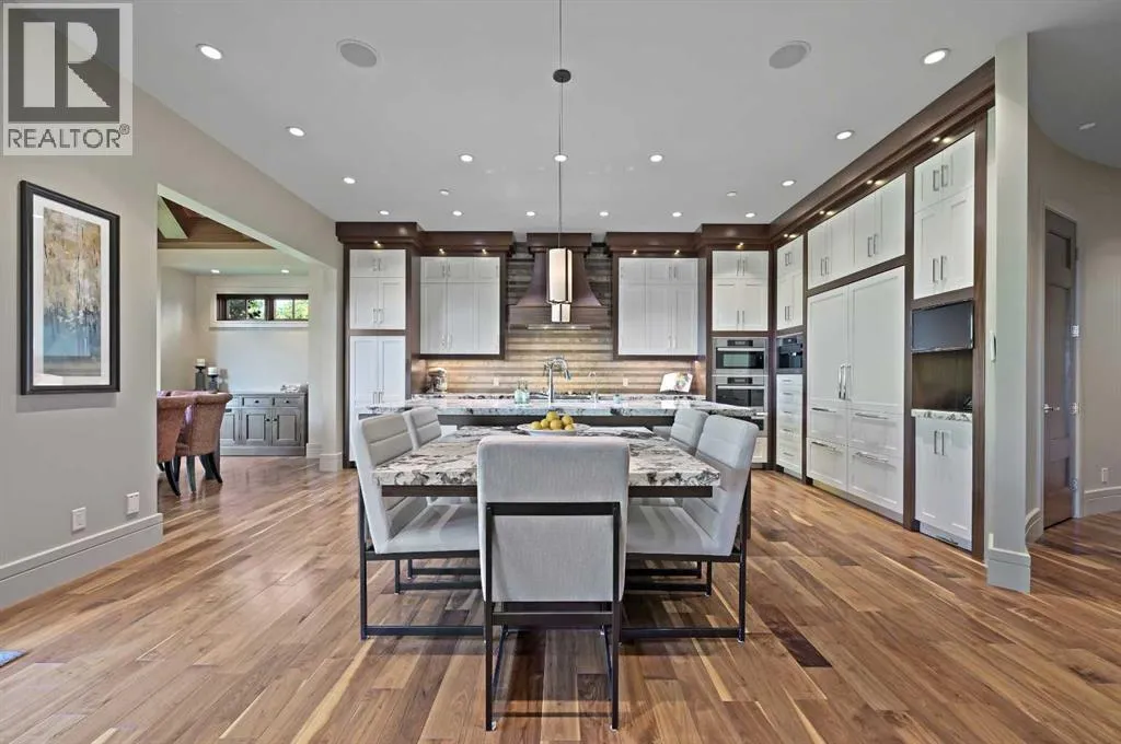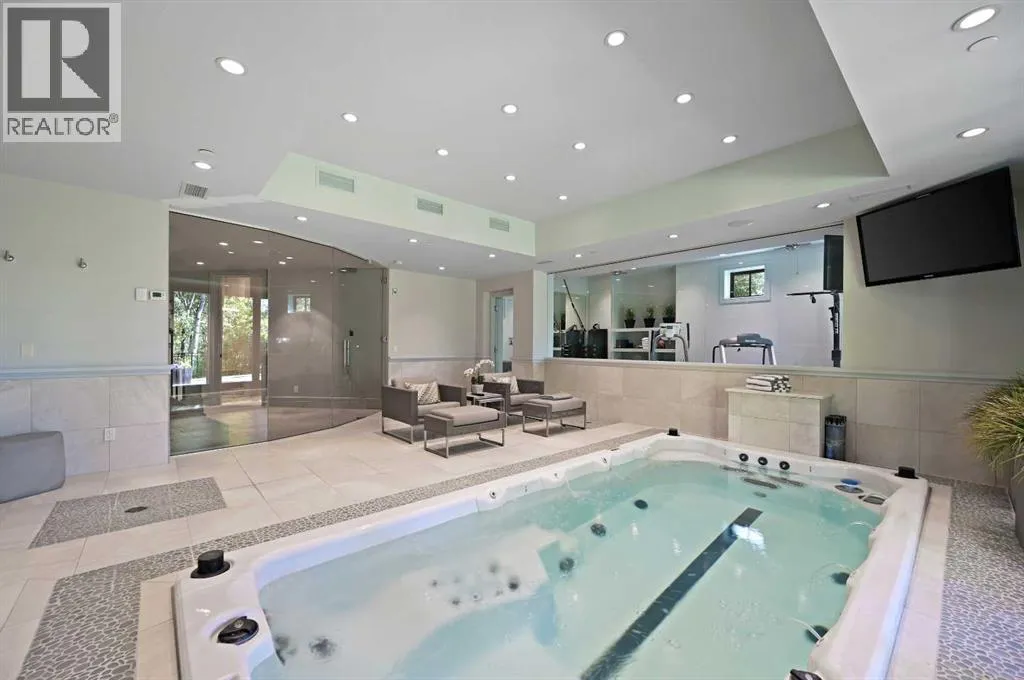 Nestled within the prestigious enclave of Springbank Valley Heights, this exceptional custom-built estate embodies understated luxury and timeless sophistication.Spanning over 7,500 square feet of exquisitely designed living space on a 12,604 sq. ft. lot, every detail of this residence reflects a deep commitment to craftsmanship and elegance.The stately stone exterior and charming front veranda create a distinguished first impression, while the grand foyerâwith its sweeping curved staircase and polished hardwood floorsâsets the stage for the refined interiors beyond. Designed for both culinary excellence and intimate entertaining, the gourmet kitchen features professional grade Viking and Miele appliances, including a gas range, an additional speed oven that doubles as a microwave, espresso machine, triple dishwashers, and a large double Sub-Zero fridge that complements the kitchenâs exceptional functionality.Granite countertops and custom cabinetry elevate the space, while the great room exudes warmth and sophistication, showcasing a custom granite stone fireplace that creates a âChic Chaletâ ambiance reminiscent of an upscale mountain retreatâperfect for gathering and relaxation. This space flows into the adjacent dining room, distinguished by its vaulted ceiling with custom wood inlay and uninterrupted ravine viewsâan inspiring setting for hosting or intimate evenings, framed by expansive windows that open to a serene west-facing backyard. Outside, an inviting new tile patio with a built-in BBQ and wood-burning fireplace creates a seamless extension of the homeâideal for alfresco dining and evening conversation as the sun sets over the ravine. A private home office with custom millwork provides a peaceful retreat for productivity, while the heated triple-car garage with its own furnace offers direct access to a spacious media lounge complete with wet bar, two-piece bath, and home theatre setup. Upstairs, the primary suite is a sanctuary of calm with a spa-inspire d 6-piece ensuite featuring a steam shower, dual vanities, and a meticulously designed walk-in closet.Two additional bedrooms, each with private ensuites, are complemented by a full upper-level laundry room for convenience. A second laundry area on the main level adds thoughtful functionality.The walkout lower level caters to wellness and leisure, showcasing a training pool enclosed in glass-a space that feels like a private spa, complete with bar fridge and freezer drawers, alongside a fully equipped fitness room and two additional bedrooms, each with a full bath.Thoughtfully appointed with in-floor heating, triple furnace systems, and a comprehensive fire suppression system, this residence offers a rare combination of advanced safety, comfort, and timeless style.Privately positioned against the ravine and just minutes from Aspen Landing and Stoney Trail, this is more than a homeâit is a statement of enduring quality, designed for those who appreciate refinement, privacy, and elegance in every detail. (id:27476)