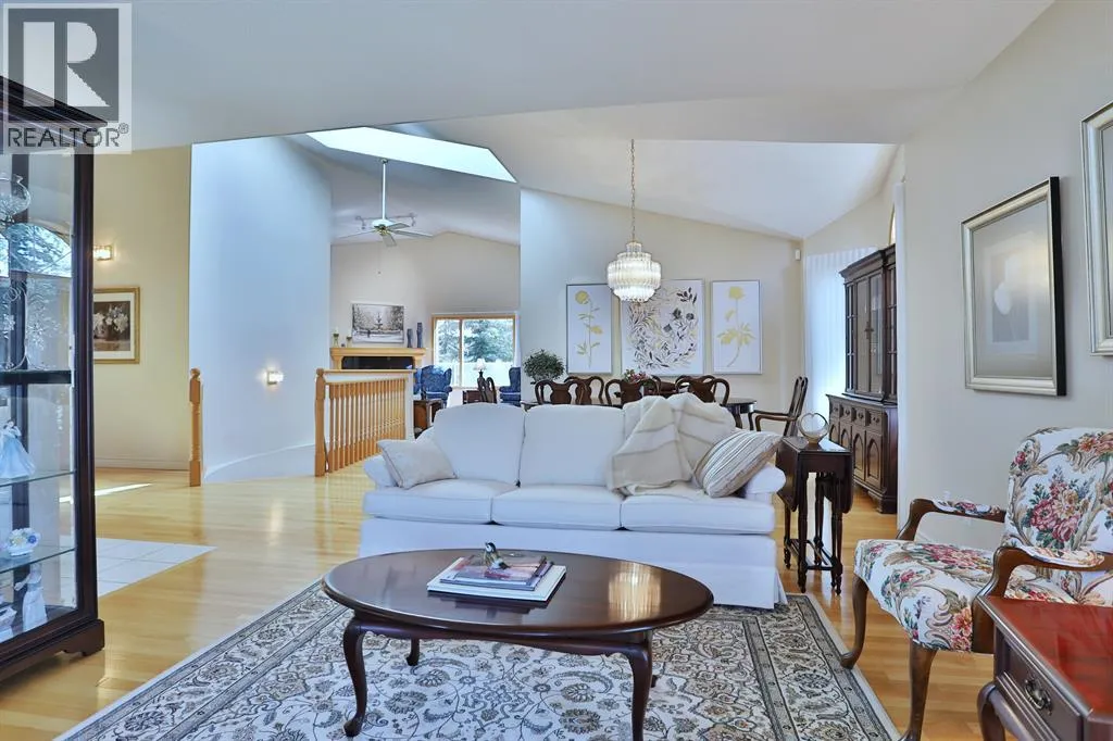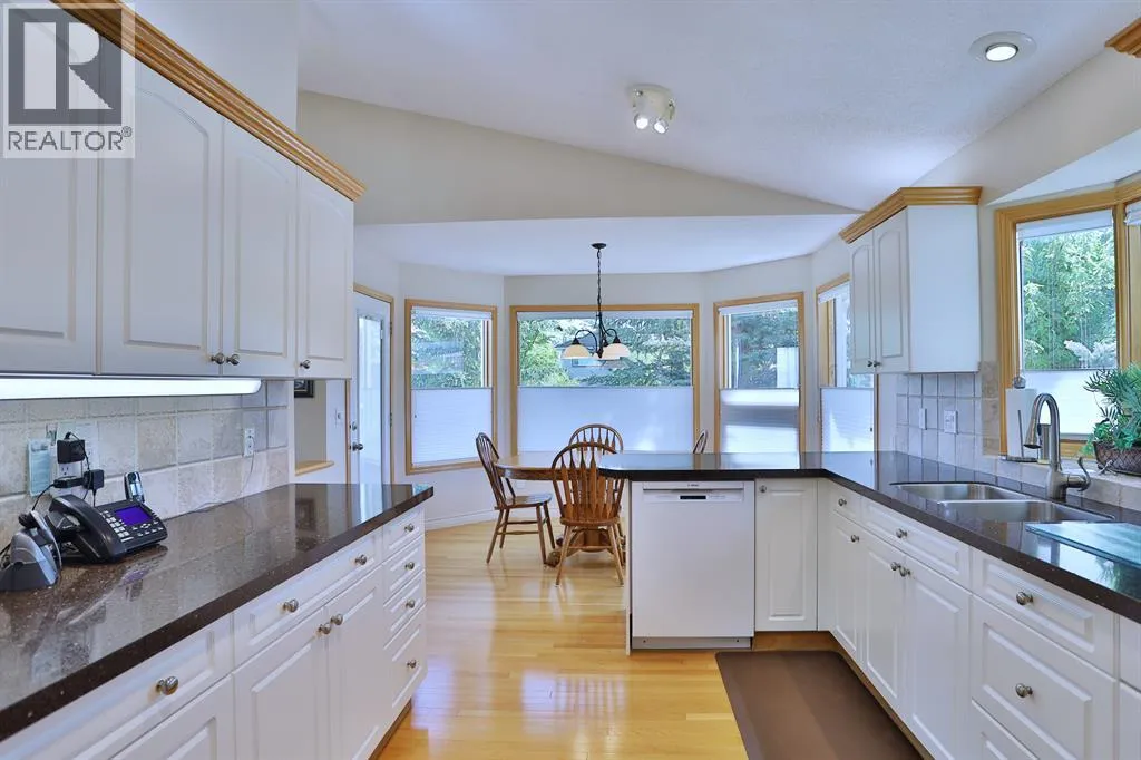 Backing onto a park in exclusive Hamptons Square is where youâll find this beautifully maintained home in the highly-desirable golf course community of the Hamptons. Built by Calbridge on this wonderful corner lot, this mint condition walkout bungalow enjoys gleaming hardwood floors & skylights, 4 bedrooms & 3 full bathrooms, renovated white kitchen with granite countertops & fabulous walkout level with sensational enclosed patio. You will just love the warm & inviting design of the air-conditioned main floor with its expanse of vaulted ceilings & windows, featuring the West-facing living room with wraparound windows, open concept formal dining room with bay window & sun-drenched family room with new fireplace (2022). The beautiful updated kitchen has granite counters, walk-in pantry & the upgraded appliances include cooktop stove, double built-in convection ovens & Bosch dishwasher. Two bedrooms & 2 full baths on the main floor highlighted by the private owners' retreat with large walk-in closet & jetted tub ensuite with heated floors, skylight & separate shower. The 2nd bathroom - also with heated floors, is conveniently right across from the 2nd bedroom. The walkout level is finished with 2 big bedrooms, full bath with oversized walk-in shower, huge open games/rec room with fireplace & fabulous enclosed patio with access onto a 2nd patio in the private treed backyard. Main floor laundry room complete wit sink, lots of closet space & Bosch washer & dryer. Additional features & extras include Hunter Douglas blinds, NEST thermostats & CO/smoke detectors, motion & hue lights, underground sprinklers, heat lamps in the main & walkout bathrooms, oversized 2 car garage with built-in cabinets & central vacuflo system with 3 hoses (2 for the house & 1 for the garage). Other improvements: clay tile roof (2022), renovated bathrooms with quartz counters (2015), hot water tank (2019), both furnaces (2017), water softener (2014) & window glass (2017). Prime location within walk ing distance to bus stops & tennis courts, only a few short minutes to shopping at Hamptons Co-op & Edgemont Superstore, plus quick easy access to Nose Hill Park, Crowfoot Centre & LRT, major retail centers, University of Calgary, hospitals & downtown. (id:27476)