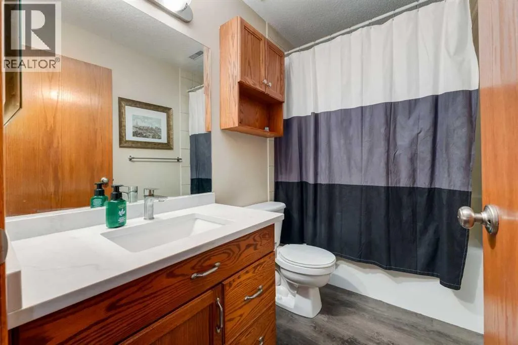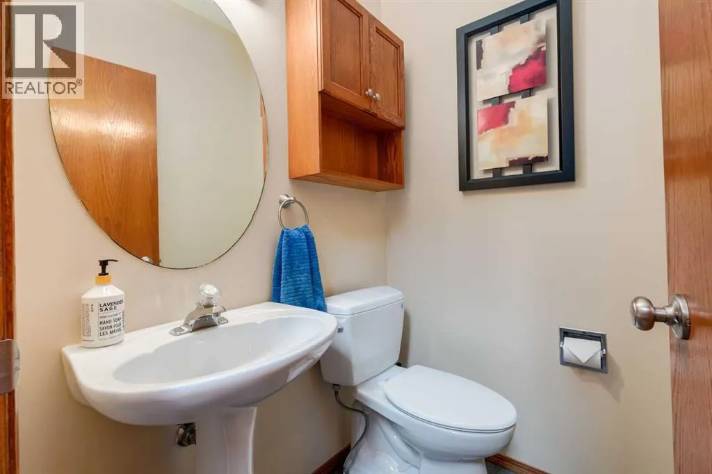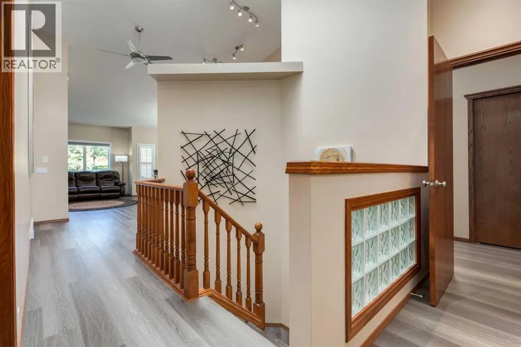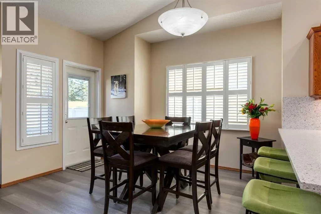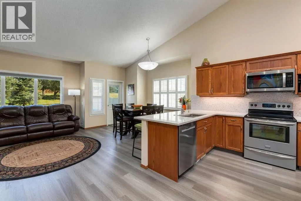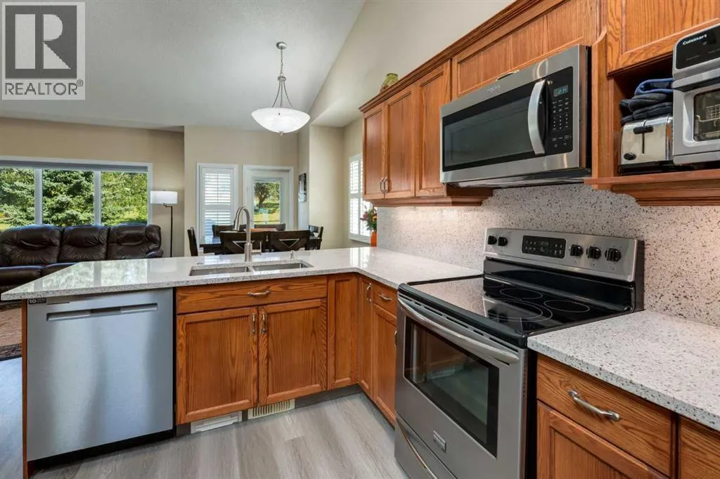 This fully developed BUNGALOW in the established Millrise neighbourhood has been UPDATED extensively over the past 5+ years, with almost 2500 square feet of developed space over two levels. There is a long list of quality interior and exterior improvements. Nicely located on a quiet CUL-DE-SAC with a pie shaped lot backing onto GREEN SPACE, the home has abundant curb appeal with a full exterior update by Lummerding Exteriors in 2022, including âheavy wall vinylâ and âclass 4â hail impact roof shingles. The double attached garage is heated and finished with âTrimlightâ LED lights on front & back of home. The main floor is an open concept layout with VAULTED CEILINGS in primary bedroom, foyer, living, dining, and kitchen areas, plus a skylight. Interior features include updated luxury plank vinyl flooring, custom window coverings, quartz countertops, several updated windows, chrome finish hardware, and updated light fixtures. The kitchen includes a pantry with stainless appliances and adjacent dining area plus eating bar. The exterior door off the living & dining area opens onto a HUGE DECK and backyard siding onto GREEN SPACE with walking paths. There is a large, newer window in the family room with a gas fireplace with fan. The primary bedroom offers a walk-in closet and 5-piece ensuite bath with jetted tub and separate shower. The main floor also includes a den with a glimpse of mountains, convenient half bathroom, and laundry room with newer washer & dryer and back hall closet. The lower level includes a four piece bathroom, two spacious bedrooms and recreation room, each with walk-in closets. If you are looking for a home in MOVE-IN CONDITION and QUIET LOCATION, this property is ready for new owners. (id:27476)