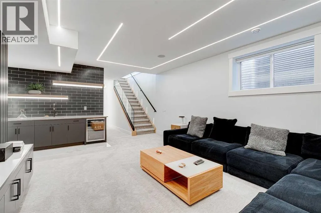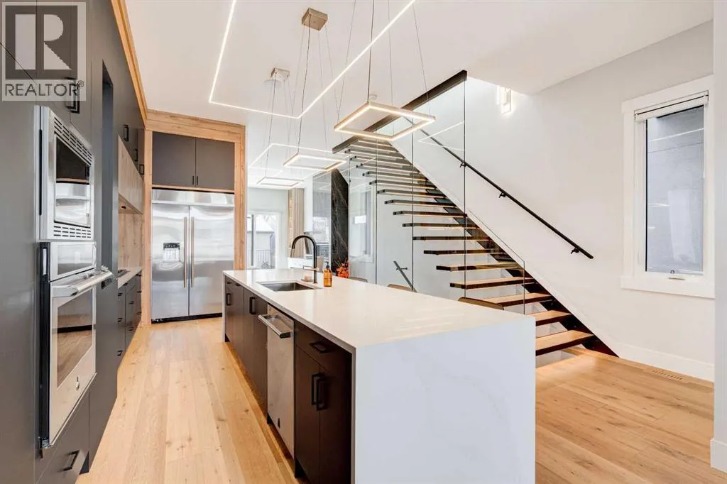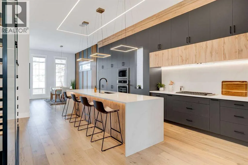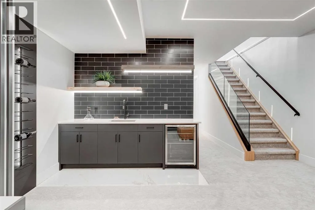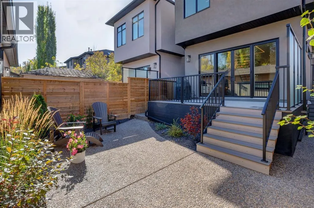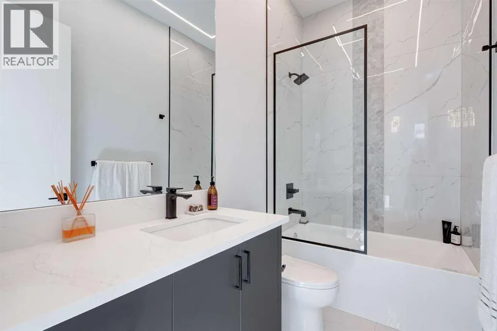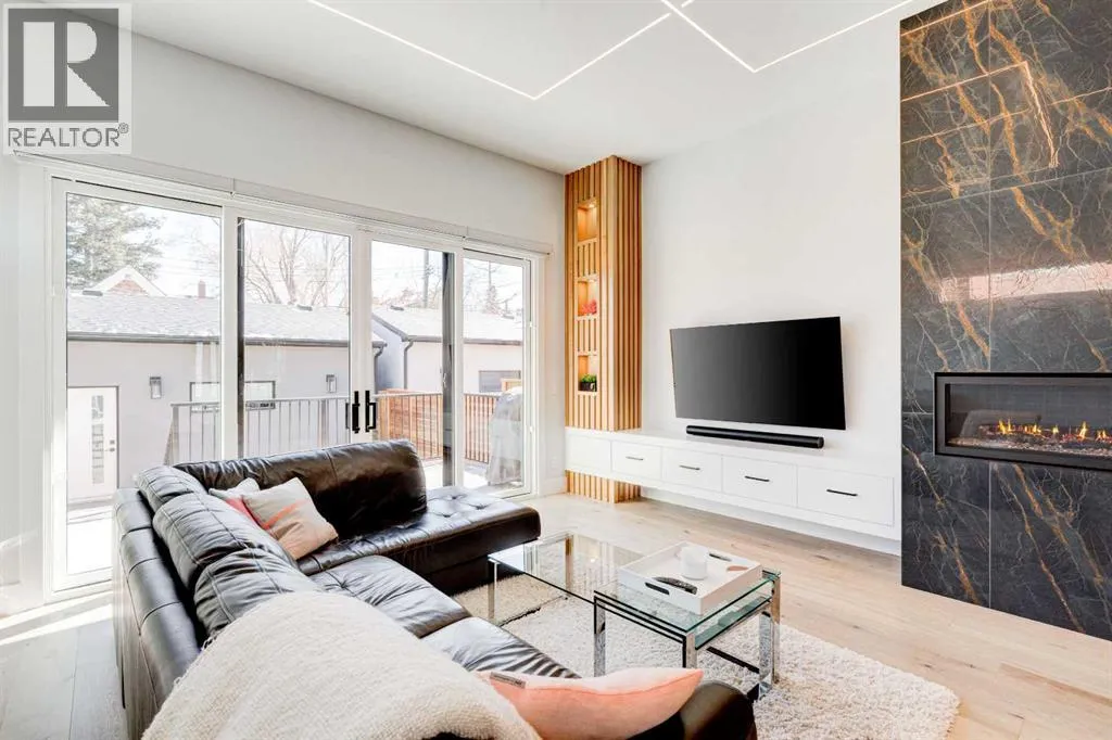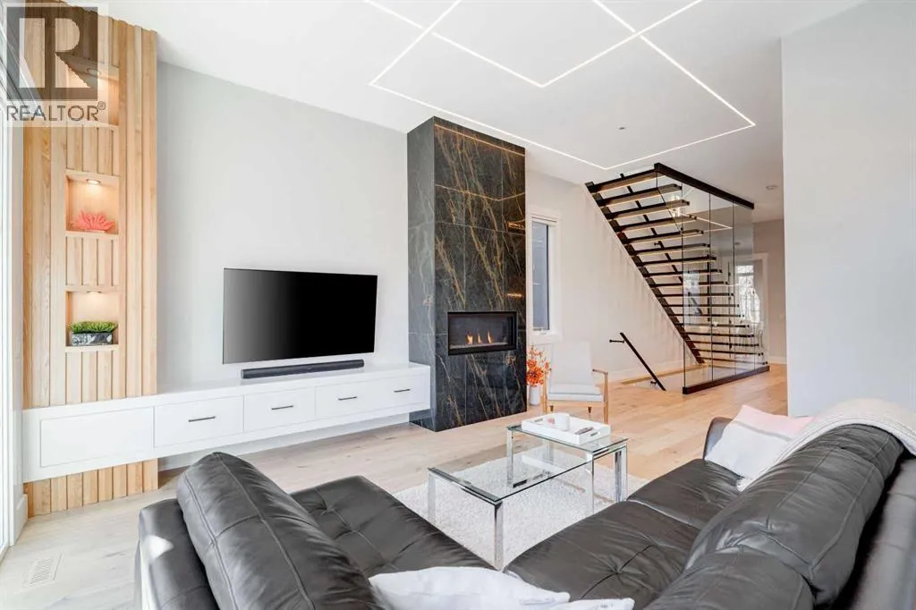 Step into refined luxury in this stunning modern home, perfectly situated in UPPER MOUNT ROYAL! Designed for effortless living, this 4-bed, 3.5-bath masterpiece offers endless impeccably crafted living space w/ high-end finishes and upgrades throughout! The striking brick exterior, lush artificial turf, and integrated lighting create an unforgettable first impression. Inside, the foyer welcomes you w/ soaring ceilings, wide-plank hardwood floors, and a stylish built-in bench w/ wood slat wall. A bright, open dining space w/ designer lighting and modern wood accented wall flows seamlessly into the high-end kitchen, a true showstopper w/ a massive waterfall quartz island, full-height flat panel cabinetry, and premium appliances. The sleek black and wood-accented cabinetry is complemented by under-cabinet lighting and island pendants that add a warm, inviting glow. The living room is anchored by a statement fireplace w/ floor-to-ceiling black marble w/ gold veining, creating a sophisticated yet cozy retreat. A wall of sliding glass doors extends the living space onto the deck, where extra-wide steps lead to the beautifully landscaped backyard featuring PRIVACY SCREENS, landscape lighting, and underground sprinklers for easy maintenance. An elegant powder room w/ a black vessel sink and a side mudroom w/ built-in storage round off the main level. A custom glass-enclosed staircase w/ open riser stairs and LED accent lights leads to the second floor, where the primary retreat is a true sanctuary. The spacious bedroom features modern ceiling lighting, arched windows, a sliding barn door, and a spa-inspired ensuite. The ensuite is a masterpiece w/ black and gold-veined marble, a freestanding tub, a glass-enclosed STEAM SHOWER w/ a rainfall head, and HEATED FLOORS for ultimate comfort. Two additional bedrooms, a sleek 4-piece bath w/ upgraded shower glass and heated floors, and a well-appointed laundry room w/ extra storage, a sink, and geometric tile flooring complete this level. The fully finished basement is the ultimate entertaining space, featuring a spacious media room w/ a built-in entertainment unit, a stylish wet bar w/ a full-height backsplash and wine storage, and an exercise area w/ rubber flooring and a mirrored wall. A fourth bedroom and another full bathroom w/ upgraded shower glass complete this level. This home is fully equipped w/ SMART HOME TECHNOLOGY, allowing you to control heating, cooling, lighting, security, and even the fireplace â all from your phone! The built-in sound system ensures seamless audio throughout, while Hunter Douglas AUTOMATED BLINDS add a touch of convenience. Additional features include A/C, security cameras, and an insulated DOUBLE GARAGE roughed-in for a gas heater. Located just steps from 17th Ave, this home offers unbeatable access to top restaurants, cafés, shopping, parks, and some of Calgaryâs best schools. Enjoy the perfect blend of urban convenience and upscale living in one of the cityâs most sought-after neighbourhoods! (id:27476)