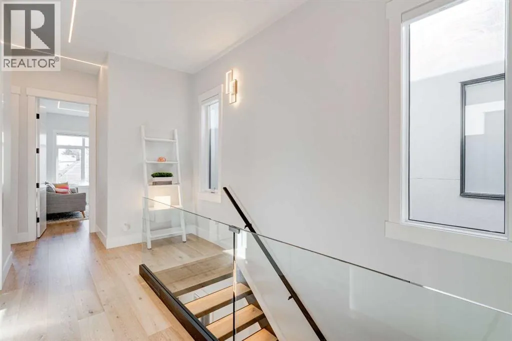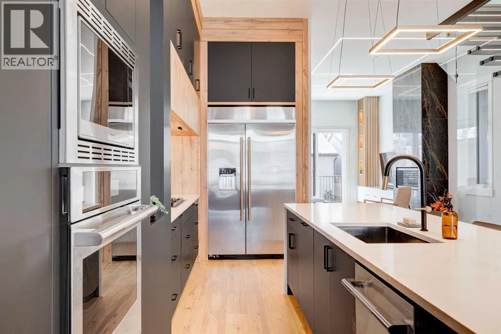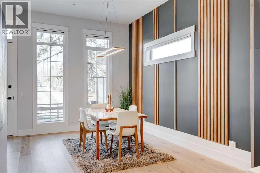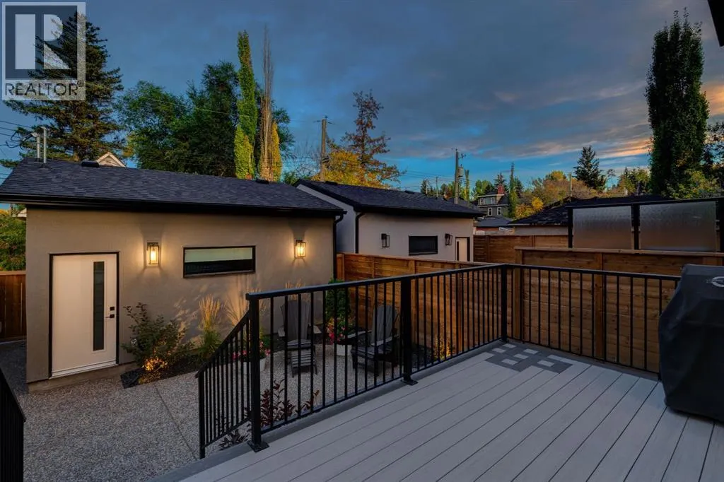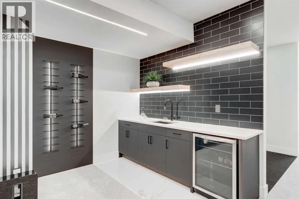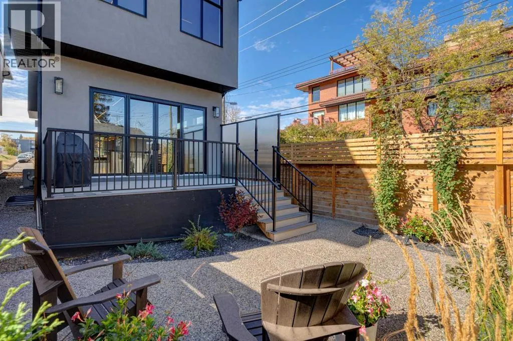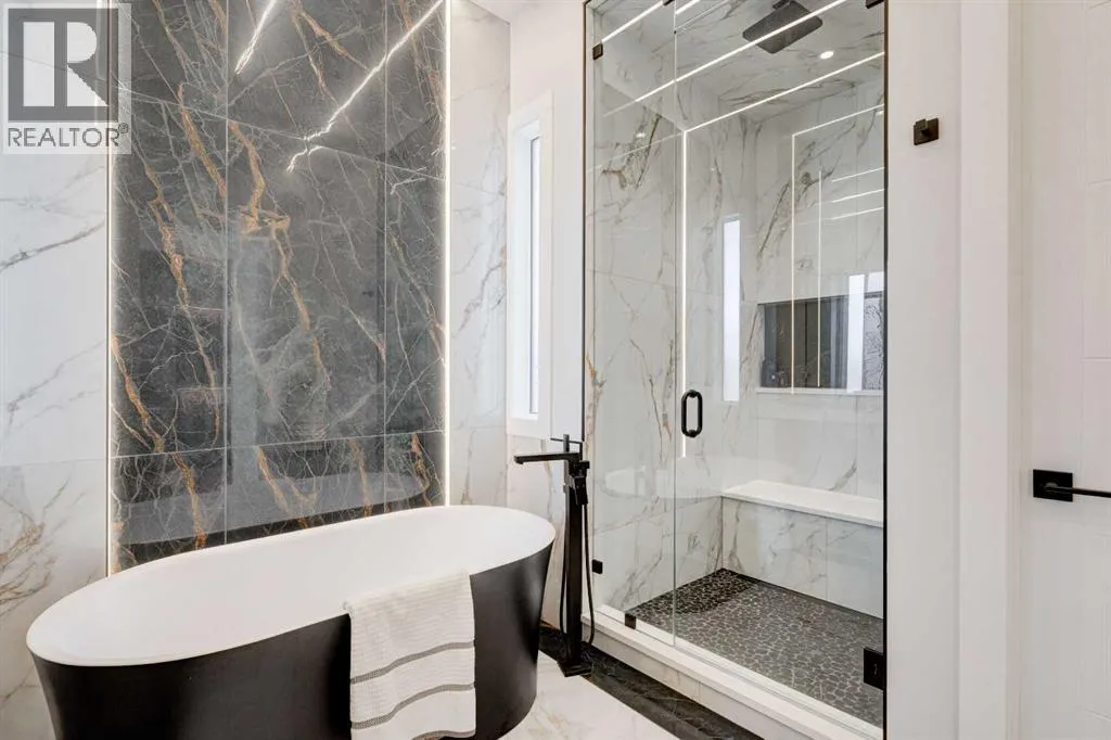 Step into refined luxury in this stunning modern home, perfectly situated in UPPER MOUNT ROYAL! Designed for effortless living, this 4-bed, 3.5-bath masterpiece offers endless impeccably crafted living space w/ high-end finishes and upgrades throughout! The striking brick exterior, lush artificial turf, and integrated lighting create an unforgettable first impression. Inside, the foyer welcomes you w/ soaring ceilings, wide-plank hardwood floors, and a stylish built-in bench w/ wood slat wall. A bright, open dining space w/ designer lighting and modern wood accented wall flows seamlessly into the high-end kitchen, a true showstopper w/ a massive waterfall quartz island, full-height flat panel cabinetry, and premium appliances. The sleek black and wood-accented cabinetry is complemented by under-cabinet lighting and island pendants that add a warm, inviting glow. The living room is anchored by a statement fireplace w/ floor-to-ceiling black marble w/ gold veining, creating a sophisticated yet cozy retreat. A wall of sliding glass doors extends the living space onto the deck, where extra-wide steps lead to the beautifully landscaped backyard featuring PRIVACY SCREENS, landscape lighting, and underground sprinklers for easy maintenance. An elegant powder room w/ a black vessel sink and a side mudroom w/ built-in storage round off the main level. A custom glass-enclosed staircase w/ open riser stairs and LED accent lights leads to the second floor, where the primary retreat is a true sanctuary. The spacious bedroom features modern ceiling lighting, arched windows, a sliding barn door, and a spa-inspired ensuite. The ensuite is a masterpiece w/ black and gold-veined marble, a freestanding tub, a glass-enclosed STEAM SHOWER w/ a rainfall head, and HEATED FLOORS for ultimate comfort. Two additional bedrooms, a sleek 4-piece bath w/ upgraded shower glass and heated floors, and a well-appointed laundry room w/ extra storage, a sink, and geometric tile flooring complete this level. The fully finished basement is the ultimate entertaining space, featuring a spacious media room w/ a built-in entertainment unit, a stylish wet bar w/ a full-height backsplash and wine storage, and an exercise area w/ rubber flooring and a mirrored wall. A fourth bedroom and another full bathroom w/ upgraded shower glass complete this level. This home is fully equipped w/ SMART HOME TECHNOLOGY, allowing you to control heating, cooling, lighting, security, and even the fireplace â all from your phone! The built-in sound system ensures seamless audio throughout, while Hunter Douglas AUTOMATED BLINDS add a touch of convenience. Additional features include A/C, security cameras, and an insulated DOUBLE GARAGE roughed-in for a gas heater. Located just steps from 17th Ave, this home offers unbeatable access to top restaurants, cafés, shopping, parks, and some of Calgaryâs best schools. Enjoy the perfect blend of urban convenience and upscale living in one of the cityâs most sought-after neighbourhoods! (id:27476)