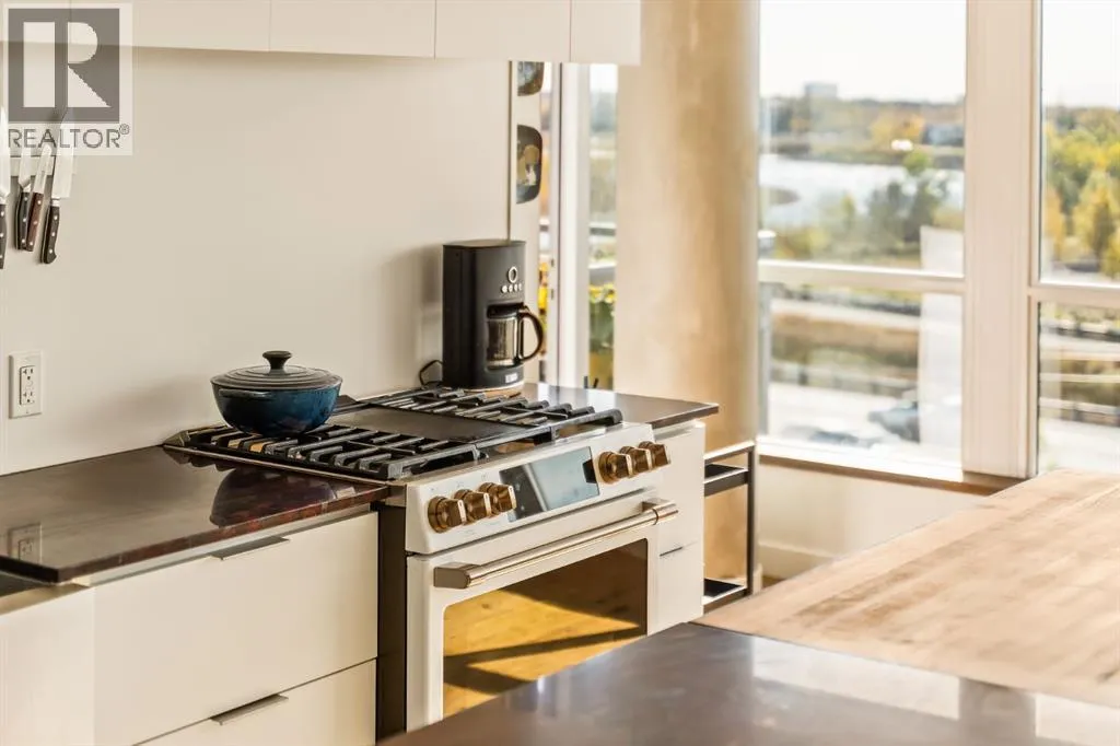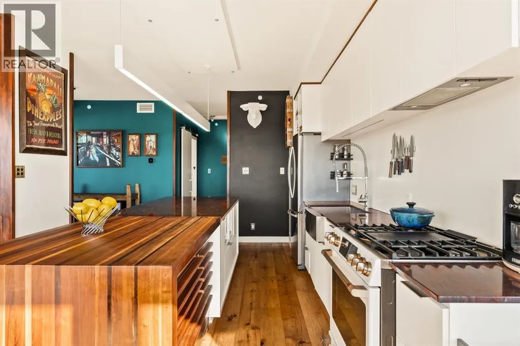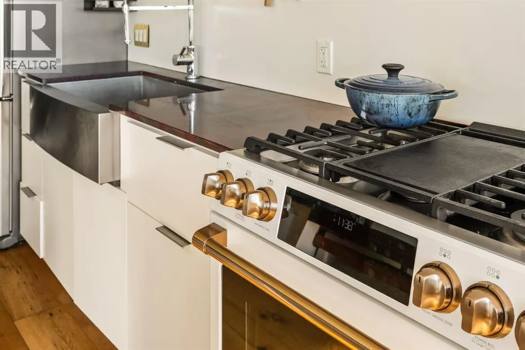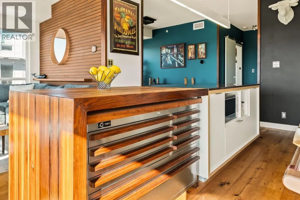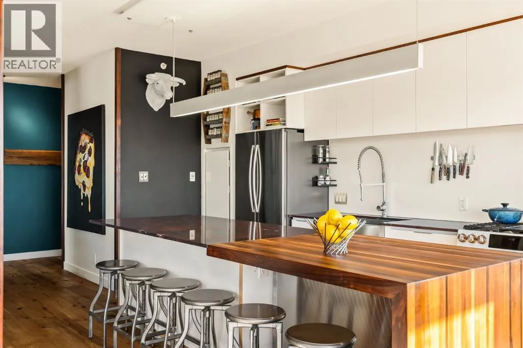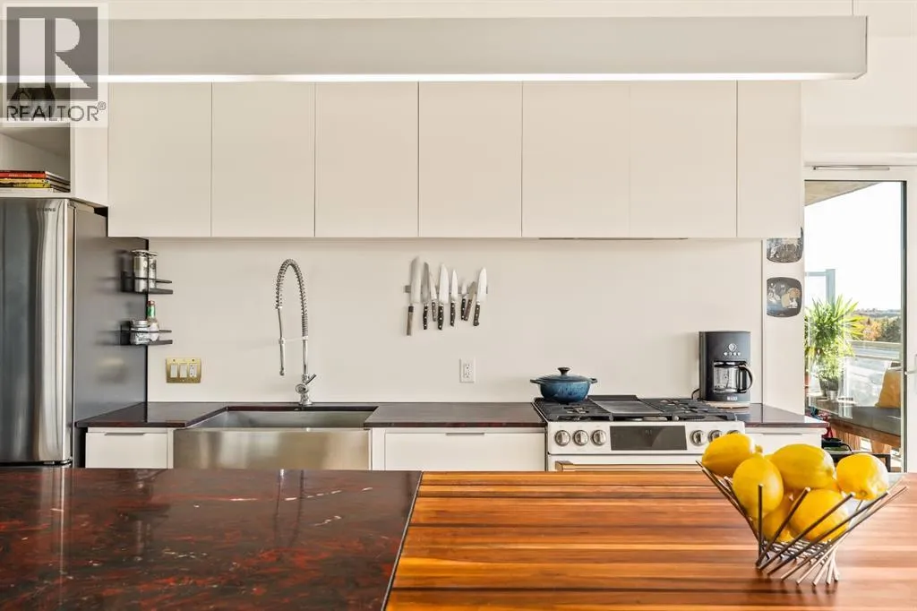 In Calgaryâs most storied neighbourhood, where the Bow River bends around tree-lined paths and history meets creativity, lies a home that captures the essence of bespoke living. This remarkable concrete SoBow residence, featuring one of the most desirable floor plans in the entire complex, is not just a place to live, itâs a work of art shaped by craftsmanship, texture, and intention.From the moment you enter, every detail has been curated to inspire. A beautifully redesigned front entry offers custom cabinetry, integrated shelving, and a built-in bench, a thoughtful welcome that blends elegance with everyday function. The kitchen, anchored by rare Iron Red stone countertops and a solid hardwood waterfall butcher block island, is both sculptural and soulful. A GE Café gas stove and basin sink with garburator bring culinary precision, while the extended island invites gatherings and conversation.Throughout the home, subtle artistry abounds. Custom wood trim frames every windowsill, walnut corner edging defines the main spaces, and a stunning feature wall with floating beverage shelves transforms the living room into a refined retreat. Each of the three bathrooms is elevated by handcrafted vanities topped with bespoke vessel sinks, while Buster + Punch switches and designer lighting add a quiet note of luxury.This unit also offers exceptional convenience, including two titled underground parking stalls in a heated garage, one titled storage locker, and secure bike storage, a rare and valuable combination for inner-city living.Set within SoBow, a visionary community designed by NORR Architects to honour Inglewoodâs industrial past while embracing its modern renaissance, residents enjoy a host of premium amenities. Condo Fees include a full-time concierge, state-of-the-art fitness facility, weight room, yoga room, owners lounge, and media room extend your living experience well beyond your front door. Surrounded by 14 acres of landscaped courtyards and Aspen gro ves, with the Bow River and Pearce Estate Park just steps away, SoBow offers an unmatched lifestyle.Located in the vibrant, sought-after community of Inglewood, where amenities, restaurants, shopping, breweries, and parks are all within walking distance, this home embodies the perfect balance between dynamic city living and serene natural beauty.This is a home where craftsmanship meets character, where nature meets design, and where the timeless spirit of Inglewood finds its most sophisticated expression. (id:27476)