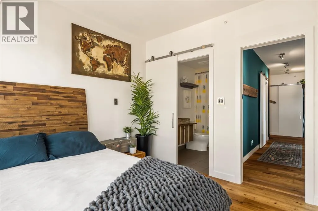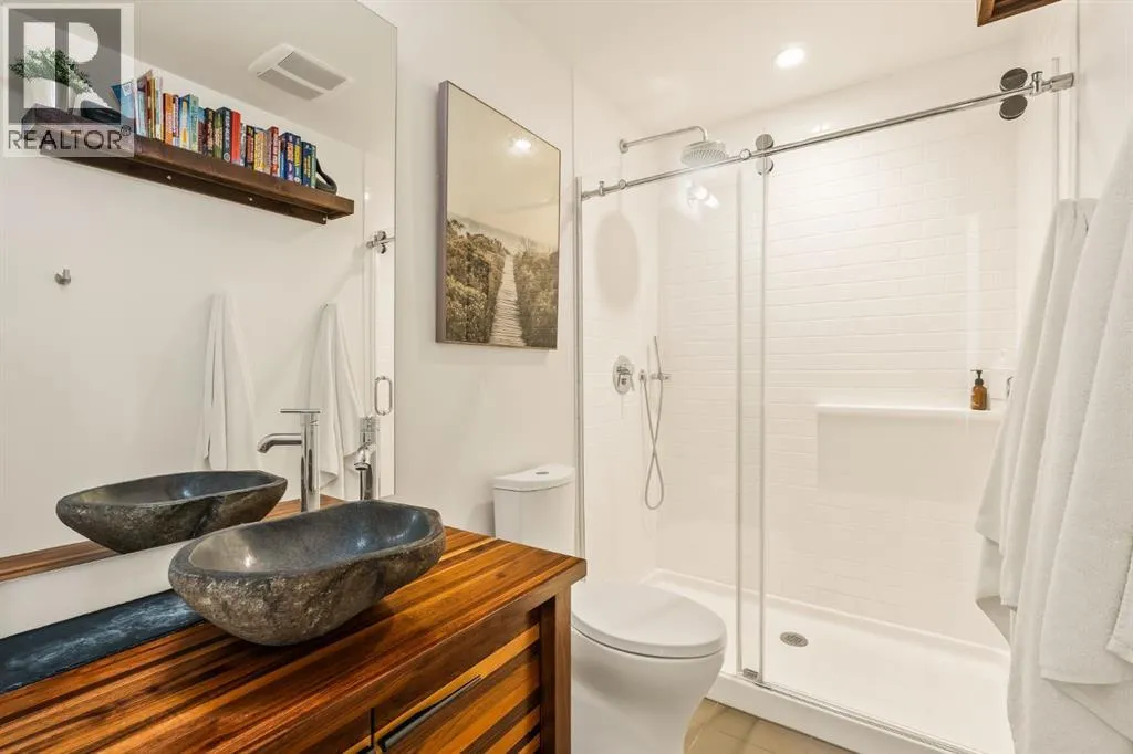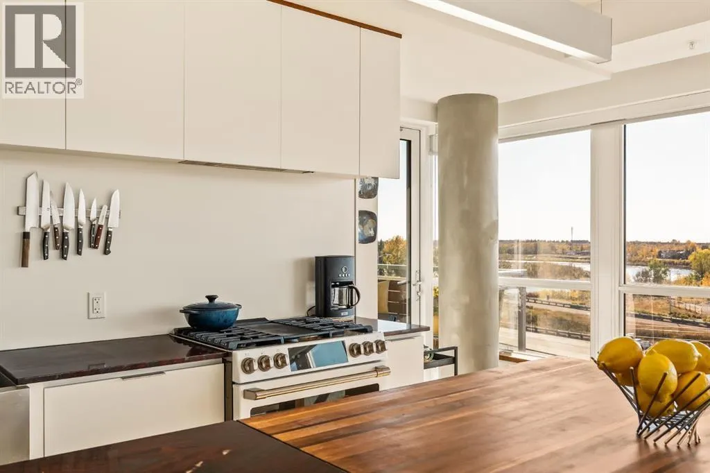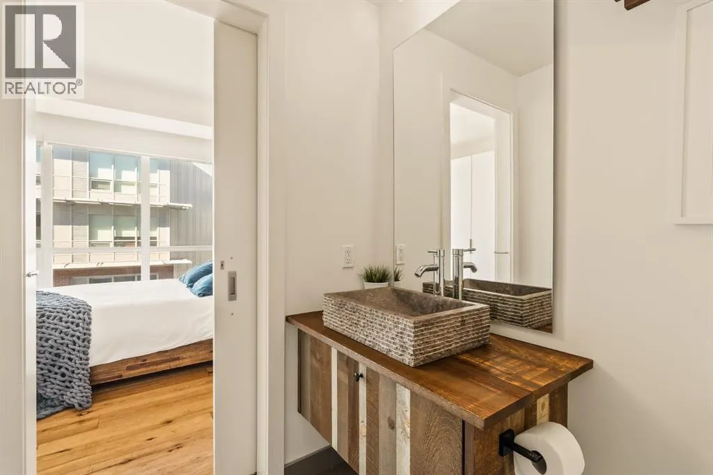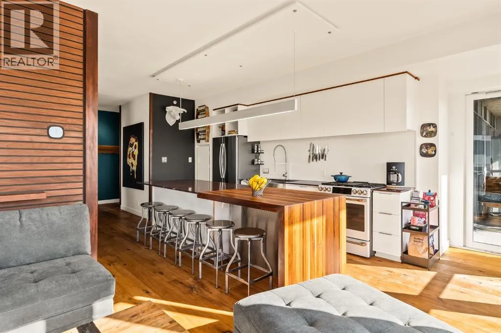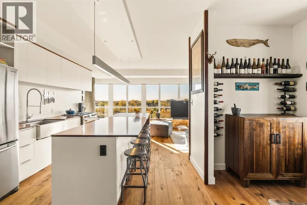 In Calgaryâs most storied neighbourhood, where the Bow River bends around tree-lined paths and history meets creativity, lies a home that captures the essence of bespoke living. This remarkable concrete SoBow residence, featuring one of the most desirable floor plans in the entire complex, is not just a place to live, itâs a work of art shaped by craftsmanship, texture, and intention.From the moment you enter, every detail has been curated to inspire. A beautifully redesigned front entry offers custom cabinetry, integrated shelving, and a built-in bench, a thoughtful welcome that blends elegance with everyday function. The kitchen, anchored by rare Iron Red stone countertops and a solid hardwood waterfall butcher block island, is both sculptural and soulful. A GE Café gas stove and basin sink with garburator bring culinary precision, while the extended island invites gatherings and conversation.Throughout the home, subtle artistry abounds. Custom wood trim frames every windowsill, walnut corner edging defines the main spaces, and a stunning feature wall with floating beverage shelves transforms the living room into a refined retreat. Each of the three bathrooms is elevated by handcrafted vanities topped with bespoke vessel sinks, while Buster + Punch switches and designer lighting add a quiet note of luxury.This unit also offers exceptional convenience, including two titled underground parking stalls in a heated garage, one titled storage locker, and secure bike storage, a rare and valuable combination for inner-city living.Set within SoBow, a visionary community designed by NORR Architects to honour Inglewoodâs industrial past while embracing its modern renaissance, residents enjoy a host of premium amenities. Condo Fees include a full-time concierge, state-of-the-art fitness facility, weight room, yoga room, owners lounge, and media room extend your living experience well beyond your front door. Surrounded by 14 acres of landscaped courtyards and Aspen gro ves, with the Bow River and Pearce Estate Park just steps away, SoBow offers an unmatched lifestyle.Located in the vibrant, sought-after community of Inglewood, where amenities, restaurants, shopping, breweries, and parks are all within walking distance, this home embodies the perfect balance between dynamic city living and serene natural beauty.This is a home where craftsmanship meets character, where nature meets design, and where the timeless spirit of Inglewood finds its most sophisticated expression. (id:27476)