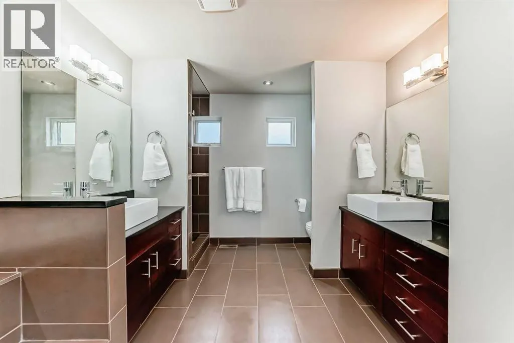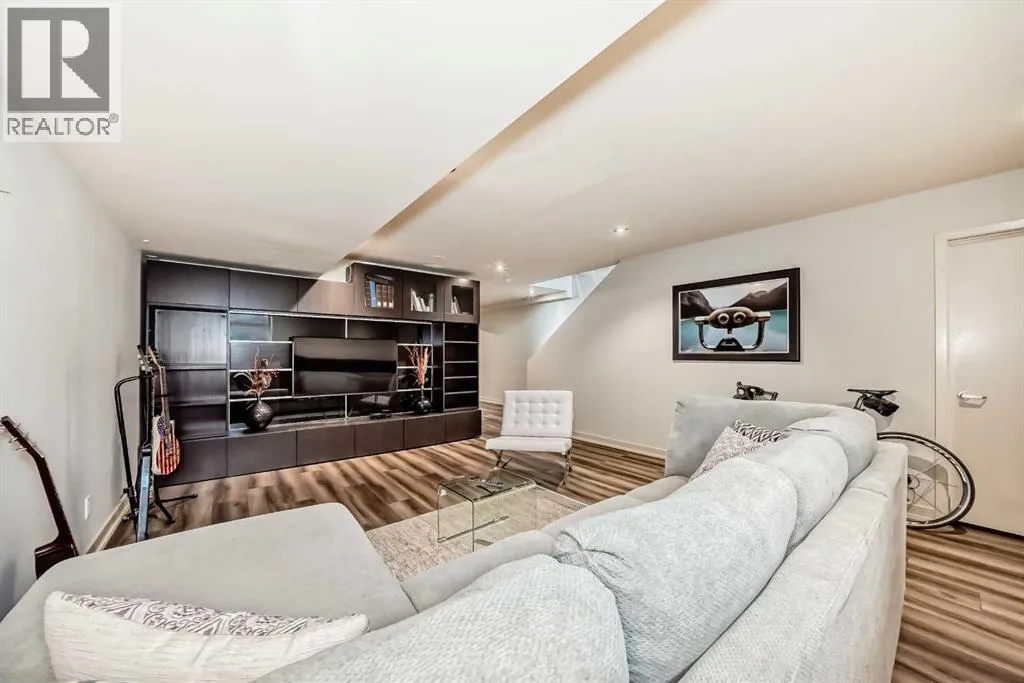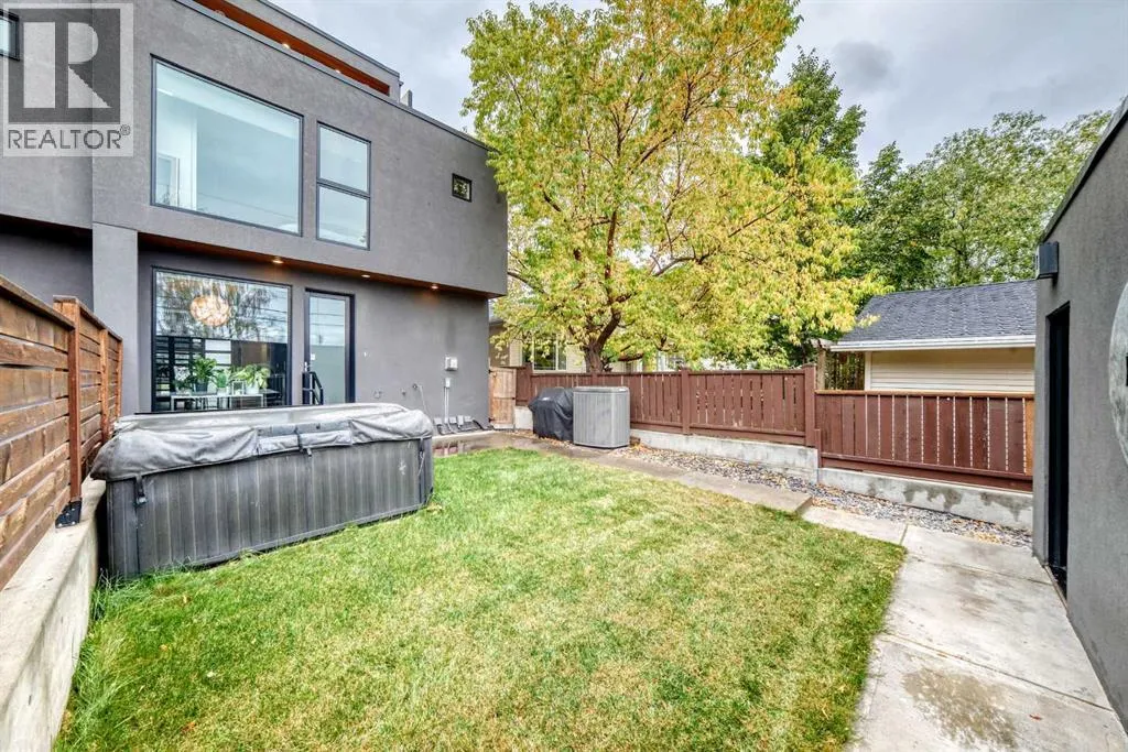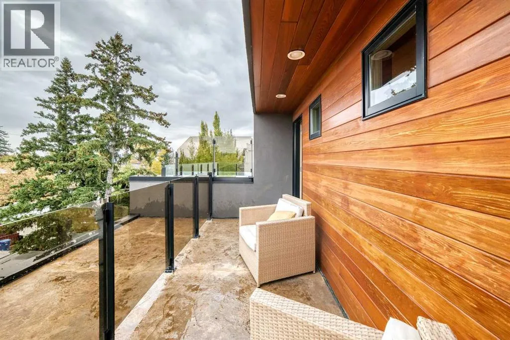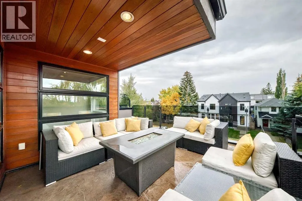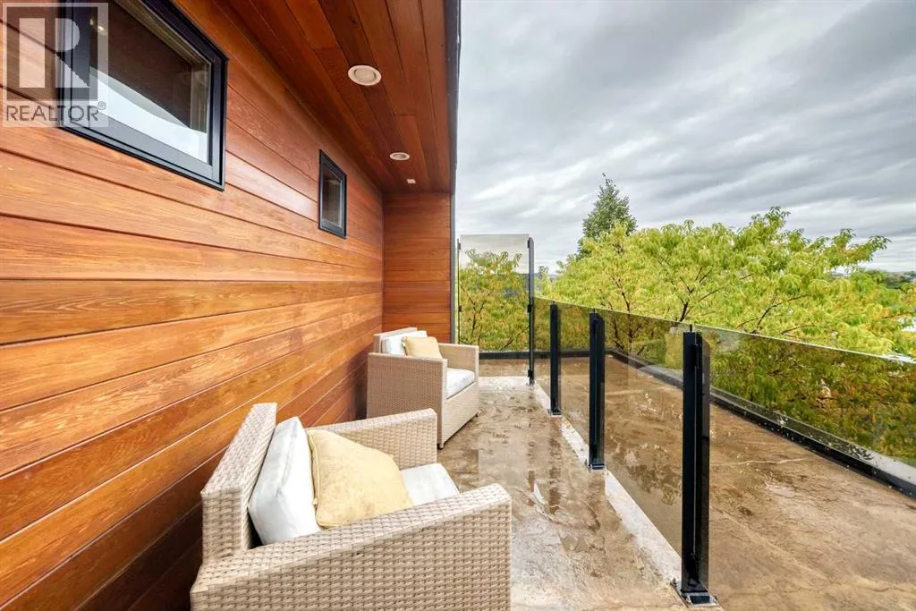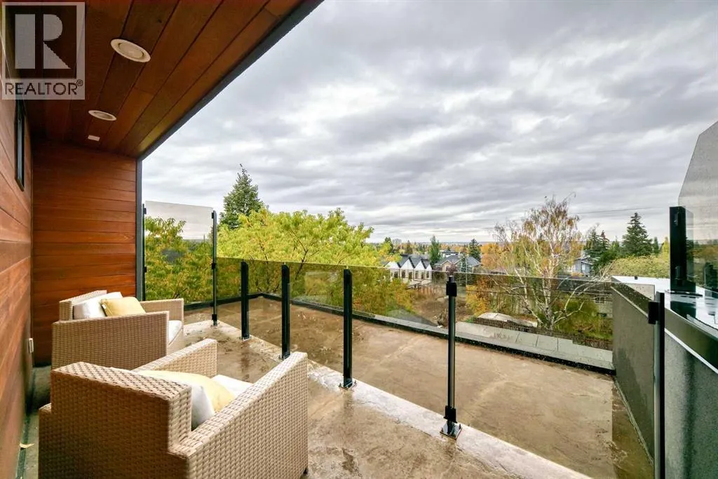 This contemporary, fully developed Inner City Home is loaded with upgrades thru-out and offers over 3200 SqFt of luxury living space complimented with a quiet location and city and mountain views from the Rooftop Patios. With 9 Foot Ceilings on the Main, central A/C and radiant in-floor heating in the Lower Level and all Bathrooms, the open concept floor plan starts with the bright Entry leading to the fully equipped gourmet Kitchen ideal for entertaining, complete with a 10 ft island with built-in wine rack, granite countertops, high-end stainless steel appliances including the gas down-draft cook top and built-in wall ovens, wine fridge and walk in pantry. The Dining area sits in front of a large floor to ceiling window, the Living Room features accent windows and a cozy gas fireplace with access to the backyard and there is the 2pce Guest Bath. The open riser staircase with glass panel wall leads up to the 2nd Level where youâll find the massive Primary Bedroom offering a 5Pce Ensuite with walk-in shower and Air-Jet corner soaker tub plus, the 15â walk-in closet with custom California Closet wood built-ins. There is also the 2nd Bedroom with itâs own 4Pce Ensuite, the Den/Flex area and Laundry Room. The Top Level has a 3rd Bedroom complete with a 3Pce Ensuite that can also be used as a Home Gym, Office or a Bonus Room with access to both Rooftop Patios which features stamped concrete with smoked glass panel rails (rails can be pushed out to make a full wrap around patio). The Lower Level is fully developed with a large Media/Family Room, the 4th Bedroom, another Full Bath and a Storage Room. Outside, youâll find your private backyard oasis ideal for entertaining and the fully finished double detached Garage thatâs roughed in for a heater. (id:27476)