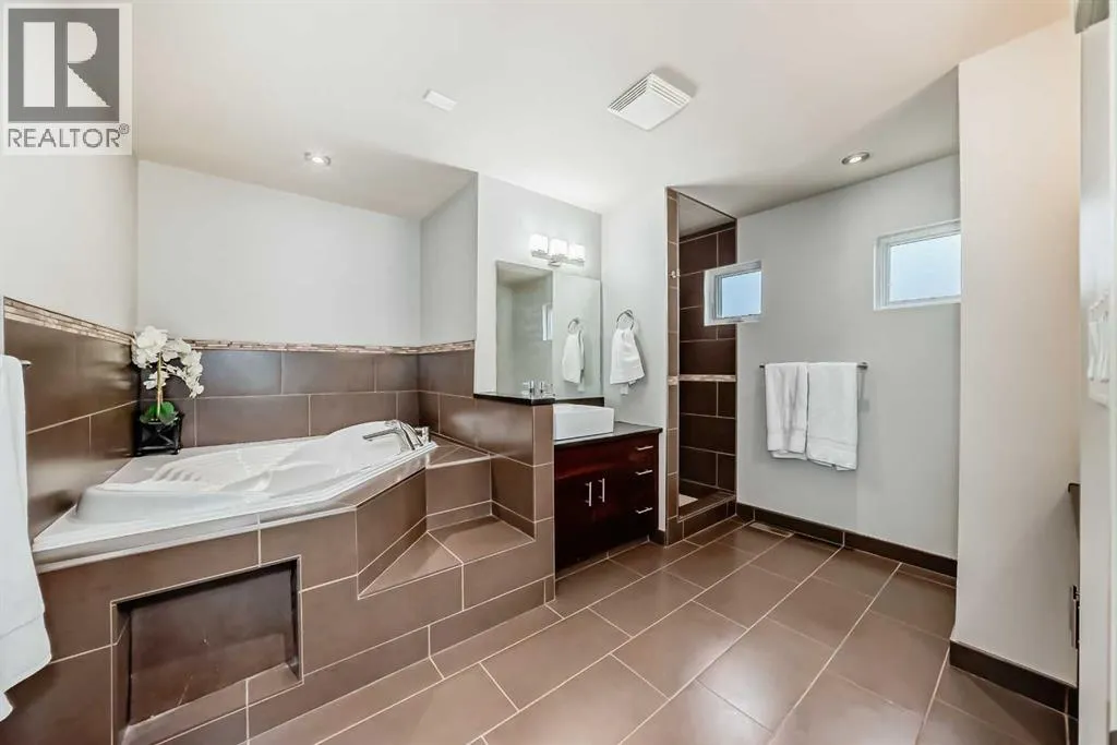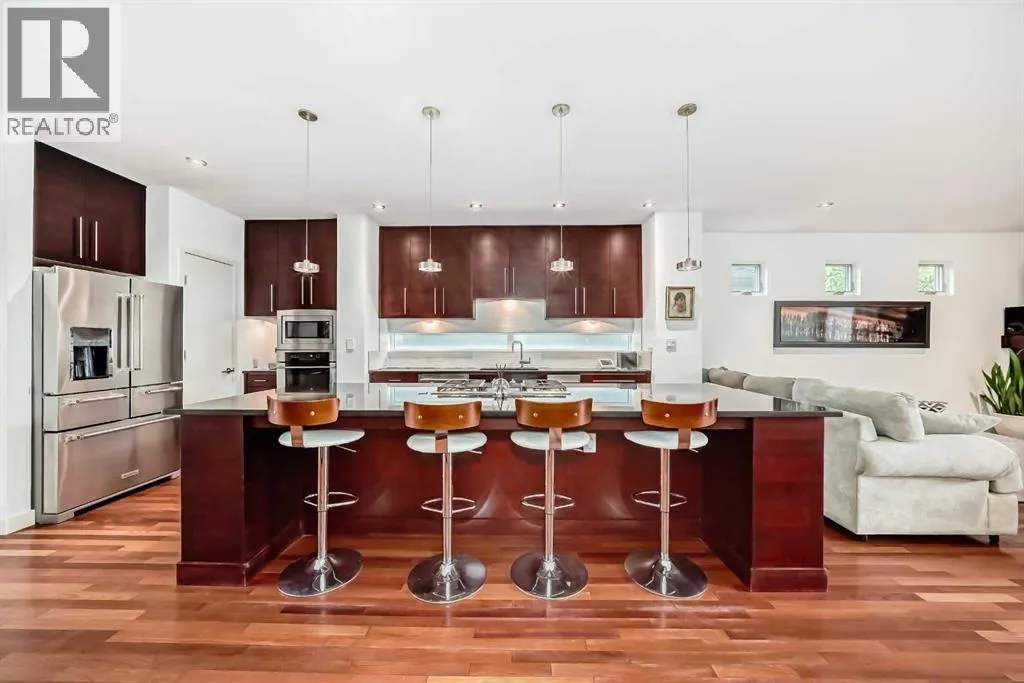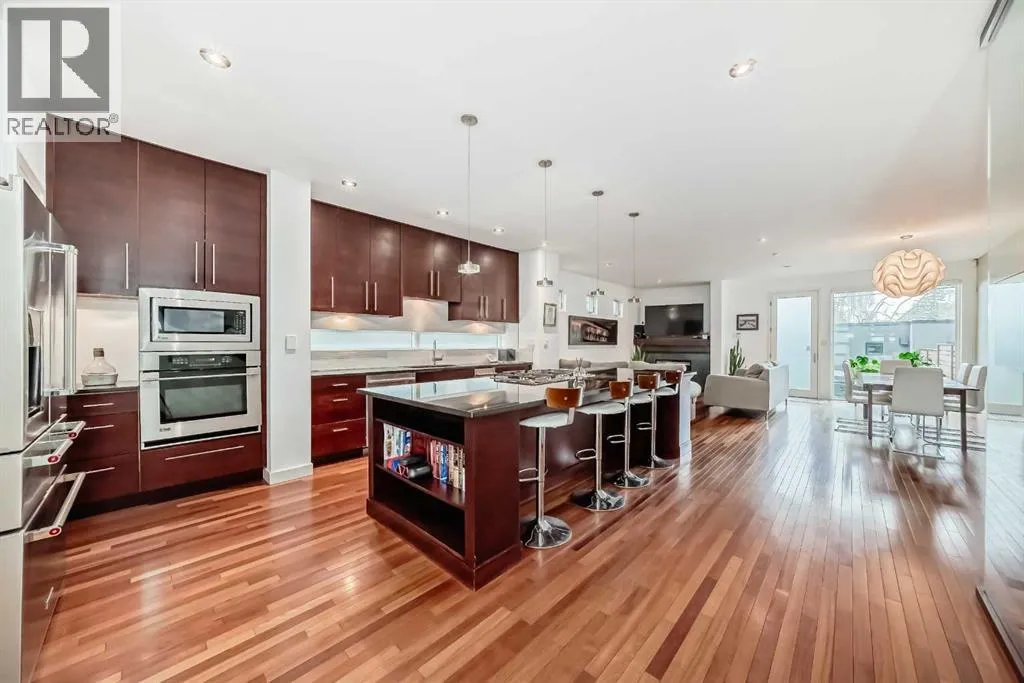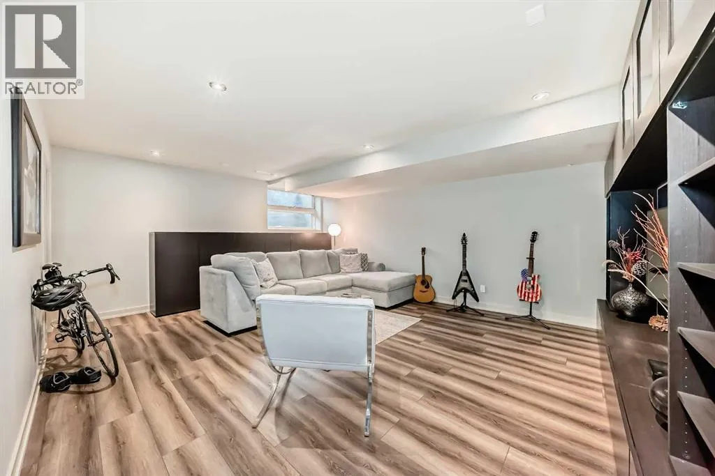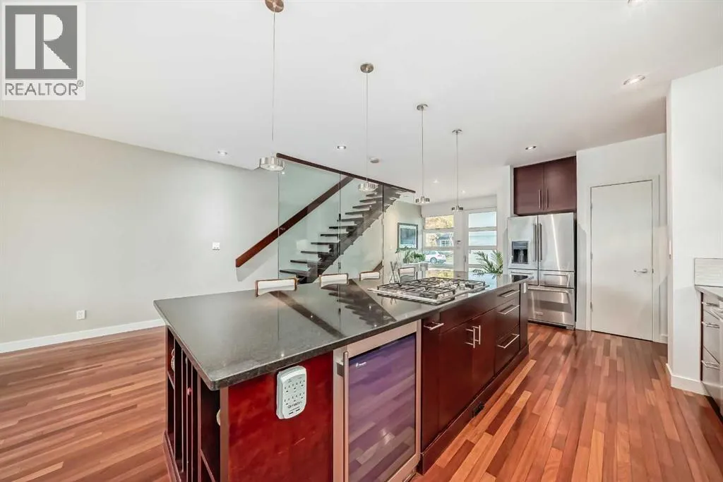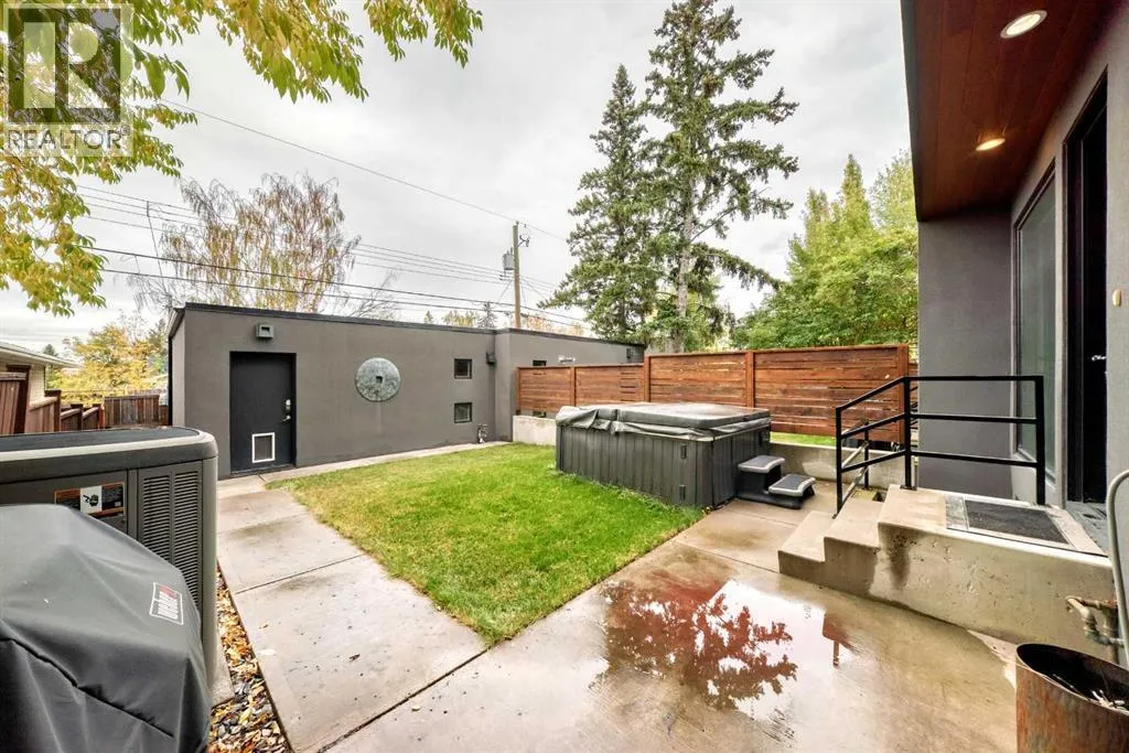 This contemporary, fully developed Inner City Home is loaded with upgrades thru-out and offers over 3200 SqFt of luxury living space complimented with a quiet location and city and mountain views from the Rooftop Patios. With 9 Foot Ceilings on the Main, central A/C and radiant in-floor heating in the Lower Level and all Bathrooms, the open concept floor plan starts with the bright Entry leading to the fully equipped gourmet Kitchen ideal for entertaining, complete with a 10 ft island with built-in wine rack, granite countertops, high-end stainless steel appliances including the gas down-draft cook top and built-in wall ovens, wine fridge and walk in pantry. The Dining area sits in front of a large floor to ceiling window, the Living Room features accent windows and a cozy gas fireplace with access to the backyard and there is the 2pce Guest Bath. The open riser staircase with glass panel wall leads up to the 2nd Level where youâll find the massive Primary Bedroom offering a 5Pce Ensuite with walk-in shower and Air-Jet corner soaker tub plus, the 15â walk-in closet with custom California Closet wood built-ins. There is also the 2nd Bedroom with itâs own 4Pce Ensuite, the Den/Flex area and Laundry Room. The Top Level has a 3rd Bedroom complete with a 3Pce Ensuite that can also be used as a Home Gym, Office or a Bonus Room with access to both Rooftop Patios which features stamped concrete with smoked glass panel rails (rails can be pushed out to make a full wrap around patio). The Lower Level is fully developed with a large Media/Family Room, the 4th Bedroom, another Full Bath and a Storage Room. Outside, youâll find your private backyard oasis ideal for entertaining and the fully finished double detached Garage thatâs roughed in for a heater. (id:27476)