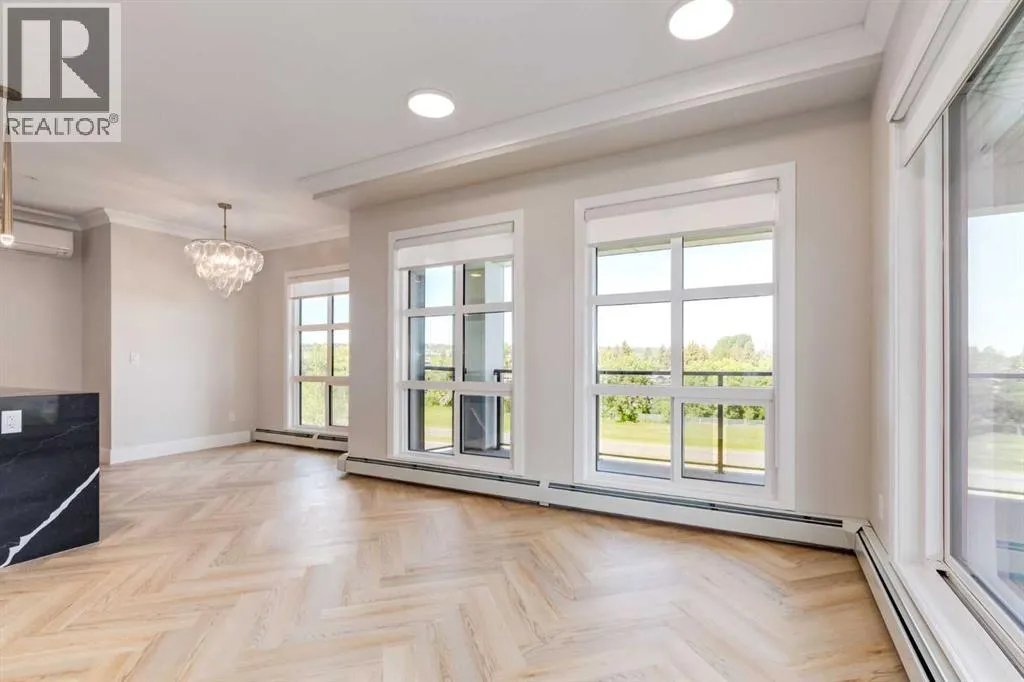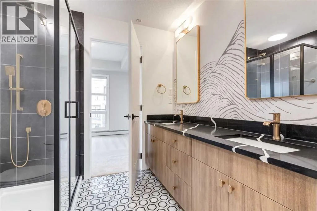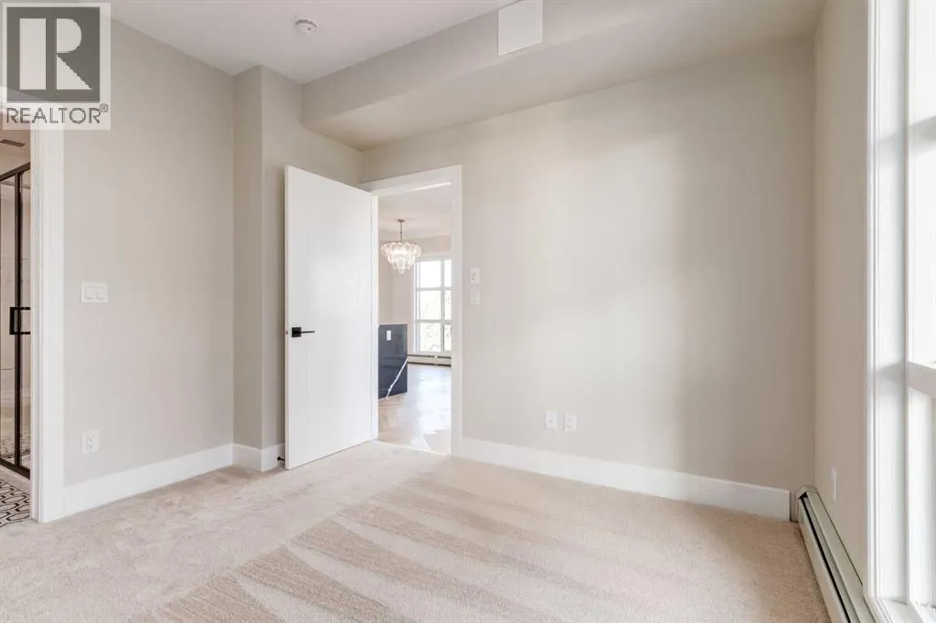 Discover the "Argento" floorplan by award-winning Rohit Homesâa beautifully designed 2-bedroom, 2-bathroom corner unit that offers the perfect balance of style and functionality. Located on the second floor in the sought-after Quesnay at Currie Barracks, this bright and airy home is flooded with natural sunlight, making it an ideal sanctuary for downsizers or anyone seeking a serene, low-maintenance lifestyle. Featuring the sophisticated Neo-Classical color palette, blending timeless elegance with modern finishes.. Designed by the award-winning Louis Duncan-He, the unit includes premium finishes such as 10' ceilings, quartz countertops with a waterfall edge, a quartz backsplash, full-height cabinetry, a stainless appliance package, bespoke light fixtures, and window coverings. The open-concept layout seamlessly integrates the kitchen, dining, and living areas, perfect for both relaxing and entertaining. The spacious primary bedroom includes a private ensuite, while the second bedroom and additional full bath offer comfort and flexibility for guests or a home office. Step outside to enjoy a large NE facing balcony, extending your living space into the outdoors. This pet-friendly and AIRBNB-friendly building offers titled heated underground parking and plenty of visitor spaces. Ideally located minutes from downtown, Mount Royal University, and the vibrant amenities of 17th Ave and Marda Loop, the Argento floorplan is a rare gem. Limited units are availableâsecure your slice of modern living today! **Photos are taken from existing building of the same models. Not of the exact unit ** (id:27476)