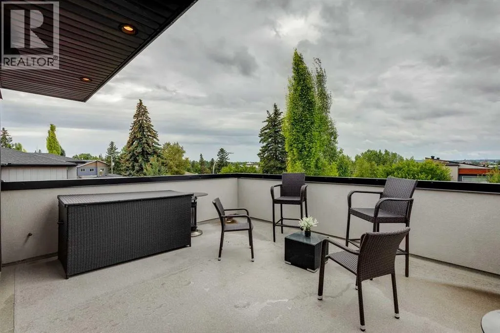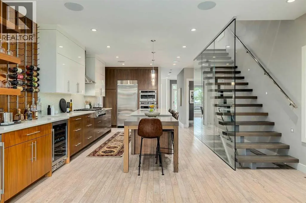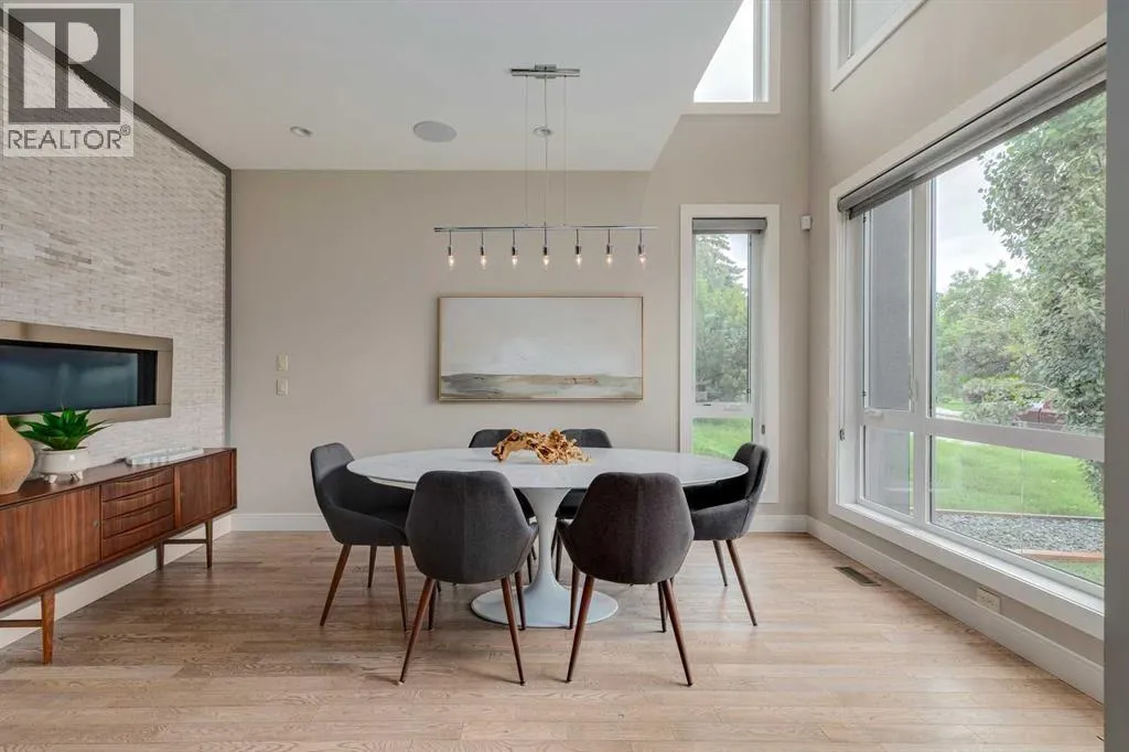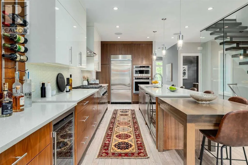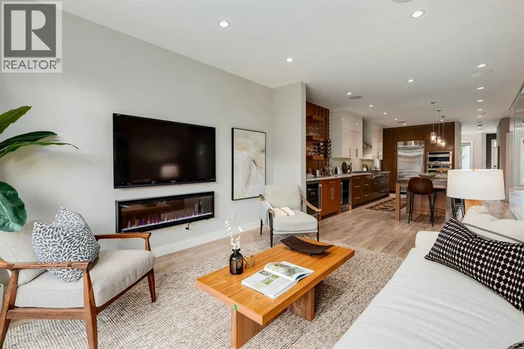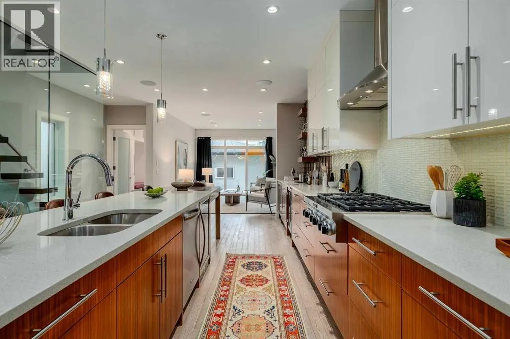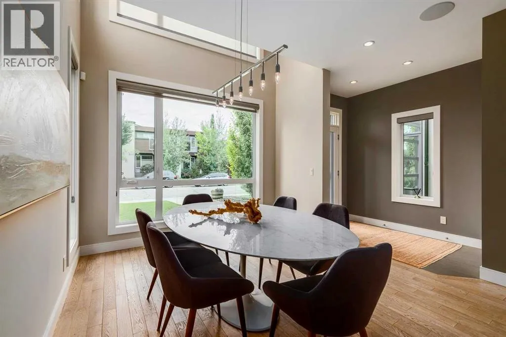This stunning three-story detached home offers nearly 3,500 sq ft of beautifully finished living space in the heart of Richmond. Every detail reflects thoughtful design, quality craftsmanship + numerous luxury upgrades throughout. Soaring 9-foot ceilings on all levels + large windows fill the home with natural light + hardwood floors throughout. The main floor is ideal for both entertaining + everyday life. The spacious dining room is at the front of the house with lovely street views; Chefs kitchen is efficiently designed, galley style with huge island, upgraded KitchenAid appliances, Caesarstone + quartz counters, walnut cabinetry, under-cabinet lighting, floating shelves, a built-in wine wall + a movable custom island table. Comfy family room with ribbon gas fireplace overlooks backyard. Patio doors lead into the sunny, south-facing backyardâfully finished in maintenance-free concrete with gas hookups for a BBQ + fire table, outdoor speakers + a double detached garage complete with slat wall + ceiling storage. A floating oak staircase leads to the second level, which includes two generous bedrooms, a mezzanine office, a five-piece bathroom with heated floors + a full laundry room. The top-floor primary, is a private retreat, offering a massive walk-in closet with custom shoe racks + storage, a spa-inspired five-piece ensuite with a standalone tub, floor-to-ceiling tiled shower with LED lighting + heated floors. From here, access your large private rooftop patio. The fully finished basement offers a cozy living area with wet bar, an additional bedroom, three-piece bathroom, second laundry set + storage. Additional features include: Smart home system with built-in speakers + full sound/security wiring, four wine coolers, two furnaces, each with humidifiers, dual A/C units for climate control, oversized 80-gallon hot water tank, mudroom with heated floors + custom built-ins, Gemstone exterior lighting + low-maintenance turf front yard. Located on a quiet s treet just a short walk to Marda Loop, 17th Avenue, Richmond School (Kâ6) + nearby shops + restaurants. (id:27476)