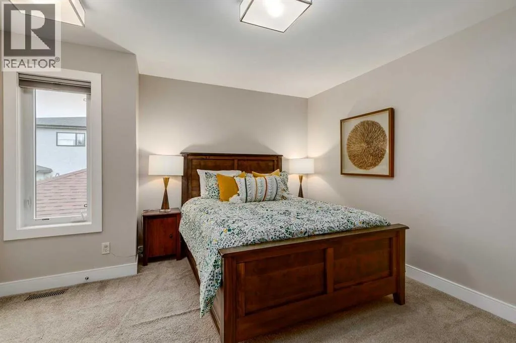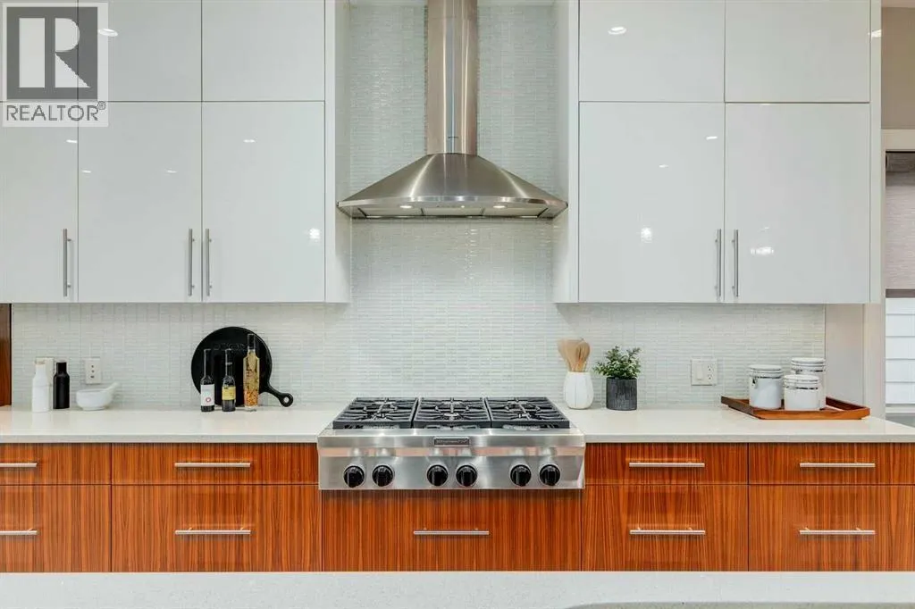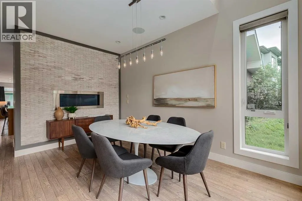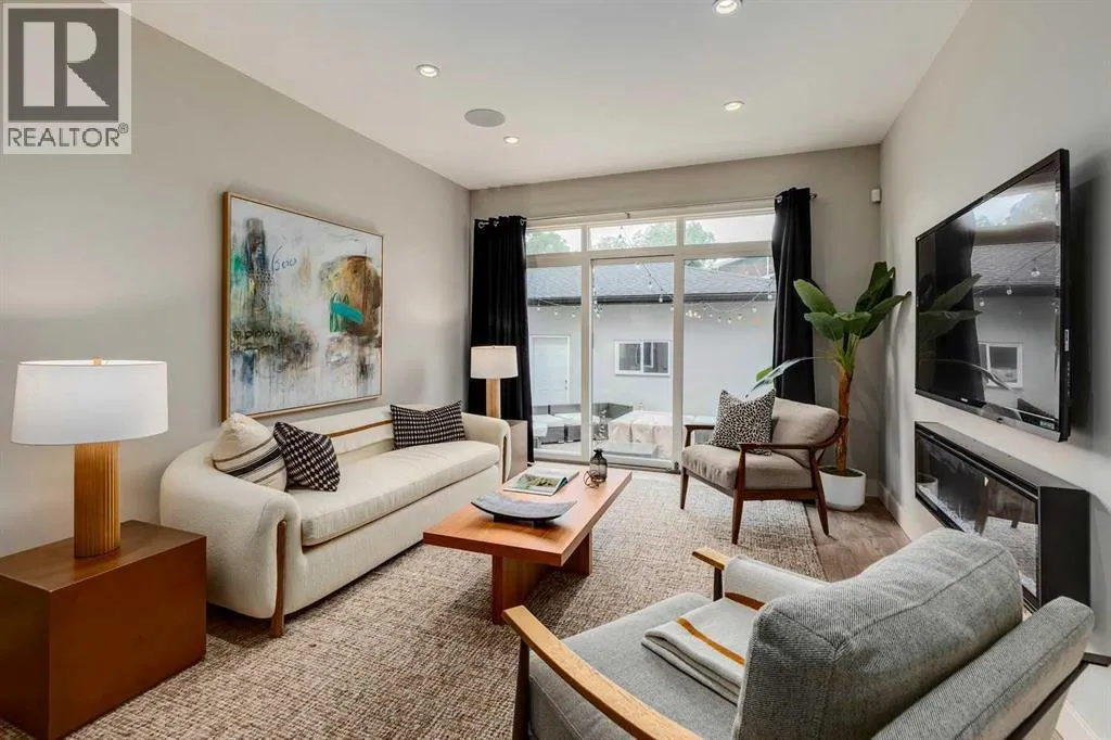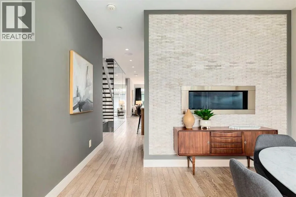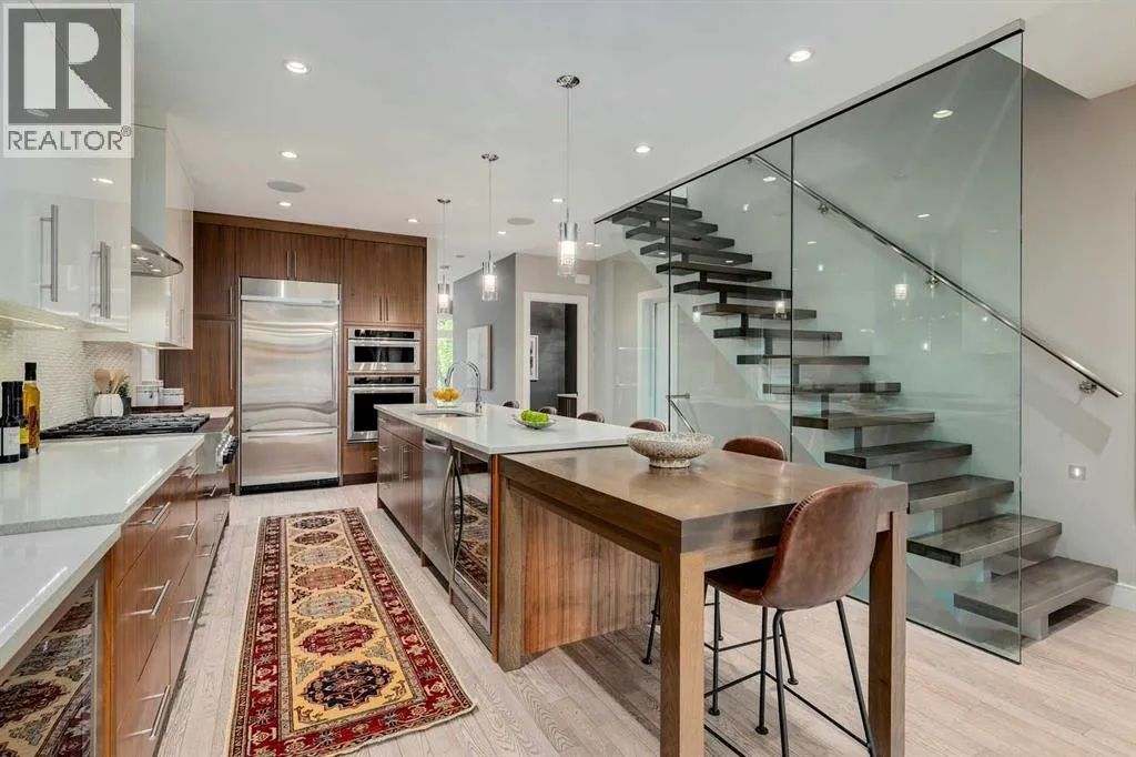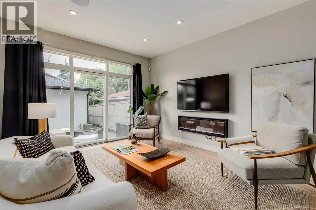 This stunning three-story detached home offers nearly 3,500 sq ft of beautifully finished living space in the heart of Richmond. Every detail reflects thoughtful design, quality craftsmanship + numerous luxury upgrades throughout. Soaring 9-foot ceilings on all levels + large windows fill the home with natural light + hardwood floors throughout. The main floor is ideal for both entertaining + everyday life. The spacious dining room is at the front of the house with lovely street views; Chefs kitchen is efficiently designed, galley style with huge island, upgraded KitchenAid appliances, Caesarstone + quartz counters, walnut cabinetry, under-cabinet lighting, floating shelves, a built-in wine wall + a movable custom island table. Comfy family room with ribbon gas fireplace overlooks backyard. Patio doors lead into the sunny, south-facing backyardâfully finished in maintenance-free concrete with gas hookups for a BBQ + fire table, outdoor speakers + a double detached garage complete with slat wall + ceiling storage. A floating oak staircase leads to the second level, which includes two generous bedrooms, a mezzanine office, a five-piece bathroom with heated floors + a full laundry room. The top-floor primary, is a private retreat, offering a massive walk-in closet with custom shoe racks + storage, a spa-inspired five-piece ensuite with a standalone tub, floor-to-ceiling tiled shower with LED lighting + heated floors. From here, access your large private rooftop patio. The fully finished basement offers a cozy living area with wet bar, an additional bedroom, three-piece bathroom, second laundry set + storage. Additional features include: Smart home system with built-in speakers + full sound/security wiring, four wine coolers, two furnaces, each with humidifiers, dual A/C units for climate control, oversized 80-gallon hot water tank, mudroom with heated floors + custom built-ins, Gemstone exterior lighting + low-maintenance turf front yard. Located on a quiet s treet just a short walk to Marda Loop, 17th Avenue, Richmond School (Kâ6) + nearby shops + restaurants. (id:27476)