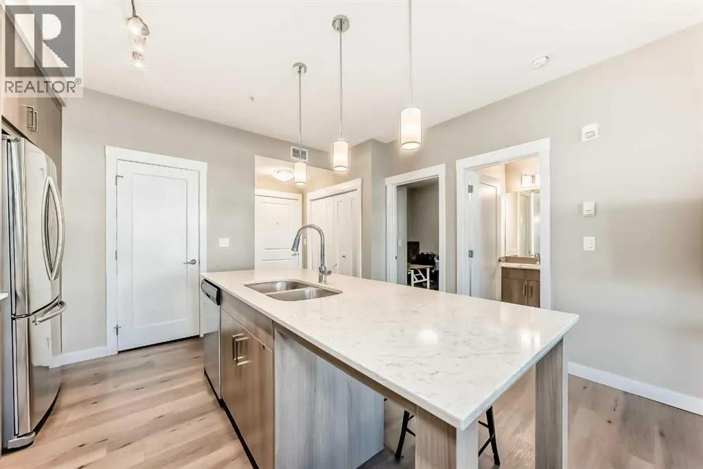 Welcome to lakeside living in the premiere community of Auburn Bay! This beautifully maintained 2-bedroom, 2-bathroom condo combines modern comfort with an unbeatable location just steps from the lake, parks, and vibrant amenities. Step inside and enjoy an open-concept layout designed for everyday living and entertaining. The kitchen features sleek cabinetry, stone countertops, stainless steel appliances, and a breakfast bar that flows seamlessly into the bright living area. Large windows fill the space with natural light, and the private balcony offers a perfect spot to relax or enjoy your morning coffee. The primary suite includes a large closet and a private ensuite with walk-in shower, while the second bedroom and full bath provide ideal space for guests, family, or a home office. In-suite laundry adds convenience, and the unit includes a titled underground heated parking stall with a secure storage cage â perfect for keeping your car and gear protected year-round. Living in Auburn Bay means access to a 43-acre freshwater lake, beach, skating rinks, parks, and walking trails, plus proximity to schools, shopping, restaurants, and the South Health Campus. With quick access to major routes like Deerfoot and Stoney Trail, this home truly offers the best of comfort, lifestyle, and location. Experience the perfect blend of modern living and resort-style amenities â welcome home to Auburn Bay! (id:27476)