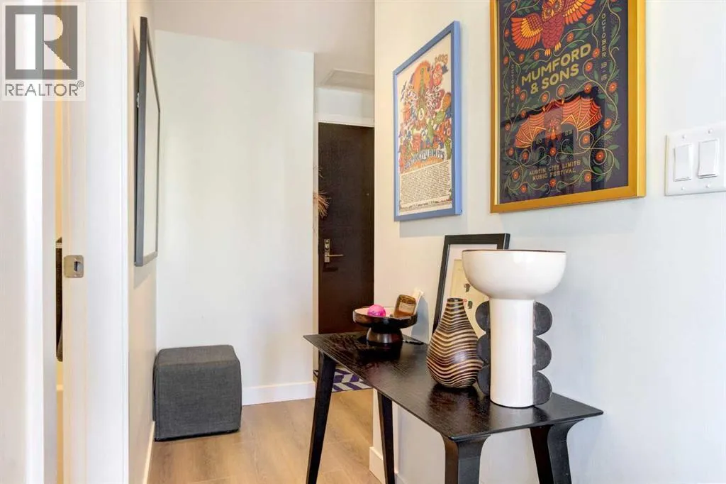Welcome to unit 703 in The Royal! A lovely 2 bedroom 2 bathroom double balcony corner unit with stunning downtown views. The floor to ceiling windows flood the main living space with natural light and the north and east vistas are stunning. The bright kitchen is fully equipped with a large quartz island, high end appliances, plenty of cabinet and counter space with custom built in - all overlooking the main living and dining areas, perfect for entertaining. Large primary bedroom, with direct access to the second balcony, features a walk-in closet, an ensuite with a large glass door shower, double vanity and heated floors. The second bedroom is located on the opposite side of the unit, perfect for guests or home office. Other features include air conditioning, a gas line on the balcony for bbq, in-suite full size stacked laundry and additional 4 piece bathroom with soaker tub. Residents can enjoy the many amenities including a fitness center, steam room, sauna, squash court, 24-hour concierge/security, outdoor courtyard, and private dining area for larger get togethers. Located just off 17th avenue you will have quick access to great shopping, restaurants, groceries, coffee shops and pubs. Building is very pet friendly, with approval, and there are many parks and green spaces near by. This unit is complete with a secure heated underground parking space and a separate storage locker. An excellent well cared for urban home. (id:27476)
