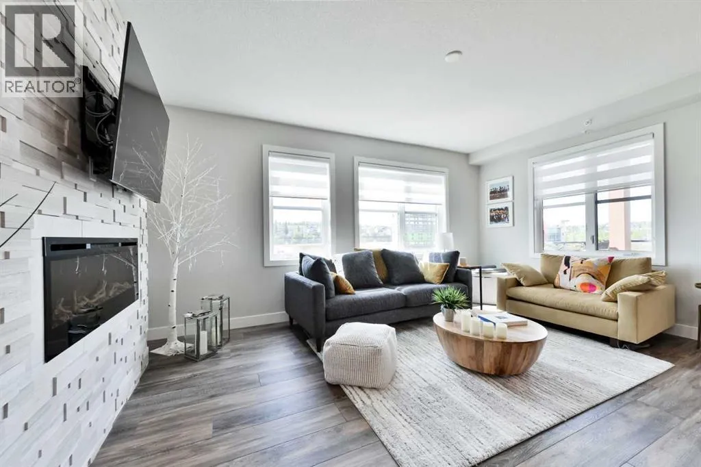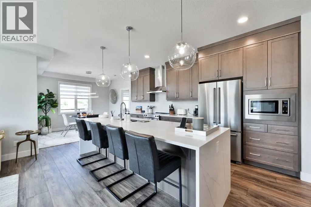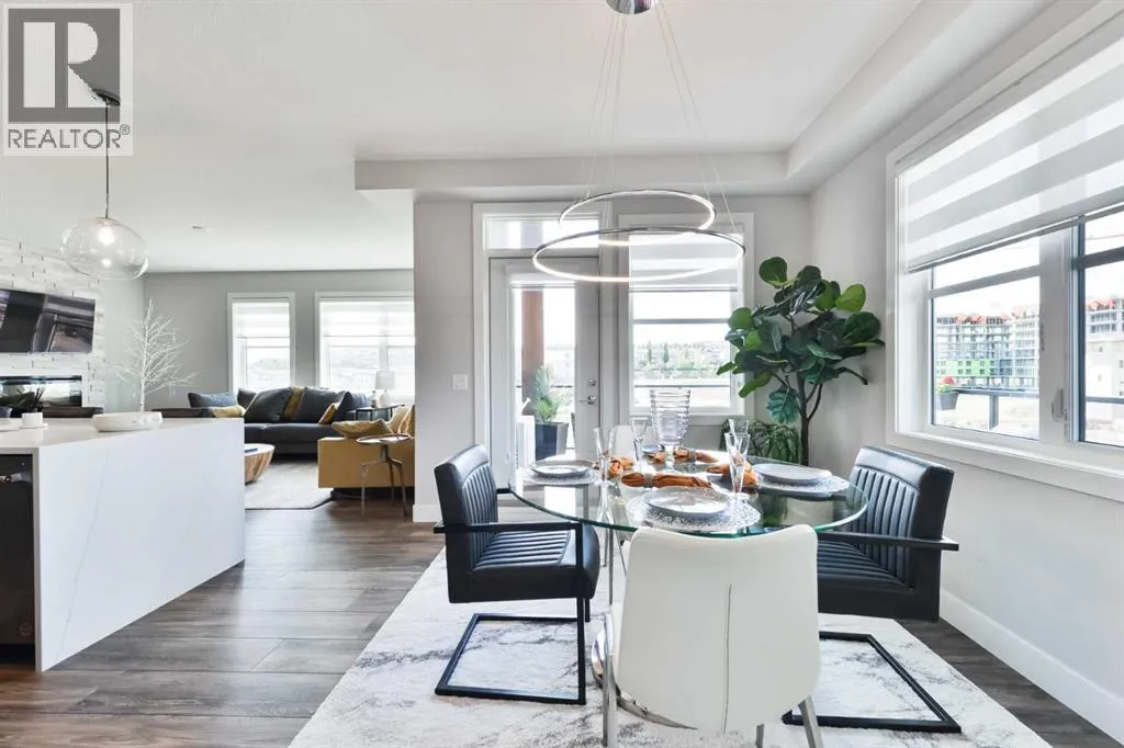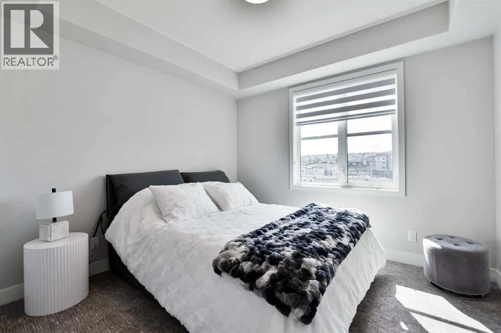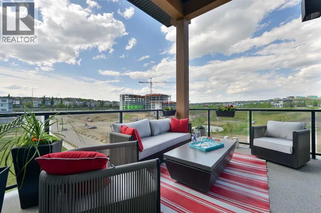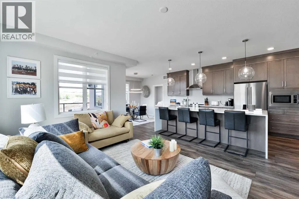 Welcome to this stunning top-floor, corner-unit condo offering over 1,100 sq ft of beautifully designed living space, featuring 2 bedrooms, 2 bathrooms, and an exceptional layout that blends comfort with functionality.From the moment you step inside, youâre greeted by an abundance of natural sunlight and a spacious front entry. To your left, a discreet laundry area and a generous flex room with double doorsâideal as a home office or additional storageâadd to the versatility of this home. The thoughtful split-bedroom layout ensures privacy, with a large secondary bedroom and full bathroom on one side, and a spacious primary suite on the other, complete with a walk-in closet and private ensuite.At the heart of the home is the open-concept great room, dining area, and gourmet kitchenâperfect for entertaining. Step outside onto the expansive wraparound balcony and take in the serene ravine and mountain views.Two conveniently located underground parking stalls (#39 & #40) are just steps from the stairwellâmaking it a breeze to run up to the unit or quickly access your vehicle.Perfectly situated just a short walk to Aspen Landingâs shops, restaurants, and amenities, and within close proximity to top-rated public and private schools. Enjoy easy access to downtown Calgary, the mountains, and the airport, along with nearby public transit and future park spaces.Whether you're downsizing, investing, or seeking a lock-and-leave lifestyle for winter travel, this impressive residence offers it all. (id:27476)