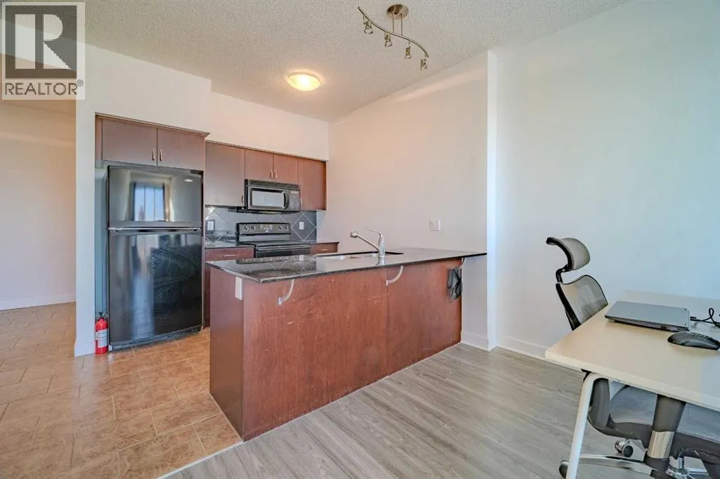 Attention Investors and First-Time Home Buyers!Welcome to this bright and spacious 11th-floor condo in the sought-after London at Heritage Station! This popular Yorkshire floor plan offers one bedroom with a walk-through closet to a four-piece bath, plus a versatile den/office and an open-concept kitchen and living area with soaring 9-foot ceilings.The owner recently upgraded the flooringâreplacing carpet with stylish, durable laminate two years agoâadding a modern touch to the home. The kitchen features granite countertops, plenty of cabinet space, and a convenient breakfast bar overlooking the living area, perfect for entertaining.Enjoy your private balcony with unobstructed southwest mountain views and stunning afternoon sunsets. The buildingâs unbeatable location offers a 5-minute walk to Heritage LRT Station and only 2 minutes to Save-On-Foods, Tim Hortons, and more.Whether youâre looking for a smart investment or a place to call home, this unit offers the perfect combination of modern comfort, convenience, and style. Donât miss outâbook your showing today! (id:27476)