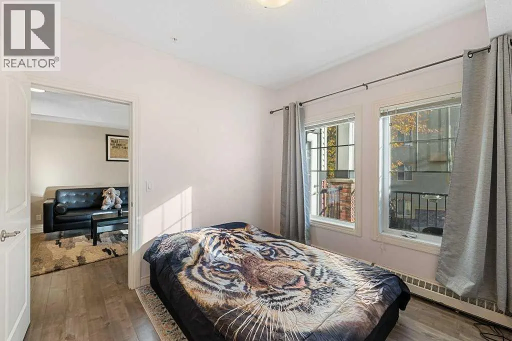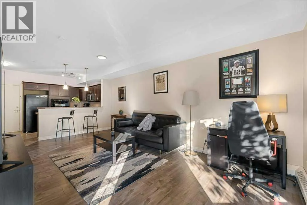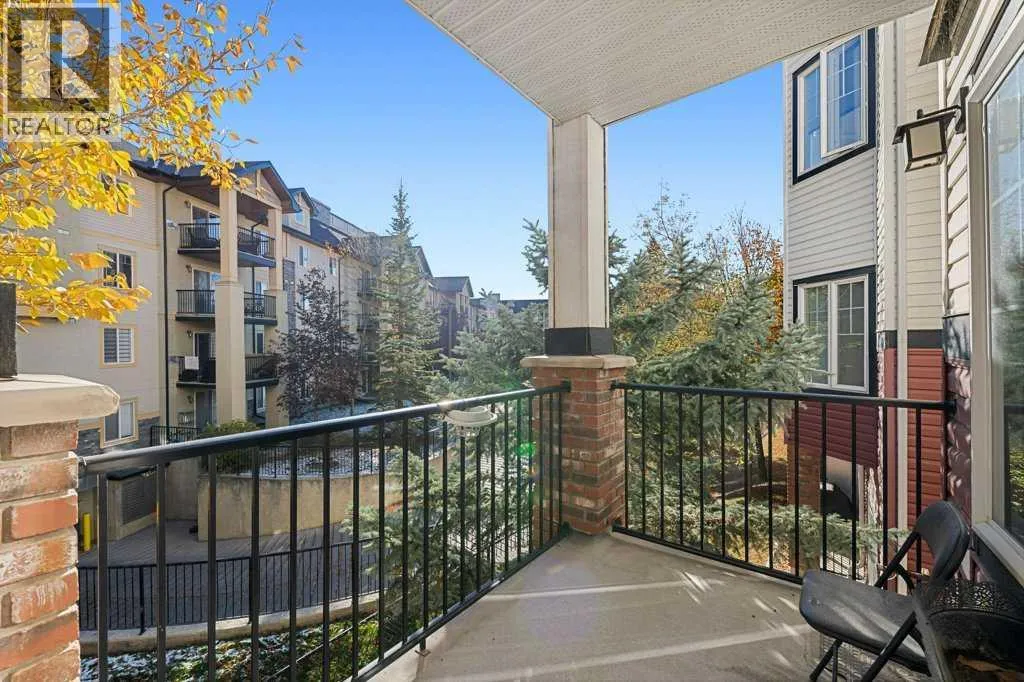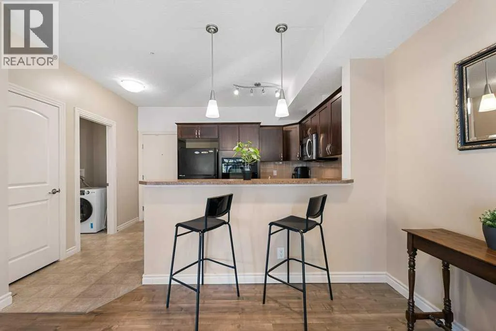 Set on the second floor of Building 60 at Red Haus, this bright, south-facing one-bedroom overlooks a beautiful courtyard and feels instantly welcoming. Laminate flooring flows through the living room and bedroom, while the kitchen shines with maple cabinetry and a raised breakfast bar. The open-concept living/dining area is flooded with natural light and includes a versatile flex nookâperfect for a desk, bookcase, or hutch. The spacious bedroom offers a walk-through closet to a 4-piece bathroom, and the in-suite laundry features a newer washer/dryer. Step out to the private balcony for morning coffee or evening downtime.Practical perks include titled, heated underground parking and a titled storage locker. Condo fees cover heat and water; only electricity and internet are extra. Residents enjoy the on-site Club Haus for fitness and social gatherings.Loved for its European-inspired design, Red Haus sits next to Royal Oak Centre (groceries, cafés, and daily essentials), with quick access to Stoney Trail and an easy bus ride to the Tuscany/Royal Oak LRT. Dont miss this great unit! (id:27476)