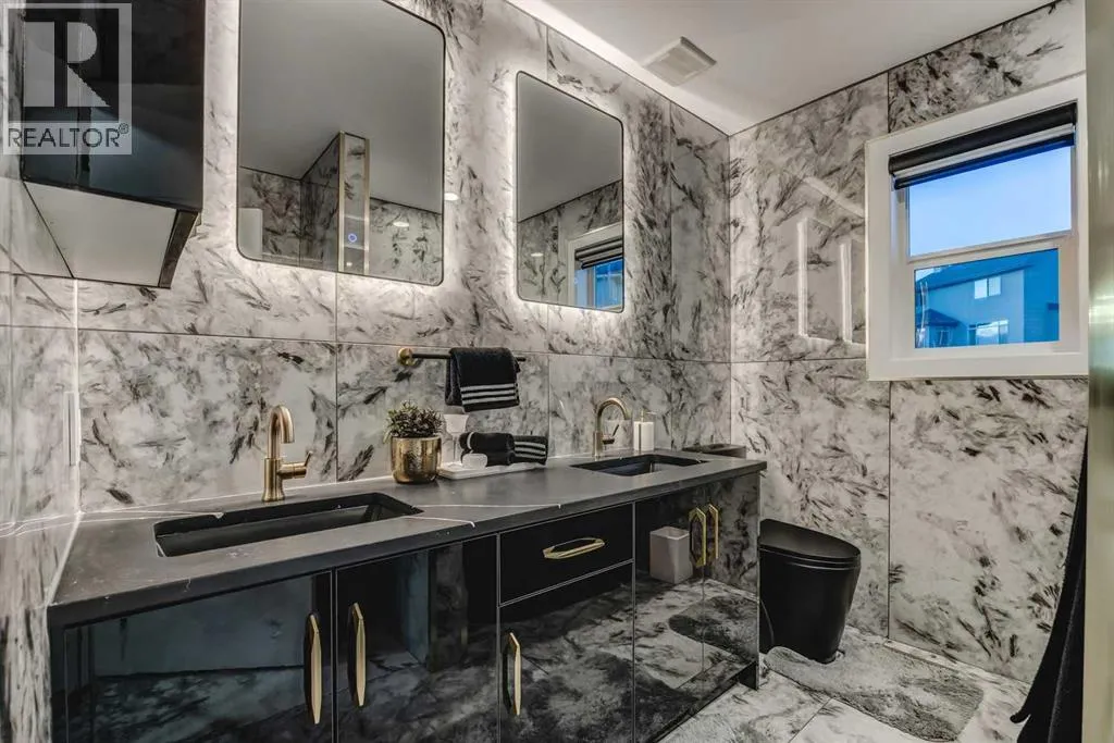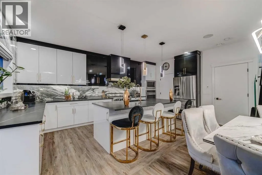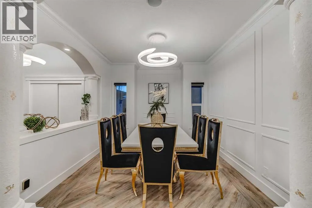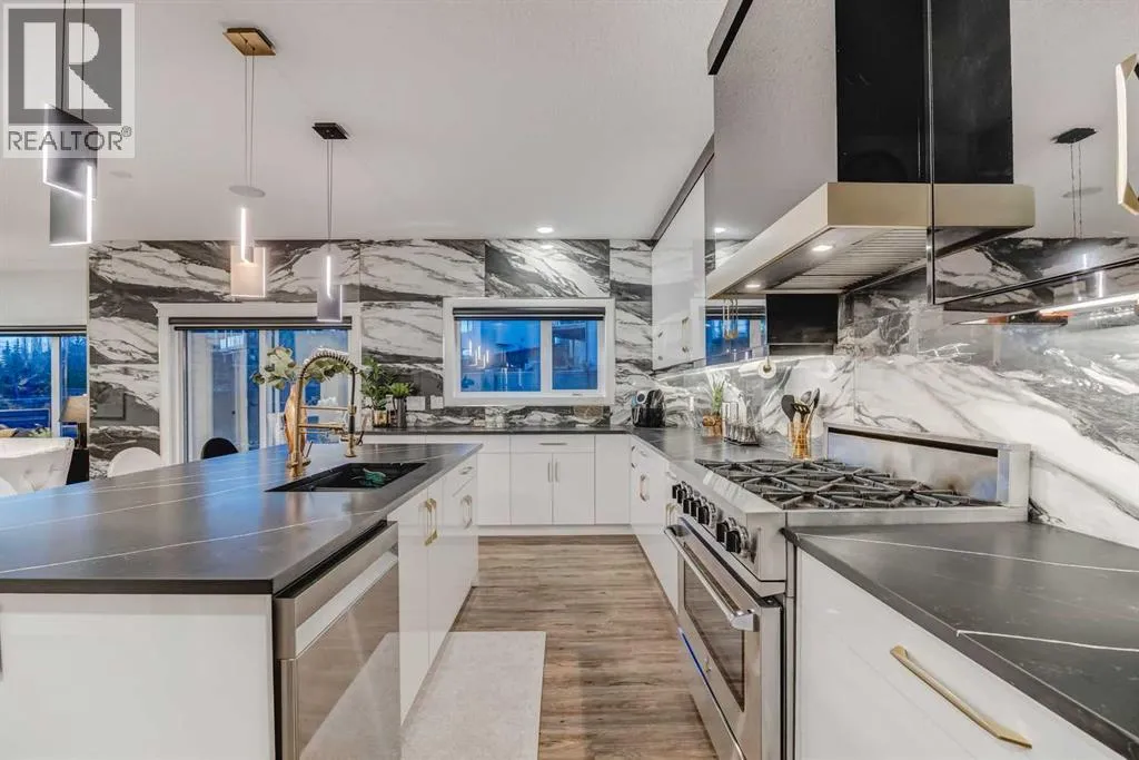 EXQUISITELY REMODELED DESIGNER HOME offering 5 bedrooms, 3.5 baths, and around 4,200 SQ. FT. of developed living space on a RARE 8,500 SQ. FT. PIE LOT in sought-after Rocky Ridge community.A dramatic entry with gold-accent columns and custom wall paneling opens to a stunning living room featuring a floor-to-ceiling slab fireplace, expansive windows, and MOTORIZED BLINDS. The chefâs kitchen boasts CUSTOM CABINETRY, GRANITE COUNTERS, HIGH-END APPLIANCES, and a walk-through pantry leading to the OVERSIZED HEATED GARAGE. The main floor also includes a private office and two elegant dining areas.Upstairs, a vaulted bonus room captures MOUNTAIN VIEWS. The primary suite offers a SPA-INSPIRED ENSUITE and CUSTOM BUILT-IN WALK-IN CLOSET. Three additional bedrooms include built-in beds, including a unique double-bed design.The fully developed basement showcases an IMPRESSIVE SECONDARY SUITE (ILLEGAL) with FULL KITCHEN, spacious living area, luxury bath, and custom walk-in closet â ideal for MULTI-GENERATIONAL LIVING OR INCOME POTENTIAL.Additional features include BUILT-IN SPEAKERS, IN-FLOOR HEATING, A/C, SOLAR-CHARGED SMART BLINDS, stair sensor lighting, central vacuum, SMART TOILETS, new water tank, and water filtration system.Seller willing to negotiate furnishings, offering the opportunity to purchase the home FULLY FURNISHED FOR A MOVE-IN-READY EXPERIENCE.Enjoy EXCLUSIVE ACCESS TO ROCKY RIDGE RANCH AMENITIES â canoeing, kayaking, rowboats, tennis, basketball, pickleball, splash park, playground, clubhouse rental, skating, fitness classes, and community events.A ONE-OF-A-KIND DESIGNER HOME that blends TIMELESS EUROPEAN-STYLE LUXURY with MODERN CONVENIENCE in a premier NW location. (id:27476)