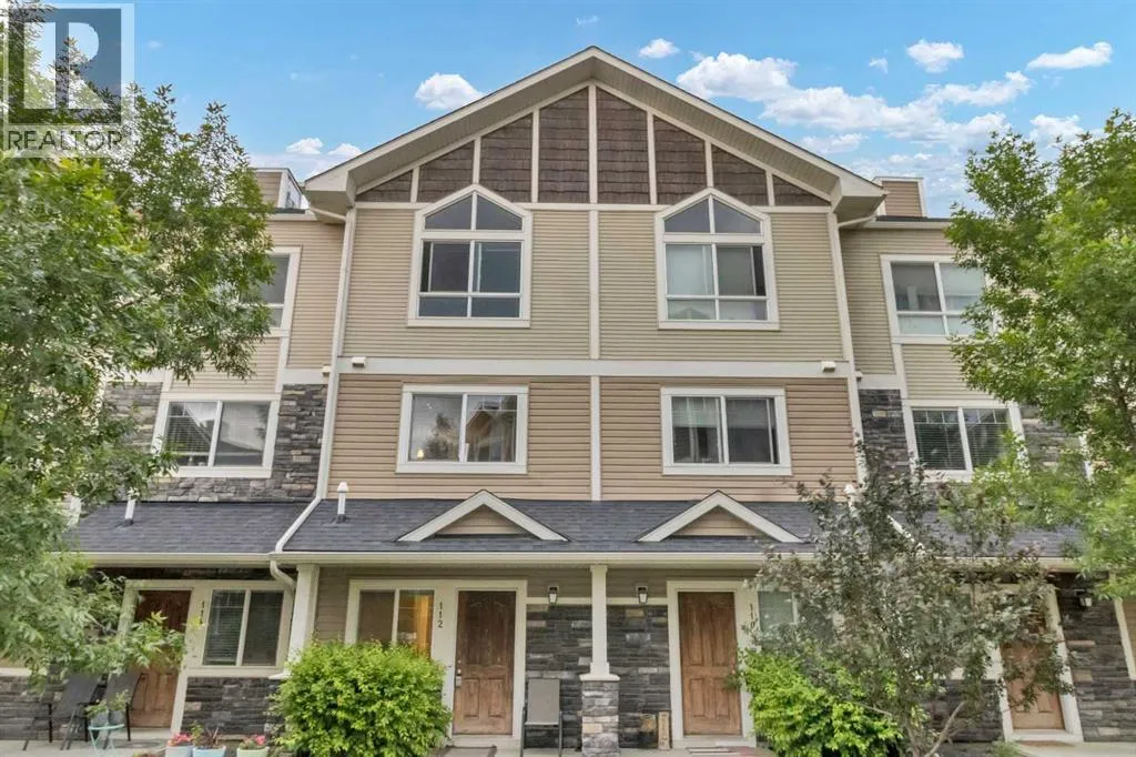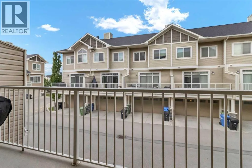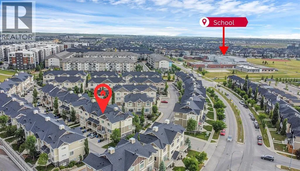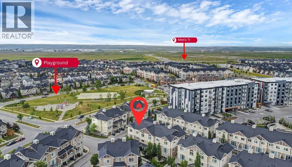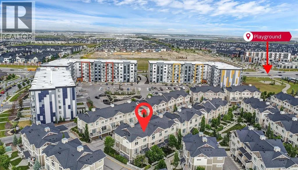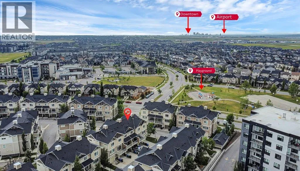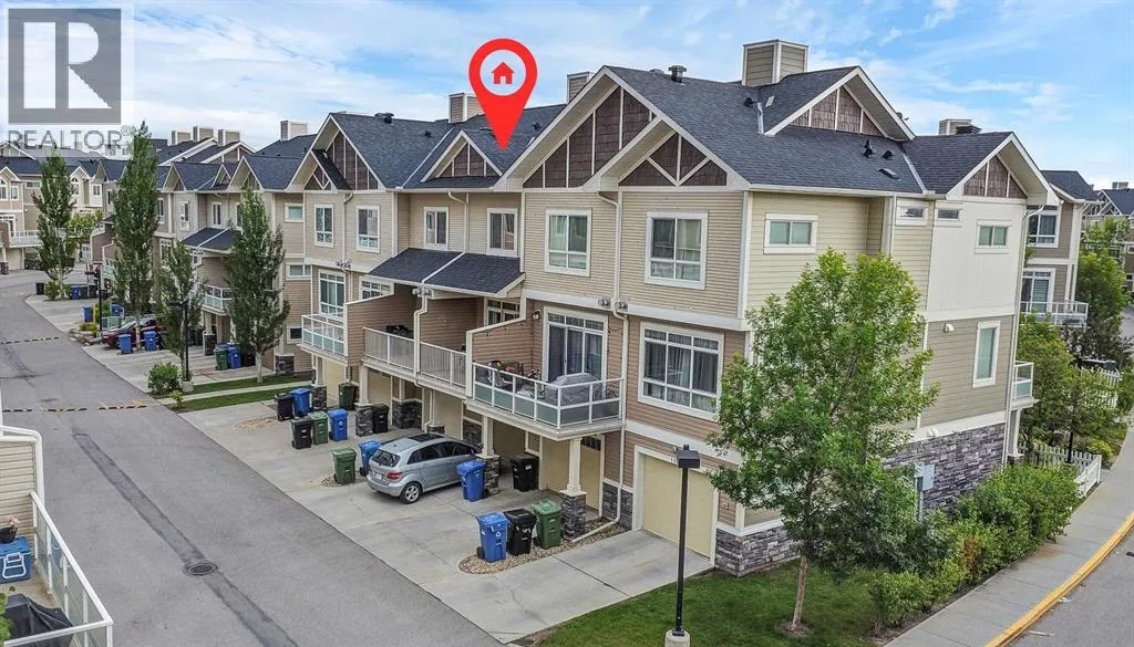 Welcome to this stylish and well-appointed 2-bedroom townhome in the vibrant community of Skyview Ranch. Thoughtfully designed for modern living, this multi-level home offers exceptional comfort, functionality, and convenience, complete with an attached single garage and two private balconies.The bright and open main living area features a spacious layout with large windows, allowing for an abundance of natural light. The contemporary kitchen is equipped with sleek cabinetry, stainless steel appliances, and ample counter space, making meal preparation a pleasure. The adjacent dining and living areas flow seamlessly, perfect for entertaining or everyday living. Step out onto the first of two balconies to enjoy fresh air and sunshineâideal for morning coffee or evening relaxation.Upstairs, you'll find two generous bedrooms, including a primary suite with beautiful transom windows and 4-pc ensuite. A full bathroom, convenient upper-level laundry, and ample closet space complete the upper floor. The entry level offers room for a home office or flex room and direct access to your attached single garage, providing both security and ease in all seasons.Located in a well-maintained complex close to parks, playgrounds, schools, shopping, and transit, this townhome offers a perfect opportunity for first-time buyers, young professionals, or investors. Donât miss your chance to own a beautiful home in the growing and family-friendly community of Skyview Ranch. Book your private viewing today! (id:27476)