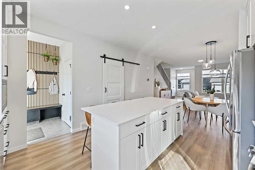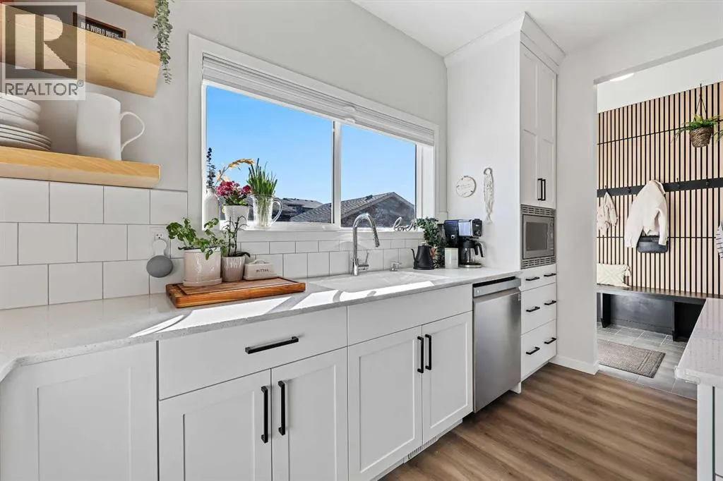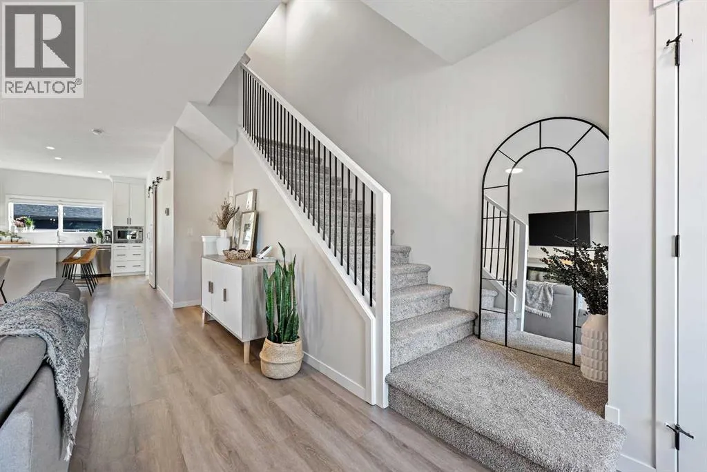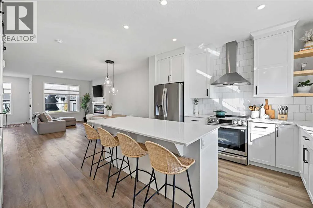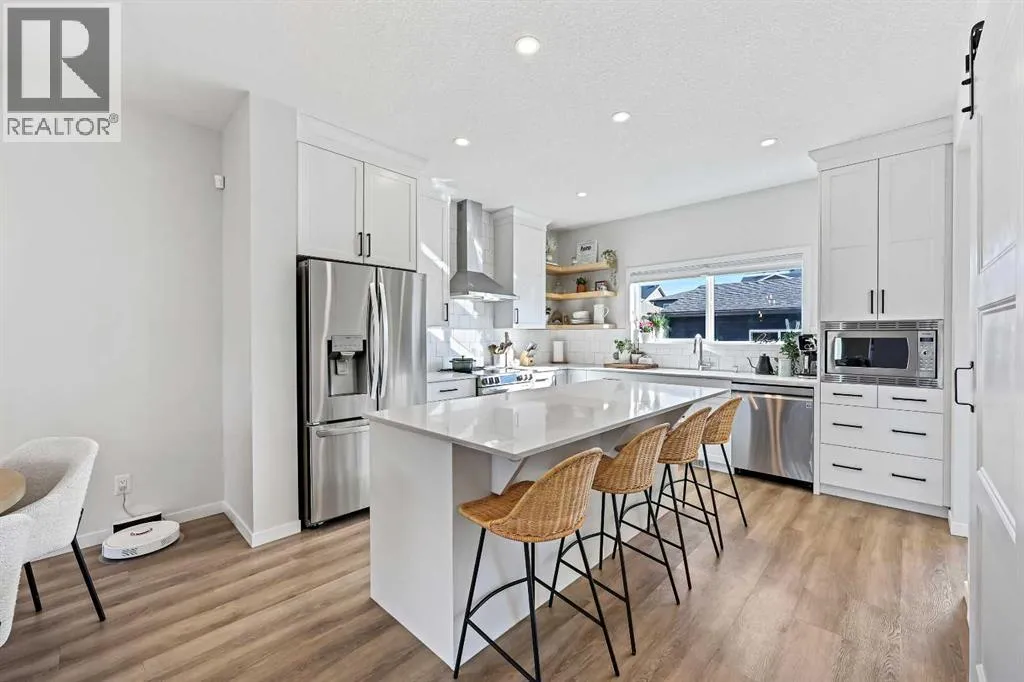 EXCITING NEW BOW RIVER COMMUNITY | TRUCK-SIZED 26' x 22' GARAGE | STEPS TO THE WOLF WILLOW DOG PARK | ORIGINAL OWNER | IMMACULATE CONDITIONAre you ready to live in one of Calgaryâs most exciting new communities? Welcome to Wolf Willow, a vibrant neighbourhood perfectly positioned just steps from the off-leash dog park, scenic ponds, pathways, parks, shopping, golf, and the breathtaking Bow River Valley and Fish Creek Park. With schools, South Health Campus, transit, and major south expressways nearby, this is the ideal blend of convenience and lifestyle.Meticulously maintained by the original owner, this Morrison-built home sits on a sunny, south-facing, oversized lot and features underground front-yard sprinklers, a newer 26â x 22â detached garage with a 9'8" ceiling height, a man door, and is fully insulated and drywalled. Offering over 1,529 sq. ft. of stylish living space, this home features 3 bedrooms, 2.5 bathrooms, and an unspoiled basement ready for your personal touch. Bonus: Dual-tank, non-electrical water softener system.Step inside to a bright, open-concept design highlighted by 9' ceilings, luxury wide-plank flooring, and a cozy electric fireplace. The chef-inspired kitchen is the showpiece of the main floor, showcasing:Ceiling-height cabinetry with classic white shaker doorsQuartz countertops and a full-height white subway-tile backsplashCentral island with seating for four and a white under-mount granite sinkUpgraded stainless steel appliances, including a slide-in range, built-in microwave, and chimney hood fanWalk-in pantry with a custom sliding barn door and stylish recessed lightingA smartly designed rear mud room with wood wall detailing and a half bath leads to the low-maintenance backyard featuring an 18' x 12' concrete paver patio and walkwayâperfect for BBQs and entertaining.Upstairs, the primary retreat offers a spa-like 3-piece ensuite and a walk-in closet. Two additional bedrooms, a full bath, and an upper laundry room complete the family-friendly layout.Additional upgrades include modern LED lighting, upgraded plumbing fixtures, custom feature walls, and a covered front porch that adds welcoming curb appeal accented by stonework.This home is more than just a place to liveâitâs a lifestyle, with nature, community spirit, and urban conveniences right at your doorstep.Donât waitâbook your private showing today with your favorite REALTOR®! (id:27476)
