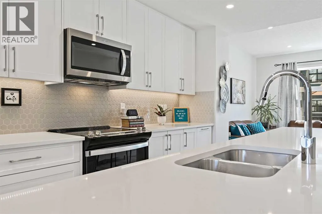 Welcome to this stunning 3-level townhome where modern design meets natural beauty, located steps from Quarry Park and surrounded by over 70,000 sq. ft. of lush community gardens. Offering 3 SPACIOUS BEDROOMS, 2.5 BATHS, and an A DOUBLE ATTACHED HEATED TANDEM GARAGE with rough-in for EV charging, this home blends convenience, style, and sustainability. Step inside and be impressed by the bright, open-concept floor plan with 9-foot ceilings, oversized windows, and a seamless flow from living to dining. The gourmet kitchen showcases quartz countertops, ceiling-height cabinetry, a flush oversized island, sleek stainless steel Whirlpool appliances including a convection oven, and LED under-cabinet lighting for that perfect touch of elegance. The main floor extends outdoors with both a private balconyâideal for your morning coffeeâand a fenced backyard that opens to a walking path. Upstairs, youâll find three inviting bedrooms, including a serene primary suite with a walk-in closet and a beautifully appointed ensuite featuring an over sized walk-in shower with glass sliding doors and gorgeous extended quartz counter top. The added convenience of an in-suite washer and dryer makes daily living effortless. This home was designed with Jaymanâs Core Performance features, including: Solar panels to assist with utilities, coded front door with mobile app and notifications, Smart garage door with mobile app and notifications, Ring camera, Lifebreath HRV giving you fresher, cleaner air and Smart Switches through out that are integrated with Alexa/Google, Luxury Vinyl Plank flooring for durability, triple-pane windows, Ecobee Alexa-enabled thermostat with remote sensor, central air conditioning for your warm Summer months, tankless water heater with circulation pump, Moen fixtures & James Hardie siding. Perfectly maintained by its original owners, the home is accented by a fresh, neutral palette and warm design touches that create an elevated yet cozy atmosphere. Beyond your door , Les Jardins offers unmatched amenities: a full fitness centre, dog park, central gardens, and a truly walkable lifestyle with quick access to Deerfoot and Glenmore Trail. Here, the exterior beauty seamlessly matches the interior charmâlow-maintenance, sustainable, and built for the way you live. Nothing Compares. Welcome home to Les Jardins. (id:27476)