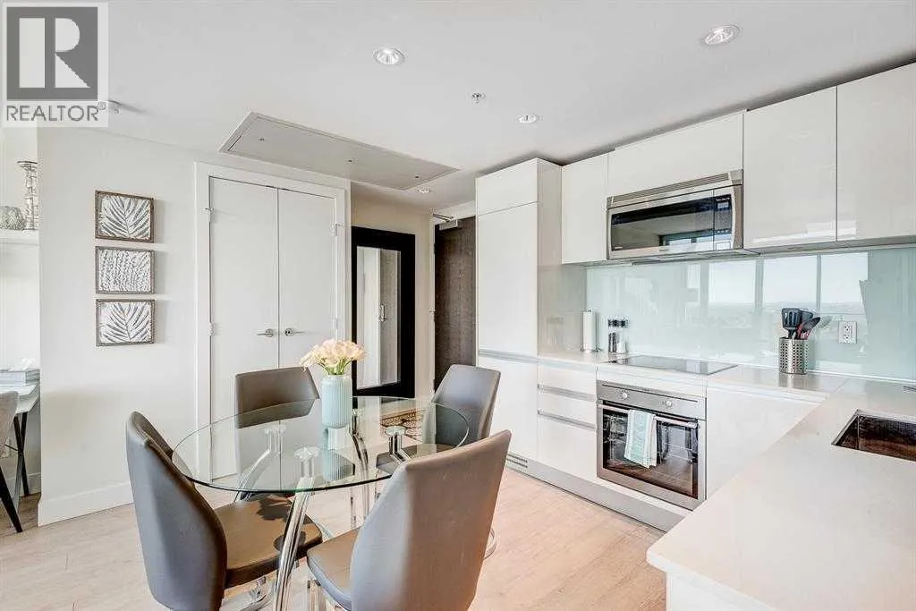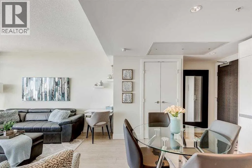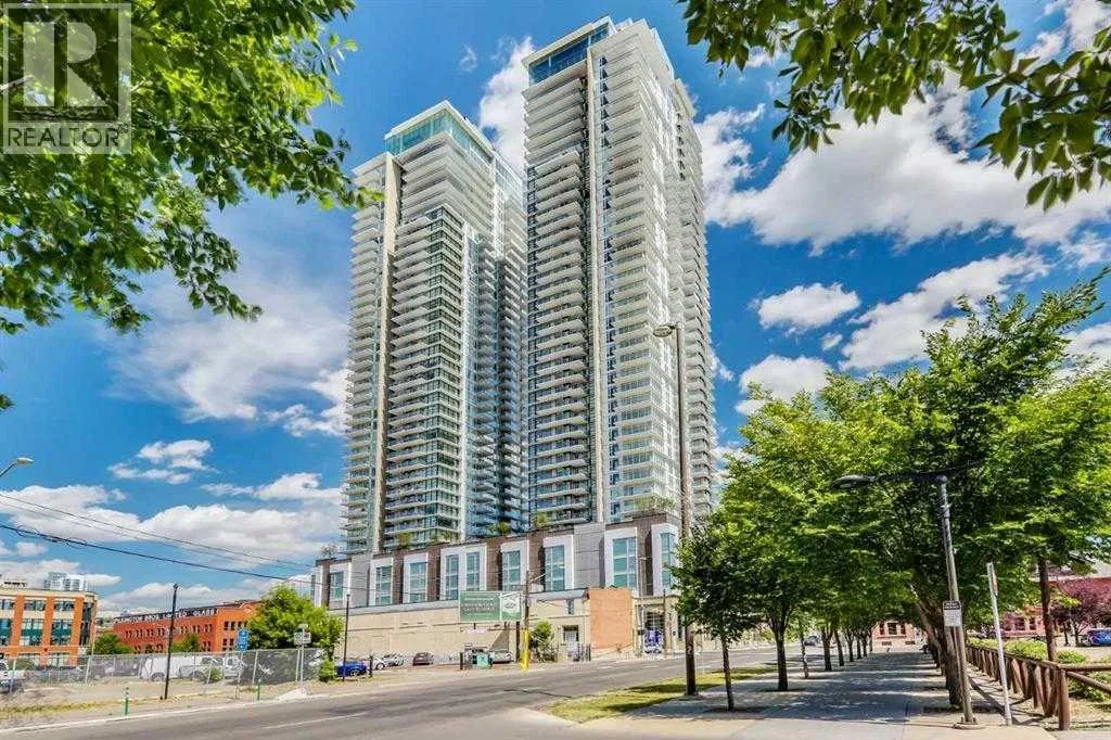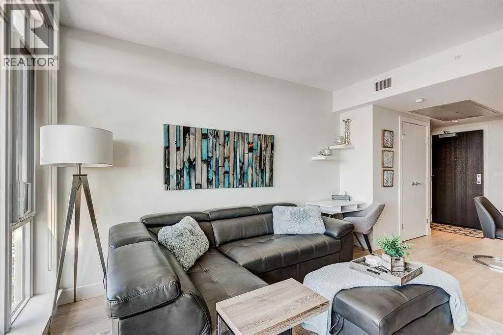 Spectacular South Views in this 1-Bedroom Layout . Luxury Living in The Guardian.Welcome to your sky-high sanctuary in The GuardianâCalgaryâs tallest residential tower. This stunning one-bedroom condo boasts south unobstructed, panoramic views of the Rocky Mountains, Calgary skyline, and breathtaking sunsets through floor-to-ceiling west-facing windows.Offering the largest 1-bedroom floor plan in the building, this unit includes a built-in desk and bookshelf, kitchen island, and a spacious 110 sq ft balconyâperfect for working from home or entertaining guests.The modern kitchen features sleek cabinetry, integrated appliances, and undercabinet lighting, creating a clean, contemporary aesthetic. Wake up to sunrises over the Calgary Tower, and enjoy the comfort of central A/C during summer months.Enjoy five-star amenities including:j24-hour concierge service, Secure titled underground parking. Fully equipped fitness centre, Workshop, Party room, Assigned storage lockerWith a Walk Score of 94, you're steps from everything: Stampede LRT Station, Pixel Park, Sunterra Market, Music Mile & East Village Restaurants, cafés, and bike paths, The Elbow River and Stampede GroundsWhether you're a working professional, an investor, or seeking a vibrant urban lifestyle, this home checks every box. Come book your private showing today! (id:27476)