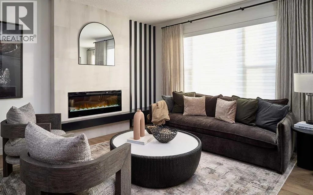 Introducing the Robson 24 by Brookfield Residential - a beautifully designed, fully move-in ready family home showcasing the modern Prairie elevation and situated on a large conventional lot (not zero lot line)! Thoughtfully planned with over 2,200 sq. ft. of developed living space above grade, this home perfectly blends style, function, and flexibility for todayâs family lifestyle. The grand front foyer welcomes you with a sense of space and light, while the open-concept layout ensures seamless flow between the living, dining, and kitchen areas. The main level offers a spacious living area with a design that is perfect for entertaining. The kitchen is complete with an upgraded appliance package including a built-in chimney hood fan, built-in oven & microwave and a gas cooktop. The kitchen overlooks both the living and dining areas with a central fireplace in the great room providing the perfect space for cozy winter nights. A wall of windows across the back of the home allows for natural light from the west-facing backyard to flood the space with sunshine all day long. The main level is complete with a bedroom and full bathroom - perfect for a guest room, multi-generational living or easily can be converted to a home office space. At the heart of the home, a striking spiral staircase becomes an architectural centerpiece - a rare design feature that elevates this home beyond the ordinary. Upstairs, the curved staircase leads to a central bonus room that smartly separates the primary suite from the secondary bedrooms, offering privacy and a natural flow to the upper level. The primary retreat features a spa-inspired 5-piece ensuite with a private water closet, dual sinks, a soaker tub, and a walk-in shower, along with an expansive walk-in closet. Two additional bedrooms, a full bathroom, and a convenient upper-floor laundry room complete the second level. The undeveloped basement offers a private side entrance and awaits your creative vision - perfect for a future le gal suite (subject to municipal approval), home gym, or media space with 9' foundation walls making development that much easier for a brighter and more open space. Laundry rough-ins with sink hookups are already in place for added convenience. Outside, the west-facing backyard is ideal for soaking up the sun and provides the perfect outdoor retreat while keeping the main living areas bright year-round. Situated on a large conventional lot, this home has a traditional side yard and offers an incredible outdoor living space. Backed by Brookfieldâs comprehensive builder warranty and the Alberta New Home Warranty Program, this brand-new home allows you to purchase with complete confidence. With its timeless finishes, distinctive architectural details, and move-in-ready convenience, the Robson 24 is truly the perfect place to call home. (id:27476)