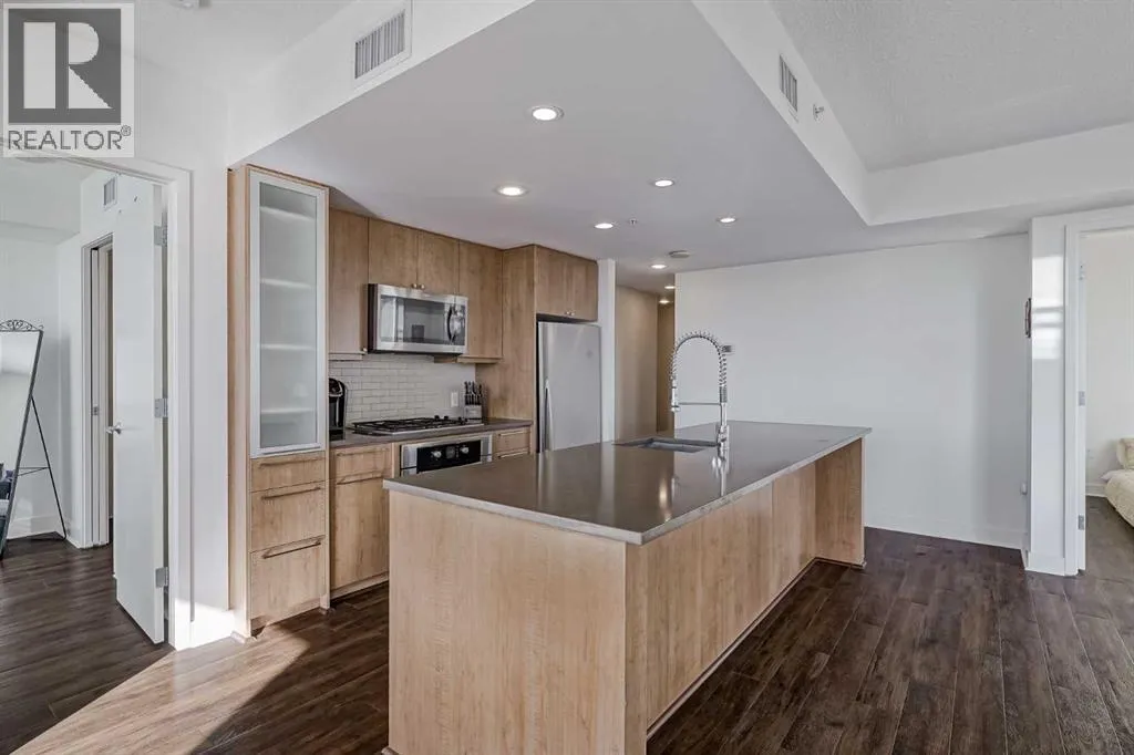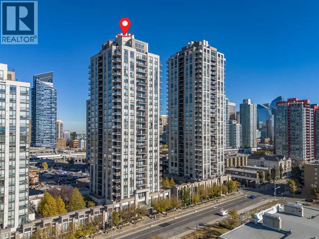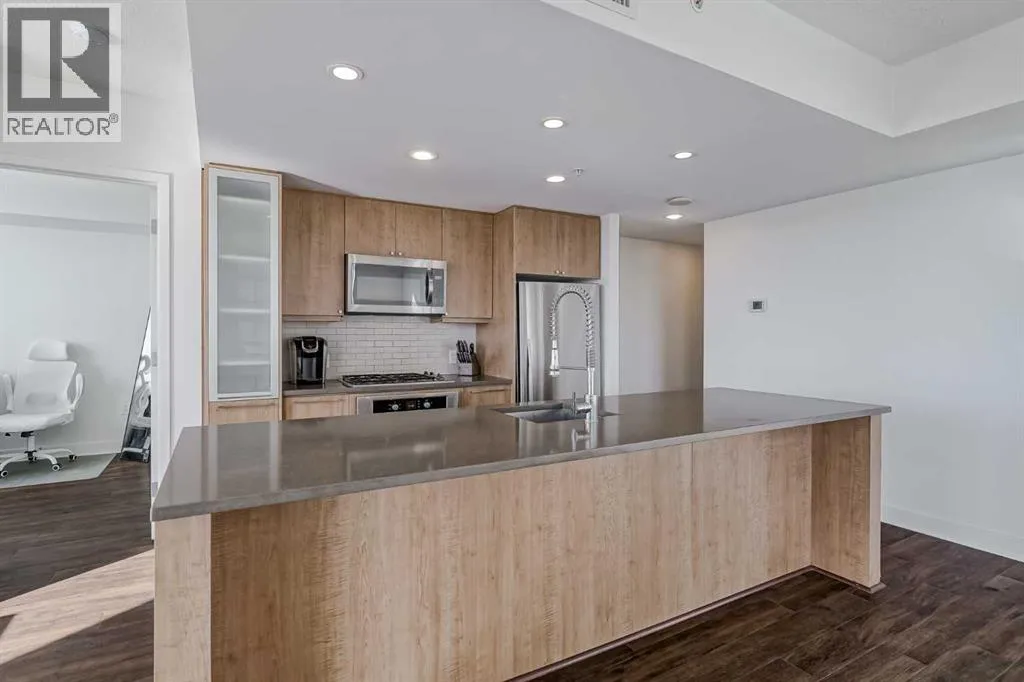 Experience sophisticated, high-rise living in this bright and expansive 2-bedroom plus den corner unit, perfectly situated in the highly sought-after NOVA building.This stylish and contemporary condo features an open-concept design accentuated by extensive, floor-to-ceiling windows that flood the space with natural light and offer outstanding expansive city and mountain views. Enjoy your morning coffee or wind down in the evening on the large, southeast-facing corner balcony.The gourmet kitchen is a chef's delight, boasting sleek quartz countertops, a Bosch gas stove, a Fisher & Paykel refrigerator, and under-cabinet lighting.The south-facing Primary Bedroom serves as a private retreat, complete with a walk-through closet and a luxurious five-piece ensuite bathroom. The second full bathroom features a walk-in shower and is conveniently designed to function as a second ensuite, offering maximum functionality.This prime property includes a titled underground parking stall within the secure parkade, which also provides ample visitor parking.NOVA provides exceptional building amenities, including a stylish lounge, a fully equipped gym, a rentable guest suite, beautiful outdoor gardens, and the luxury of a full-time concierge. With a quick walk to the downtown Co-op, shops, services, and diverse restaurants, this is an incredible opportunity to embrace convenient downtown living. Don't miss outâschedule your viewing today! (id:27476)