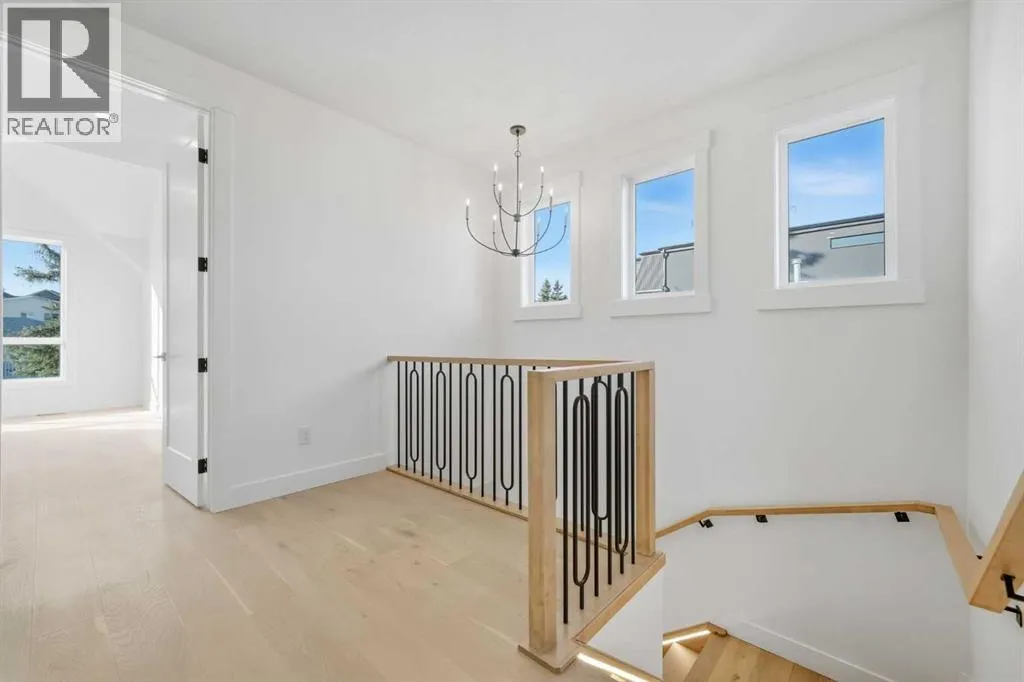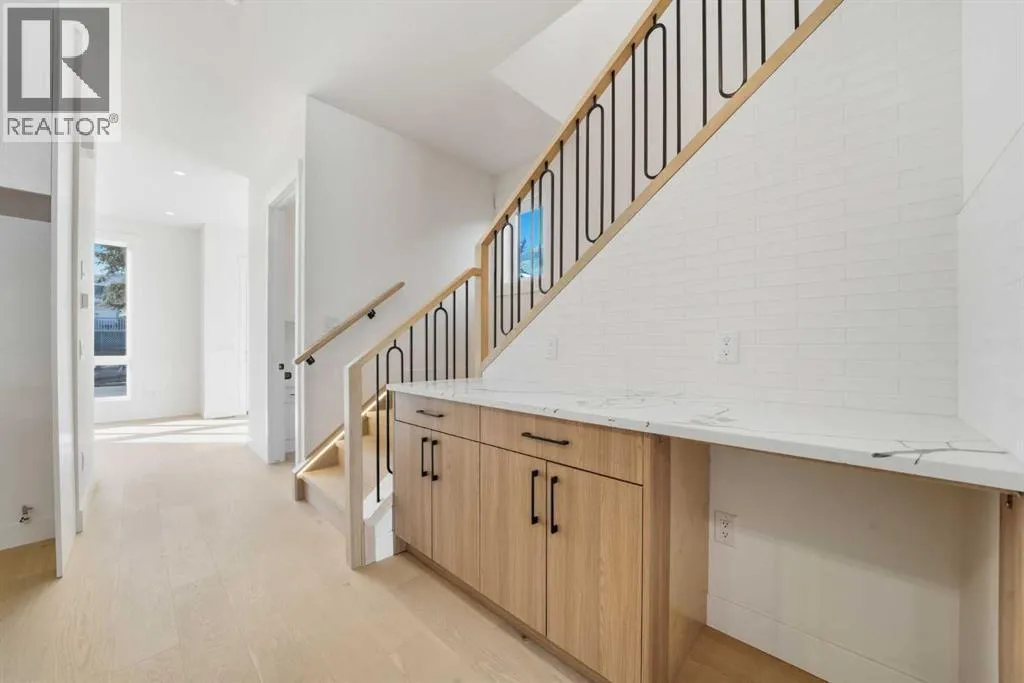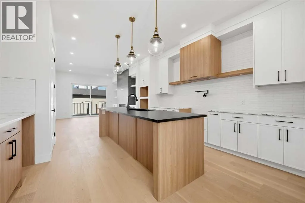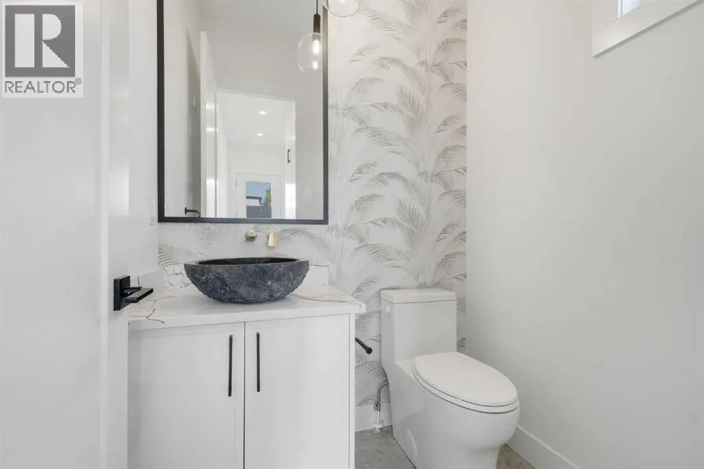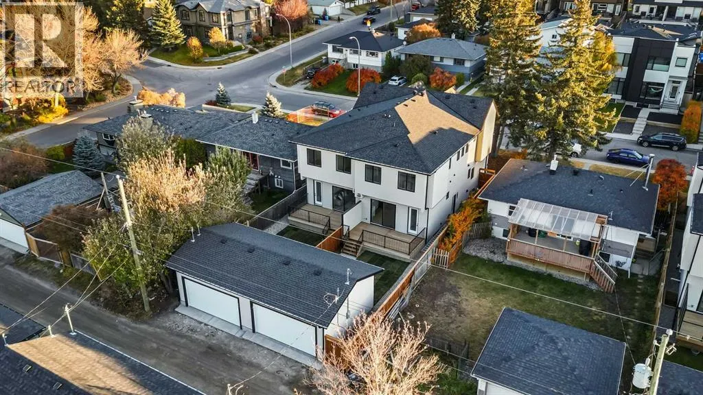 Gorgeous new 3 bedroom home built by Royal Design Homes on a quiet cul-de-sac in sought after Richmond, offering over 2000 sq ft of living space plus a self contained legal 2 bedroom basement suite. The bright & airy main level presents engineered hardwood floors, high ceilings & stylish light fixtures, showcasing the front dining area with beautiful feature wall & ample space to host family & friends. Create culinary masterpieces in the kitchen thatâs tastefully finished with contrasting quartz counter tops, large island/eating bar, excellent appliance package & plenty of storage space, including a pantry & lovely built-in banquette. The living room is anchored by a floor to ceiling feature fireplace & built-ins. A cozy office space is tucked away just off the kitchen, perfect for a home office setup. Completing the main level is a convenient mudroom with bench, hooks & storage & a 2 piece powder room with wall paper accent & raised stone sink. Ascend the lighted staircase to the second level that hosts a loft/bonus room, 2 bedrooms, 4 piece bath & laundry room with sink & storage. The primary bedroom with vaulted ceiling boasts an outstanding walk-in closet & posh 5 piece ensuite with dual sinks, make-up vanity, relaxing freestanding soaker tub & rejuvenating steam shower. The fully contained legal basement suite features engineered hardwood floors, a large living/dining area with tons of built-in storage, kitchen with island/eating bar, quartz counter tops & stainless steel appliances. Two bedrooms, a 4 piece bath & dedicated laundry facilities complete the legal basement suite. Other notable features include roughed in air conditioning & 2 furnaces. Outside, enjoy the beautifully landscaped front garden & back yard with deck & access to a double detached garage. The location is incredibly convenient, close to vibrant Marda Loop, excellent schools, parks, public transit & easy access to 26th Avenue & Crowchild Trail. (id:27476)
