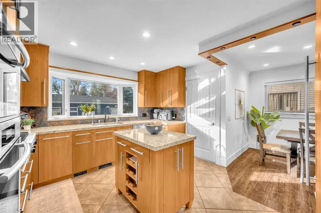 Welcome to this exquisitely renovated bungalow situated in the prestigious Willow Park community, conveniently located near the Willow Park Golf Club. This property encompasses an expansive lot with a west-facing backyard, featuring zero-maintenance landscaping that includes stamped concrete walkways, an aggregated stone front patio, artificial turf, and custom decorative concrete curbing, valued at $100,000.The home boasts a dream kitchen equipped with custom-built cabinetry, under-cabinet lighting, top-of-the-line Miele stainless steel appliances, including a steam oven and convection oven, a Viking gas range with a stainless steel range hood, a Sub-Zero refrigerator, a dishwasher, a garbage disposal, an instant hot water tap, a purified water tap, granite countertops, a pantry, an island, and heated tile flooring, all valued at over $70,000. The main floor is complemented by LED recessed lighting, upgraded interior doors, beautiful flooring throughout, and a four-piece bathroom featuring a jetted soaker tub/shower combination and a low-flush toilet.The home includes two bedrooms and a master retreat with a vaulted ceiling in the addition, which features a large built-in wall closet and a private ensuite with a spacious tiled shower, granite countertops, and a low-flush toilet. The main floor also offers a large living room, dining room, and ample closet space. Relax by the gas fireplace in the basement rec room, which includes a wet bar area. A large fourth bedroom with a spacious built-in wall closet and another beautiful four-piece bathroom with a jetted soaker tub large enough for two, a low-flush toilet, heated tile floors, and an oversized tiled shower complete the basement. The basement offers versatile options, suitable for additional living space or as a reconfigurable basement suite(illegal), with a kitchen area already in place, including a refrigerator, cabinets, and sink.Recent upgrades include central air conditioning (2019), a high-efficiency furnace (2016), a 75-gallon hot water tank (2024), a water softener (2025), a roof-shingles (2016), new blown-in attic insulation (2016), upgraded front and rear exterior doors , LED lighting throughout the home and garage, redone and painted stucco (2016), triple-glazed windows on the main level, double-glazed basement windows, and professional window tinting installed in 2020, providing privacy and reducing heat in the summer ($5,000 value).The property also includes an oversized double-car garage (25âx28â) built in 2002, accommodating three vehicles, featuring epoxy flooring (2016), full insulation, heating with 220 wiring, and two additional outdoor paved parking stalls with paved back alley access, along with a matching custom-built, oversized shed in the backyard. A must view property. (id:27476)