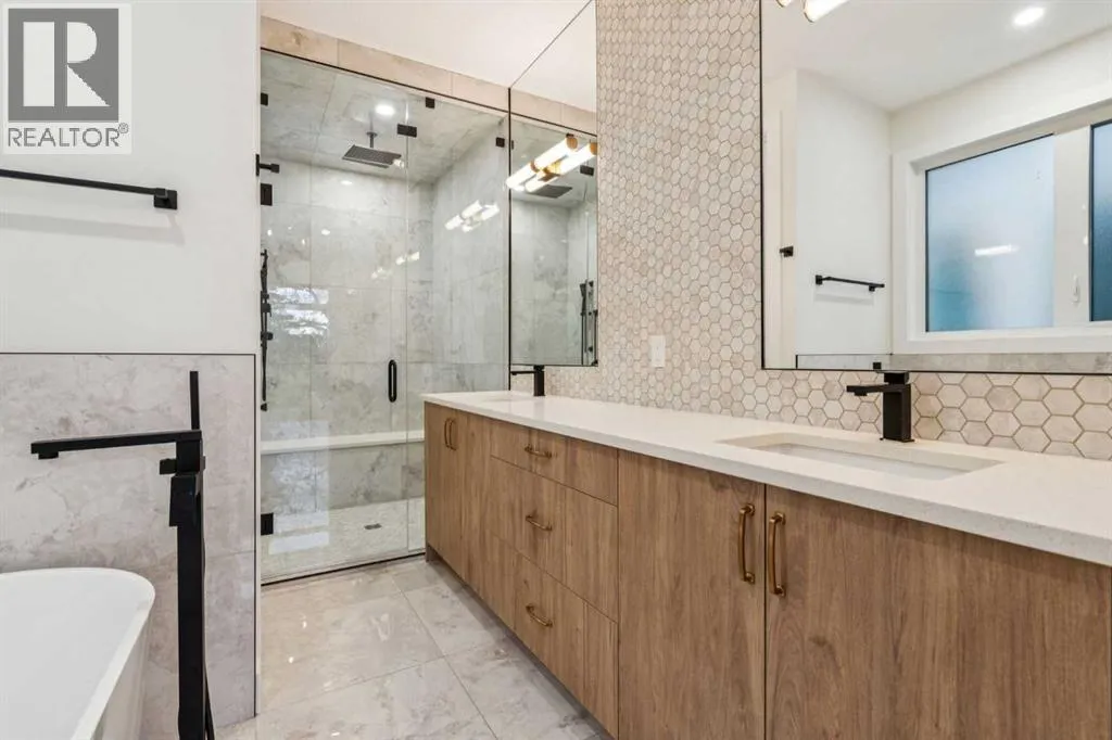 Modern Luxury Meets Elevated Living in Spruce Cliff. Discover this exceptional new build in the highly sought-after community of Spruce Cliff, where timeless design and modern elegance converge. This stunning 4-bedroom, 5-bathroom home showcases superior craftsmanship, premium finishes, and thoughtful functionality throughout. An impressive main level welcomes you with white oak wide-plank flooring, abundant natural light, and sophisticated designer lighting. The open concept living area features a sleek gas fireplace set within a striking tile wall, creating a perfect blend of warmth and contemporary style. The chef-inspired kitchen boasts high-end appliances, a massive center island, full-height custom cabinetry, and refined detailing ideal for both entertaining and everyday living.Upstairs, the primary suite is a serene retreat complete with a spa-like 6-piece ensuite featuring a freestanding soaker tub, multi-jet rain shower, dual vanities, and heated floors. The custom walk-in closet offers floor-to-ceiling built-ins, providing both beauty and function. Two additional bedrooms each feature walk-in closets, with one offering its own private ensuite. A convenient upper-level laundry room with a sink adds to the homeâs thoughtful design. The fully developed lower level includes a legal one-bedroom suite with a separate entrance â ideal for extended family, guests, or potential rental income. The suite is complete with a full kitchen, 4-piece bathroom, laundry area, and a spacious living room. Outdoors, enjoy a west-facing backyard with a deck and green space, perfect for relaxing or entertaining, plus a double detached garage with back-lane access. Situated in the heart of Spruce Cliff, this location offers the best of both worlds â urban convenience and natural beauty. Minutes from shopping, restaurants, golf, and the Douglas Fir Trail system, this home is the perfect blend of modern luxury and everyday comfort. (id:27476)