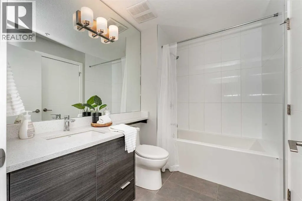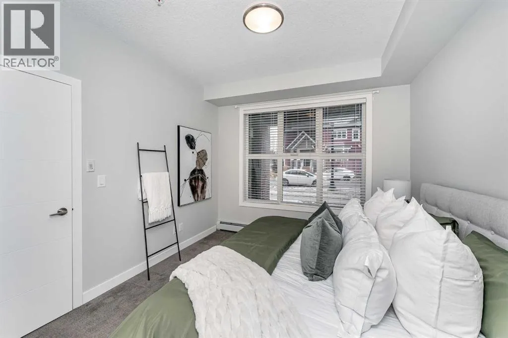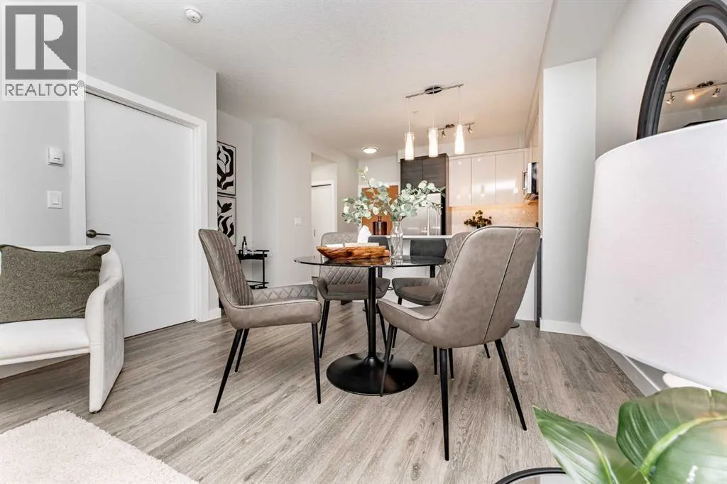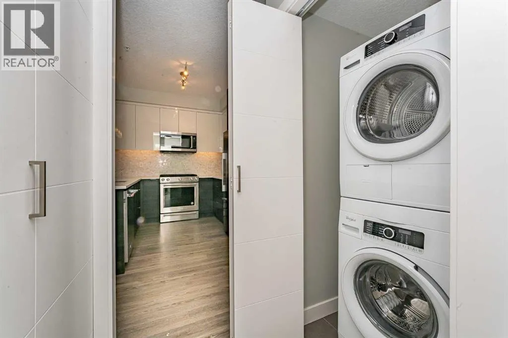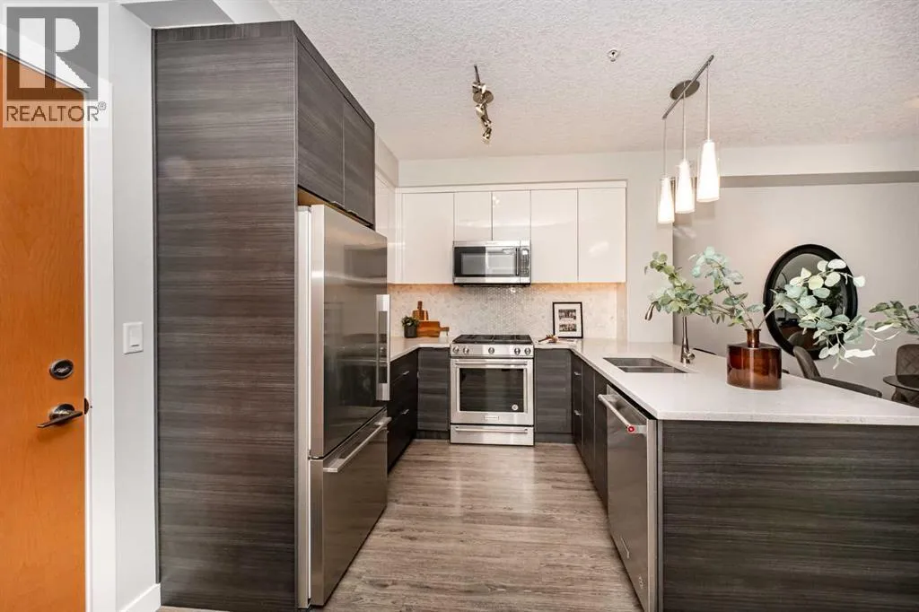 BUILDER SALE! Looking for upgrades in a spec unit? This might be the one. Welcome to the Axess building, located in the heart of the historic Currie Barracks community! This beautifully upgraded 1-bedroom unit features soaring 9-foot ceilings. Step inside to find luxury vinyl plank flooring and an abundance of natural light streaming through oversized windows. The stylish kitchen showcases a modern blend of crisp white and dark cabinetry, upgraded stainless steel appliances including a gas stove, quartz countertops, and a designer tile backsplash. An open counter connects seamlessly to the dining area, perfect for entertaining. The spacious living room leads to a top-floor balcony with a gas BBQ line and unobstructed southern viewsâthe perfect place to relax and enjoy breathtaking sunsets. The generously sized primary bedroom features a walk-through closet with direct access to the elegant 4-piece bathroom, complete with tile flooring, quartz countertops, and a soaker tub. Just off the kitchen is a versatile nookâideal for extra storage or a small home office setup. Additional highlights include in-suite laundry, underground parking with a car wash, and a private storage locker located directly in front of your parking stall. All this in a prime locationâsteps from Mount Royal University, walking paths, parks, shopping, and with easy access via Crowchild Trail to Marda Loop and downtown Calgary. A truly exceptional opportunity to own in one of Calgaryâs most desirable communities. (id:27476)