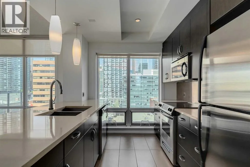 Experience elevated inner-city living at Castello, where luxury meets convenience in this 2 bedroom, 2 bathroom condo featuring TWO TITLED PARKING STALLS, side-by-side & just steps from the elevator. With only a handful of condos in this price range offering this advantage, this residence stands out as an exceptional find! Spanning 1,130 sq ft, the sophisticated corner layout is framed by floor-to-ceiling windows capturing sweeping sunset, mountain and city skyline views. An expansive wraparound patio serves as an entertainerâs dream, ideal for summer barbeques, morning coffee or evening cocktails under Calgaryâs glowing skies. Sleek open-concept design invites effortless entertaining, anchored by a chefâs kitchen with quartz countertops, stainless steel appliances, a wine fridge and a modern island that doubles as a social hub. Adjoining dining and living spaces are bathed in natural light, creating an inviting backdrop for gatherings or quiet nights in. Retreat to a serene primary suite with a generous walk-in closet and a spa-inspired ensuite with dual sinks, while the second bedroom offers ideal flexibility for guests, roommates or a home office with its own access to a full bathroom. A built-in desk area adds functionality for those working from home, while central A/C & Hunter Douglas window coverings ensure year-round comfort. In-suite laundry and titled storage add everyday practicality. Castello is one of Calgaryâs premier executive buildings, offering residents a fitness centre, guest suite, car wash and an impressive modern lobby. Perfectly located in the heart of the Beltline, youâre steps from 17th Ave and 4th Street where award-winning restaurants, boutique shops and vibrant nightlife await. Walk or bike downtown, explore nearby river pathways or unwind on your private patio as the sun sets over the mountains. Luxury urban living at its finest, enhanced by the rare convenience of two premium parking stalls! (id:27476)