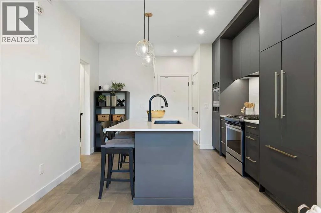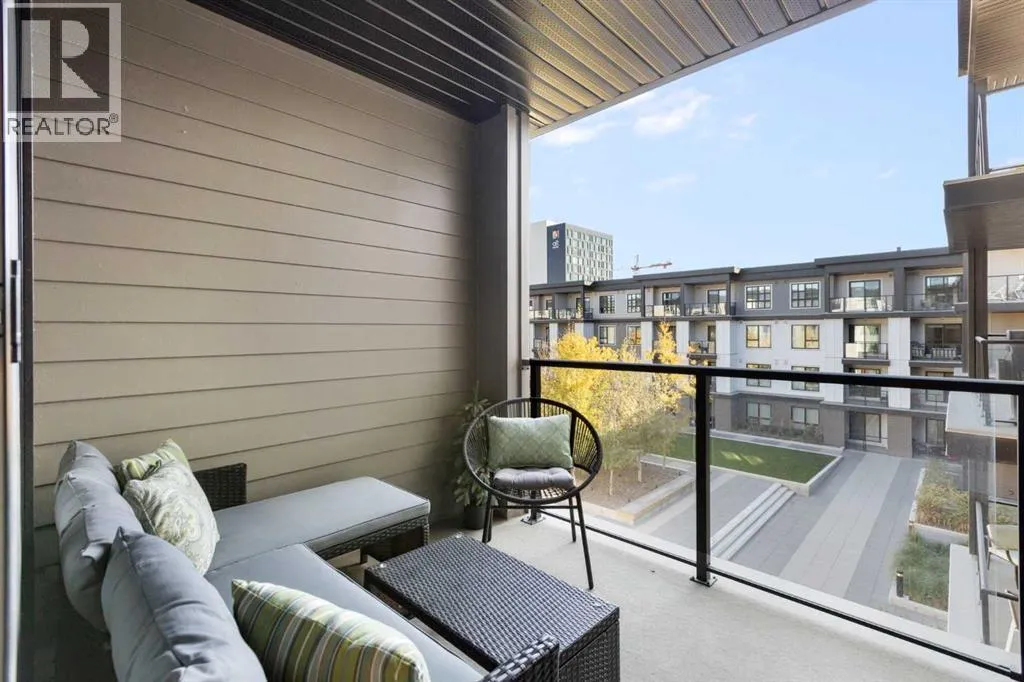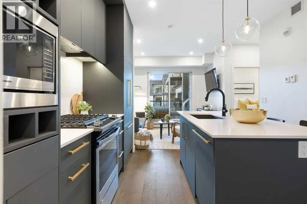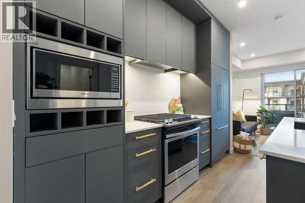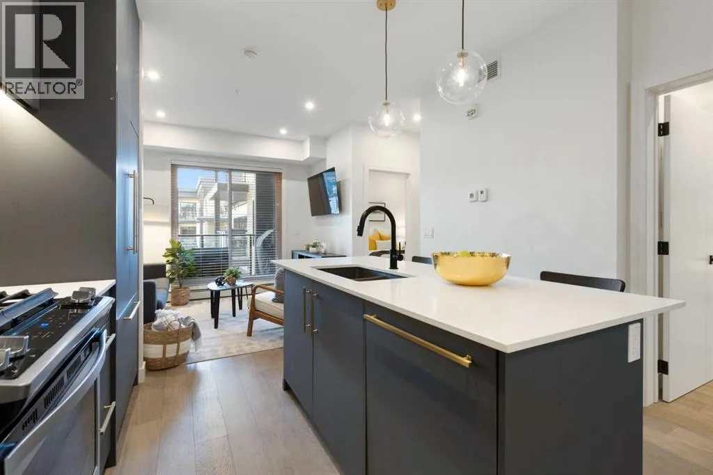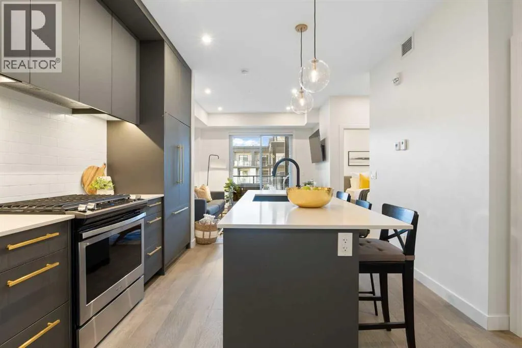 Elevate your lifestyle at Esquireâs Unit 325âwhere design, comfort, and connection define luxury in Calgaryâs University District. DESIGN - Built by award-winning Truman Homes, Calgaryâs builder of choice, this light-filled third-level unit offers 640 sq. ft. of open-concept living. Every element reflects modern sophistication, from the 9-foot ceilings and oak hardwood flooring to the premium fixtures and warm brass accents. The kitchen blends luxury and function with sleek charcoal cabinetry, soft-close drawers, an integrated wine rack, and elegant glass pendant lighting, while the white subway tile backsplash and under-cabinet lighting showcase the stainless steel microwave and gas range, and panelled appliances. Anchoring the heart of the home is the large white quartz island with seating for three, ideal for staying engaged for casual meals or hosting guests. COMFORT - Sun-drenched and airy floor plan with south-facing windows flows seamlessly to a covered balcony overlooking serene courtyard views. With 2 bedrooms, a stylish 4-piece bathroom, in-suite laundry, and LEED Platinum certification, this home offers a polished, comfortable experience. CONNECTION - Living up to its âLive Betterâ slogan, residents enjoy exclusive on-site amenities: 24-hour gym, workshop, pet spa, and bike room. Unique to this unit are titled heated underground parking and same-floor storage (no parkade trips), plus visitor parking in this pet-friendly building. Unmatched access to shop, sip, or get social at your favourite local cafes, shops, grocers, and restaurants, with an off-leash park and transit nearby. Quick drive to downtown and the mountains, and just a short walk to Alberta Childrenâs Hospital, Foothills Medical Centre, and University of Calgary, this home offers tremendous value in one of Calgaryâs most desirable neighbourhoods. Perfect for first-time buyers, investors, downsizers, students, or healthcare professionals seeking unmatched convenience and community. Check out the online virtual tour, schedule your private showing today, and donât miss the chance to own this exquisite Esquire condo Unit 325 in University District! (id:27476)